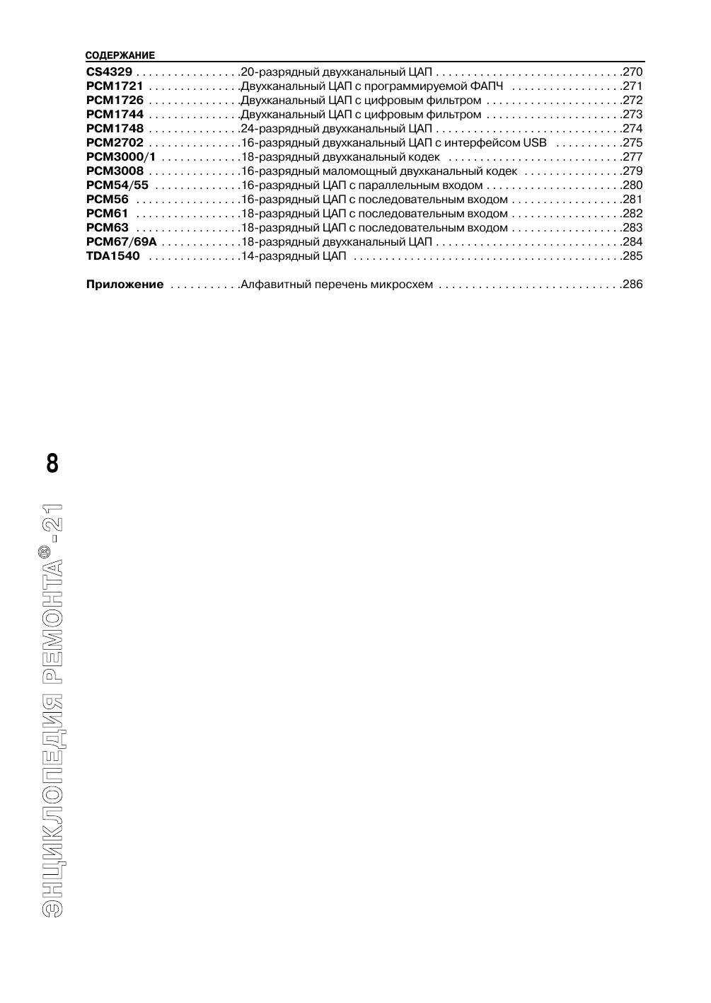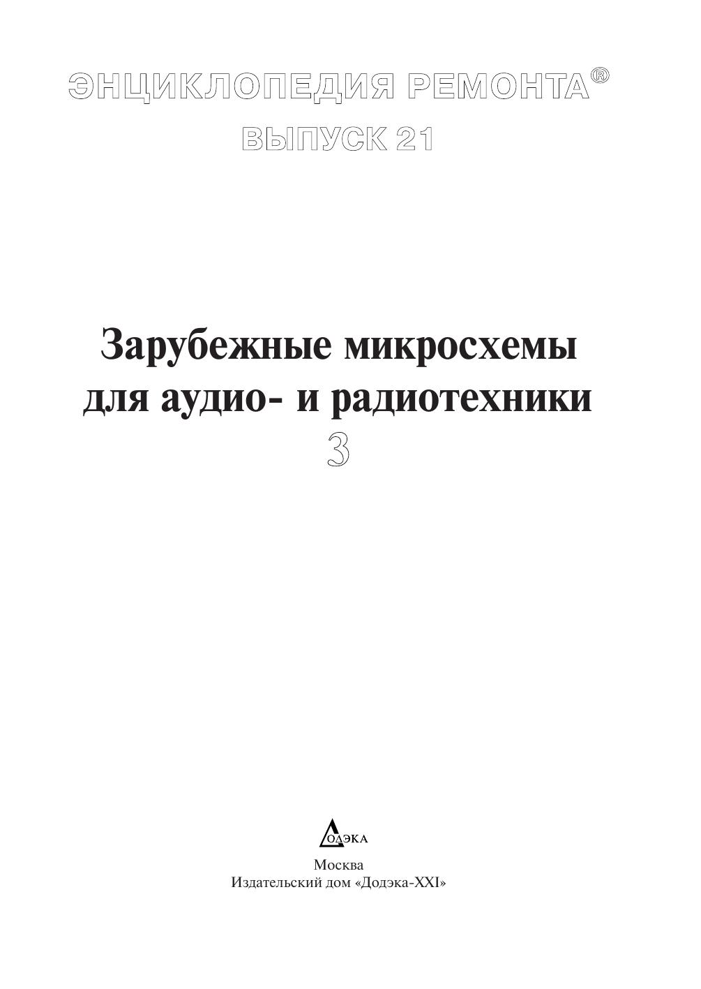 Данное издание выходит в серии «Энциклопедия ремонта» и является четвертым выпуском, посвященным зарубежным интегральным схемам для аудио- и радиотехники. В справочнике представлены основные особенности, цоколевки, структурные схемы и типовые схемы применения свыше 300 типов микросхем, усилителей низкой частоты, усилителей записи/воспроизведения, эквалайзеров, регуляторов тембра, УПЧ, приемников АМ и ЧМ сигналов и пр., применяемых в бытовых радиоприемниках, магнитофонах и магнитолах. В книге рассмотрены интегральные схемы следующих фирм: «Analog Devices», «Burr Brown», «Harris», «Hitachi», «Holtek», «Information Storage Devises», «Mitsubishi», «Motorola», «Mullard», «NEC», «National Semiconductor», «OKI», «Panasonic», «Philips», «Rohm», «Samsung», «Sanyo», «SGS Thomson», «Sharp», «Siemens», «Sony», «Temic». Для радиолюбителей, самостоятельно занимающихся ремонтом радиоаппаратуры, и работников сервисных служб по ремонту бытовой аппаратуры.