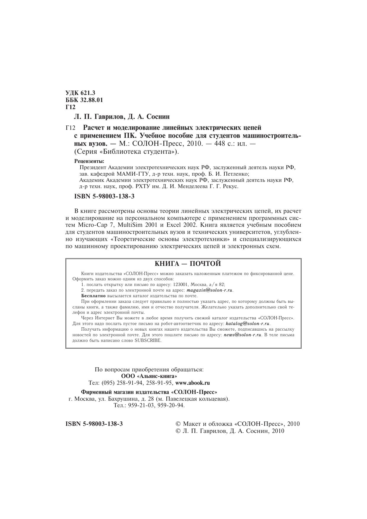 В книге рассмотрены основы теории линейных электрических цепей, их расчет и моделирование на персональном компьютере с применением программных систем Micro-Cap 7, MultiSim 2001 и Excel 2002. Книга является учебным пособием для студентов машиностроительных вузов и технических университетов, углубленно изучающих «Теоретические основы электротехники» и специализирующихся по машинному проектированию электрических цепей и электронных схем.