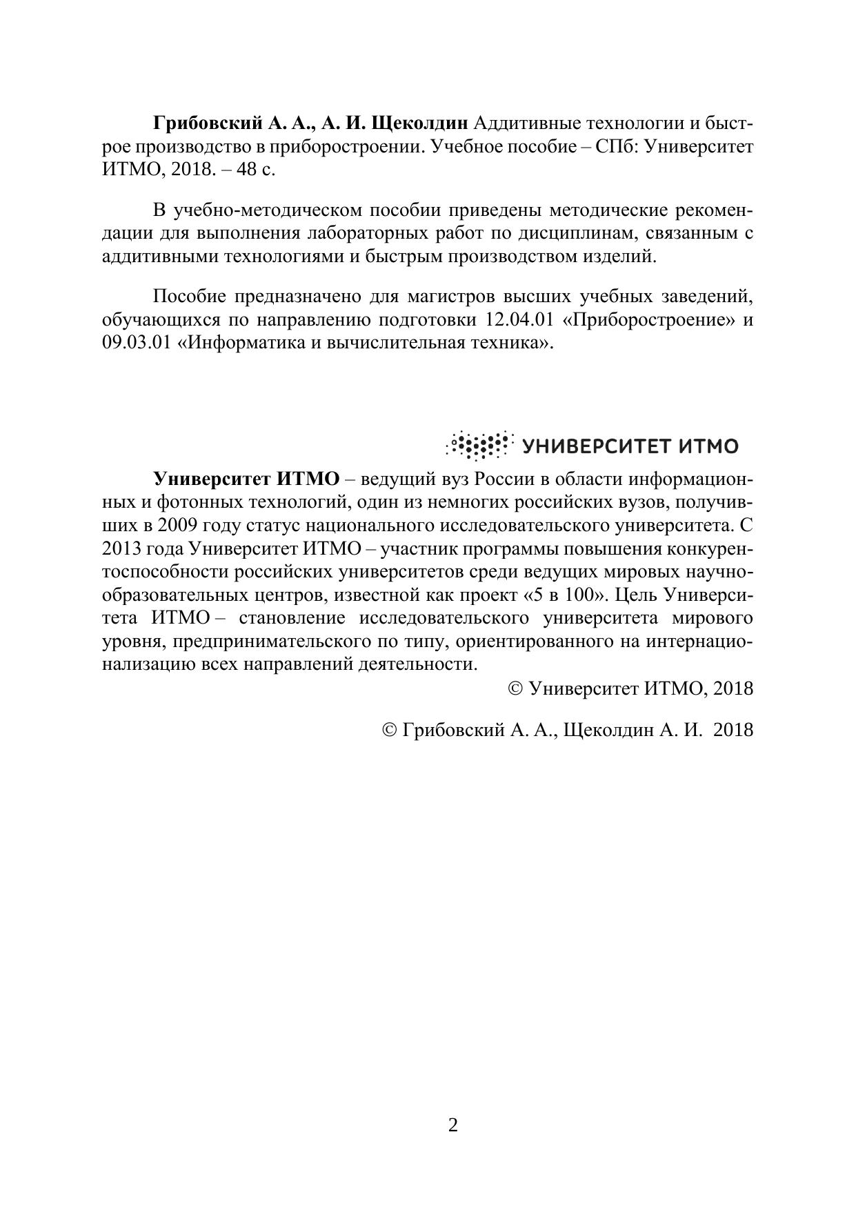 В учебно-методическом пособии приведены методические рекомендации для выполнения лабораторных работ по дисциплинам, связанным с аддитивными технологиями и быстрым производством изделий. Пособие предназначено для магистров высших учебных заведений, обучающихся по направлению подготовки 12.04.01 «Приборостроение» и 09.03.01 «Информатика и вычислительная техника»