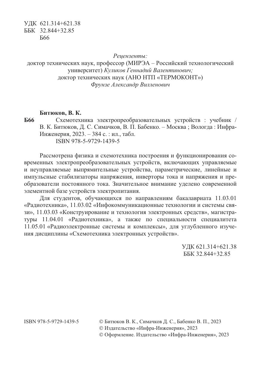 Для студентов, обучающихся по направлениям бакалавриата 11.03.01 «Радиотехника», 11.03.02 «Инфокоммуникационные технологии и системы связи», 11.03.03 «Конструирование и технология электронных средств», магистратуры 11.04.01 «Радиотехника», а также по специальности специалитета 11.05.01 «Радиоэлектронные системы и комплексы», для углубленного изучения дисциплины «Схемотехника электронных устройств».