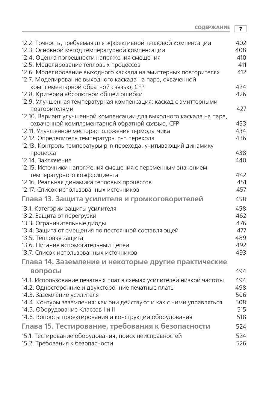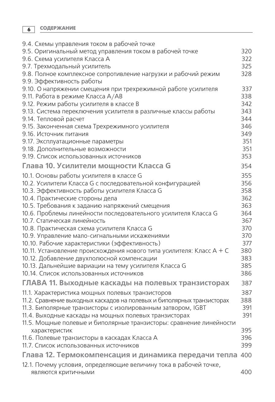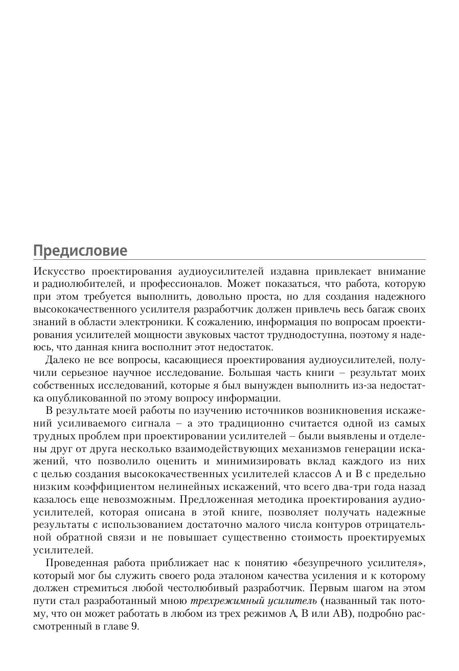 Искусство проектирования аудиоусилителей издавна привлекает внимание и радиолюбителей, и профессионалов. Может показаться, что работа, которую при этом требуется выполнить, довольно проста, но для создания надежного высококачественного усилителя разработчик должен привлечь весь багаж своих знаний в области электроники. К сожалению, информация по вопросам проектирования усилителей мощности звуковых частот разрозненна и зачастую труднодоступна. Данная книга поможет читателю восполнить этот недостаток. В ней рассматриваются вопросы минимизации искажений и повышения линейности усиления, затрагиваются проблемы, связанные с проектированием усилителей, такие как надежность, обеспечение стабильным питанием, защита от перегрузок и т.п. Приведен уникальный материал по режимам работы на реактивную нагрузку, необычным способам компенсации искажений и др. Обсуждаемые вопросы снабжены подробными ссылками на справочные издания, призванные помочь читателю в дальнейшем исследовании в этой области. Издание предназначено разработчикам аудиоаппаратуры, квалифицированным радиолюбителям, а также может быть полезно студентам старших курсов радио-технических специальностей и всем читателям, интересующимся современной аудиоэлектроникой.