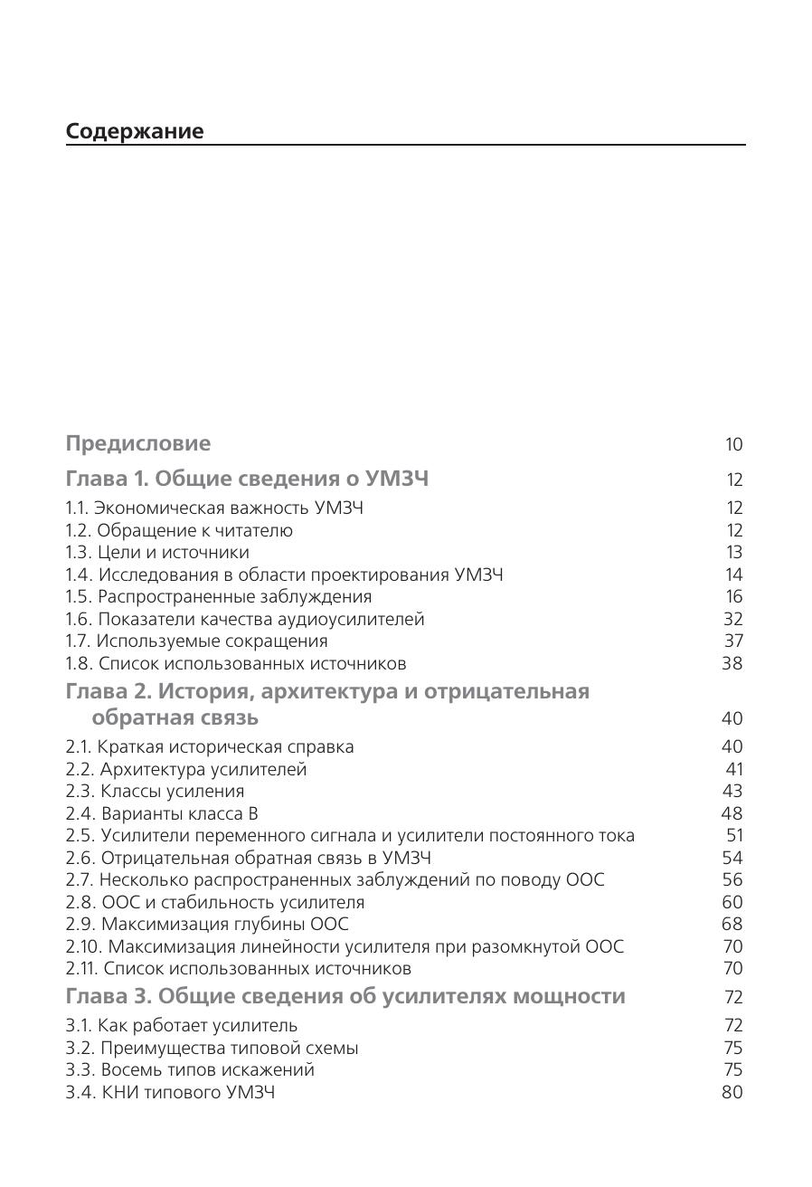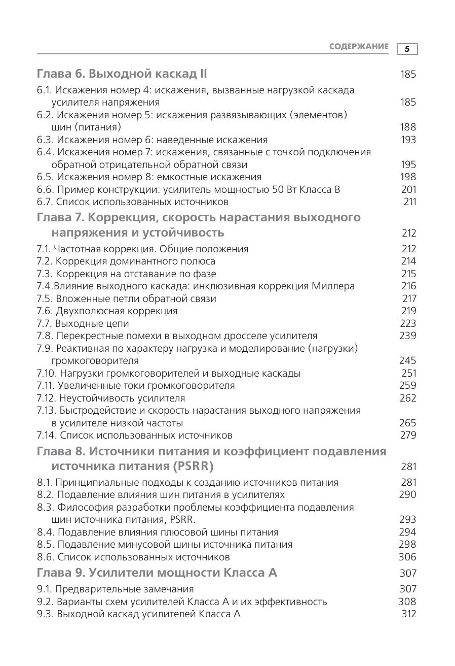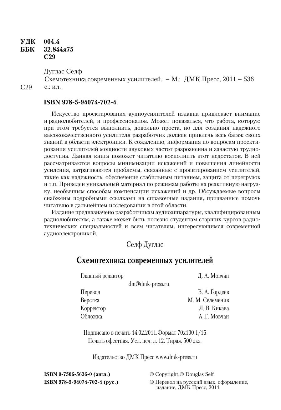Искусство проектирования аудиоусилителей издавна привлекает внимание и радиолюбителей, и профессионалов. Может показаться, что работа, которую при этом требуется выполнить, довольно проста, но для создания надежного высококачественного усилителя разработчик должен привлечь весь багаж своих знаний в области электроники. К сожалению, информация по вопросам проектирования усилителей мощности звуковых частот разрозненна и зачастую труднодоступна. Данная книга поможет читателю восполнить этот недостаток. В ней рассматриваются вопросы минимизации искажений и повышения линейности усиления, затрагиваются проблемы, связанные с проектированием усилителей, такие как надежность, обеспечение стабильным питанием, защита от перегрузок и т.п. Приведен уникальный материал по режимам работы на реактивную нагрузку, необычным способам компенсации искажений и др. Обсуждаемые вопросы снабжены подробными ссылками на справочные издания, призванные помочь читателю в дальнейшем исследовании в этой области. Издание предназначено разработчикам аудиоаппаратуры, квалифицированным радиолюбителям, а также может быть полезно студентам старших курсов радио-технических специальностей и всем читателям, интересующимся современной аудиоэлектроникой.