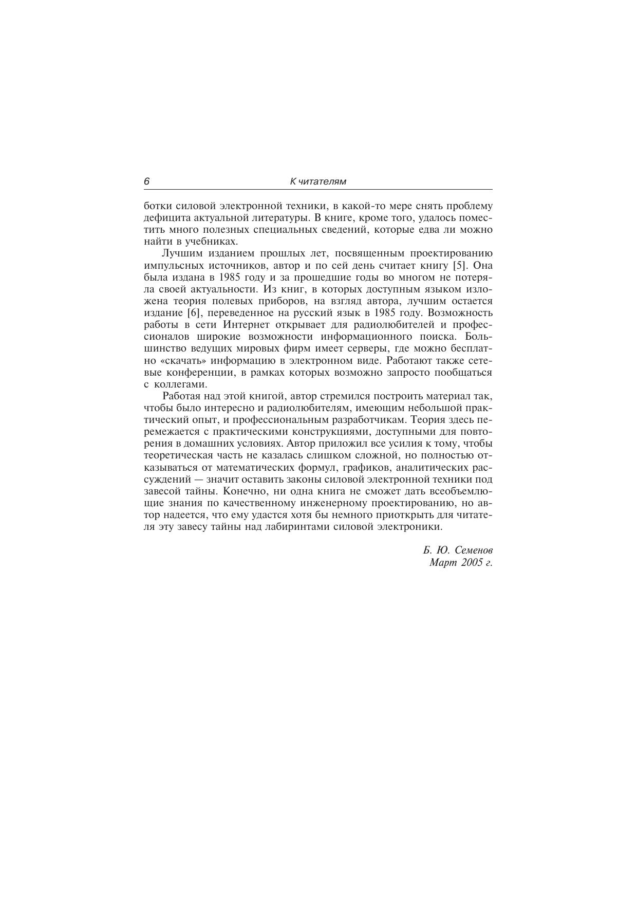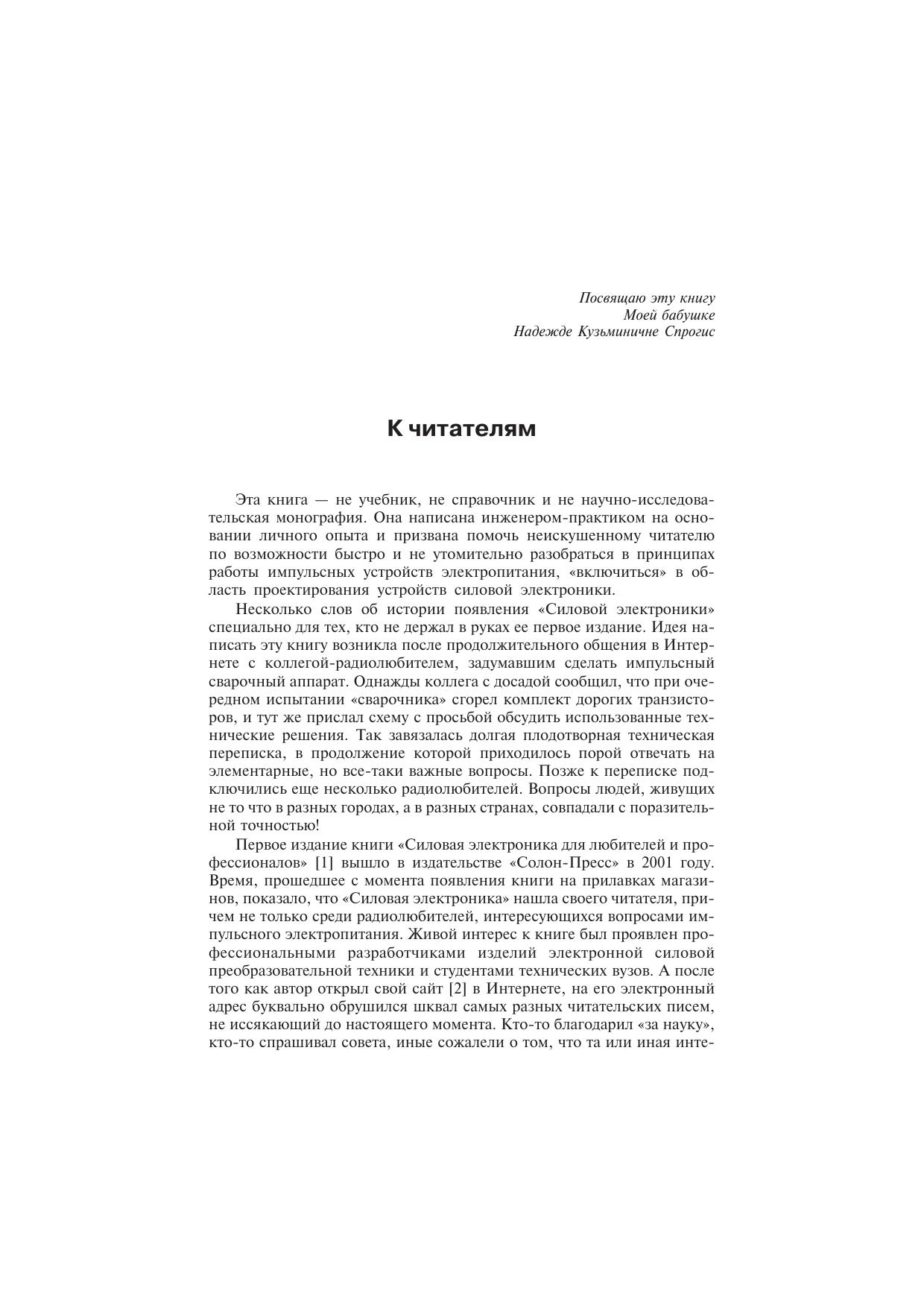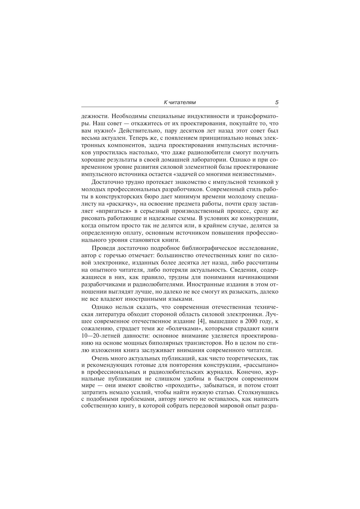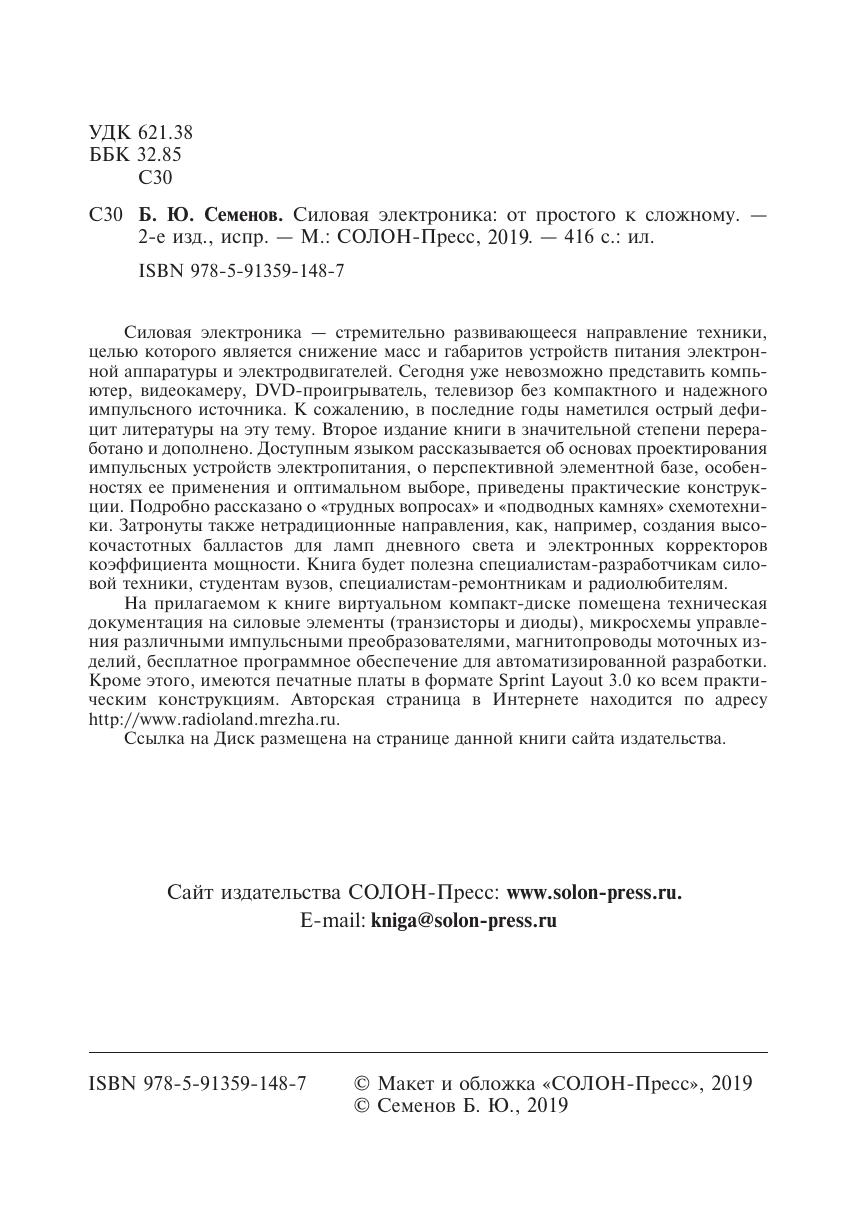 Силовая электроника — стремительно развивающееся направление техники, целью которого является снижение масс и габаритов устройств питания электронной аппаратуры и электродвигателей. Сегодня уже невозможно представить компьютер, видеокамеру, DVD-проигрыватель, телевизор без компактного и надежного импульсного источника. К сожалению, в последние годы наметился острый дефицит литературы на эту тему. Второе издание книги в значительной степени переработано и дополнено. Доступным языком рассказывается об основах проектирования импульсных устройств электропитания, о перспективной элементной базе, особенностях ее применения и оптимальном выборе, приведены практические конструкции. Подробно рассказано о «трудных вопросах» и «подводных камнях» схемотехники. Затронуты также нетрадиционные направления, как, например, создания высокочастотных балластов для ламп дневного света и электронных корректоров коэффициента мощности. Книга будет полезна специалистам-разработчикам силовой техники, студентам вузов, специалистам-ремонтникам и радиолюбителям. На прилагаемом к книге виртуальном компакт-диске помещена техническая документация на силовые элементы (транзисторы и диоды), микросхемы управления различными импульсными преобразователями, магнитопроводы моточных изделий, бесплатное программное обеспечение для автоматизированной разработки. Кроме этого, имеются печатные платы в формате Sprint Layout 3.0 ко всем практическим конструкциям. Авторская страница в Интернете находится по адресу http://www.radioland.mrezha.ru. Ссылка на Диск размещена на странице данной книги сайта издательства.