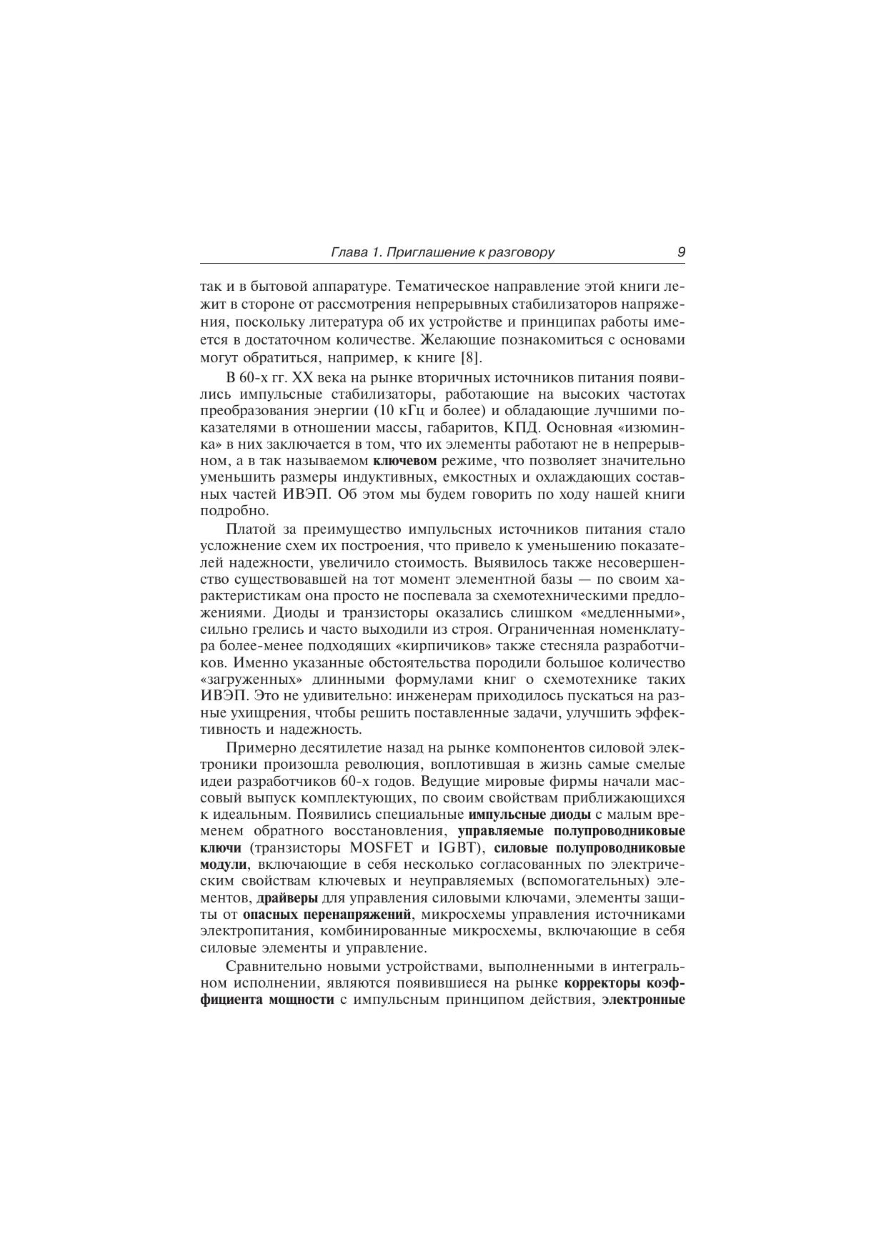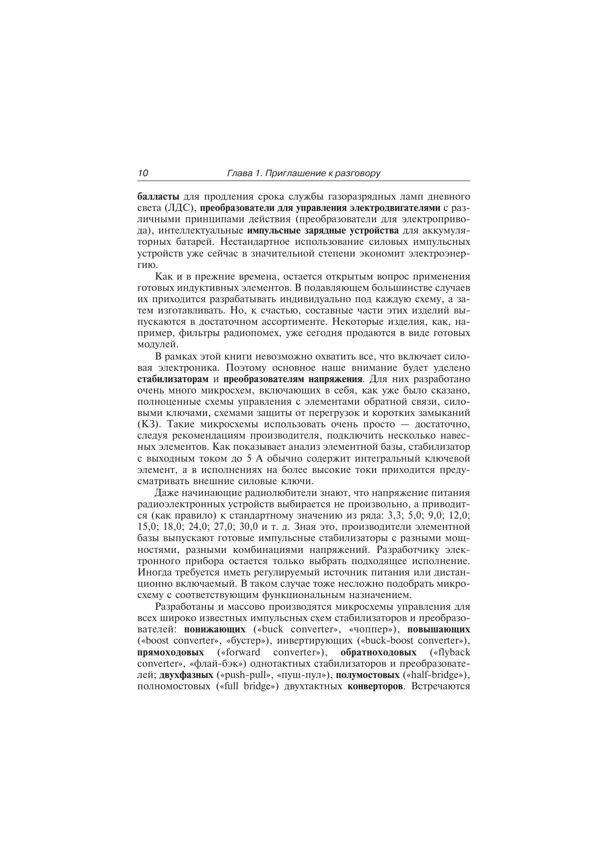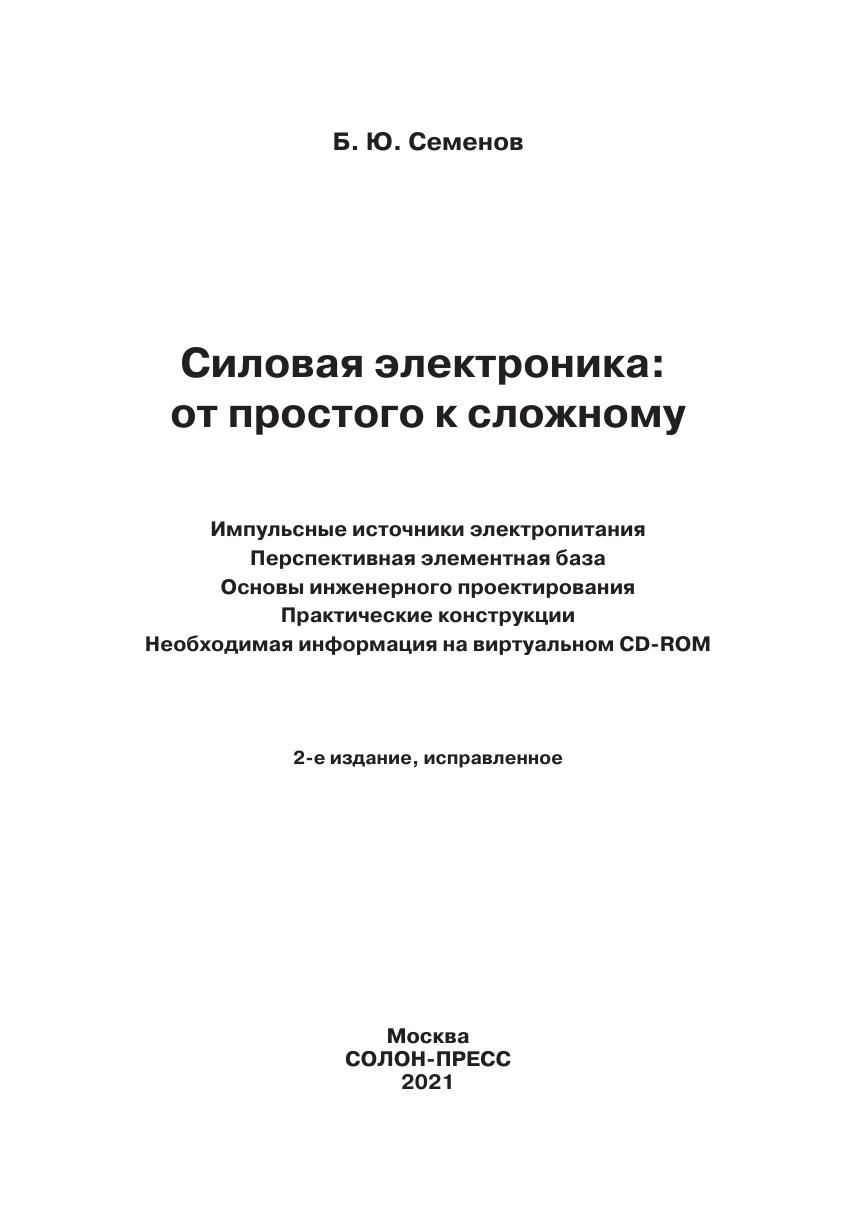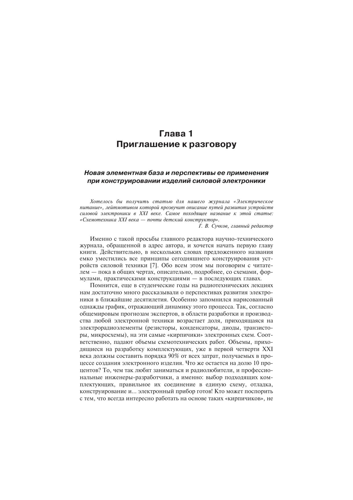 Силовая электроника — стремительно развивающееся направление техники, целью которого является снижение масс и габаритов устройств питания электронной аппаратуры и электродвигателей. Сегодня уже невозможно представить компьютер, видеокамеру, DVD-проигрыватель, телевизор без компактного и надежного импульсного источника. К сожалению, в последние годы наметился острый дефицит литературы на эту тему. Второе издание книги в значительной степени переработано и дополнено. Доступным языком рассказывается об основах проектирования импульсных устройств электропитания, о перспективной элементной базе, особенностях ее применения и оптимальном выборе, приведены практические конструкции. Подробно рассказано о «трудных вопросах» и «подводных камнях» схемотехники. Затронуты также нетрадиционные направления, как, например, создания высокочастотных балластов для ламп дневного света и электронных корректоров коэффициента мощности. Книга будет полезна специалистам-разработчикам силовой техники, студентам вузов, специалистам-ремонтникам и радиолюбителям. На прилагаемом к книге виртуальном компакт-диске помещена техническая документация на силовые элементы (транзисторы и диоды), микросхемы управления различными импульсными преобразователями, магнитопроводы моточных изделий, бесплатное программное обеспечение для автоматизированной разработки. Кроме этого, имеются печатные платы в формате Sprint Layout 3.0 ко всем практическим конструкциям. Авторская страница в Интернете находится по адресу http://www.radioland.mrezha.ru. Ссылка на Диск размещена на странице данной книги сайта издательства.
