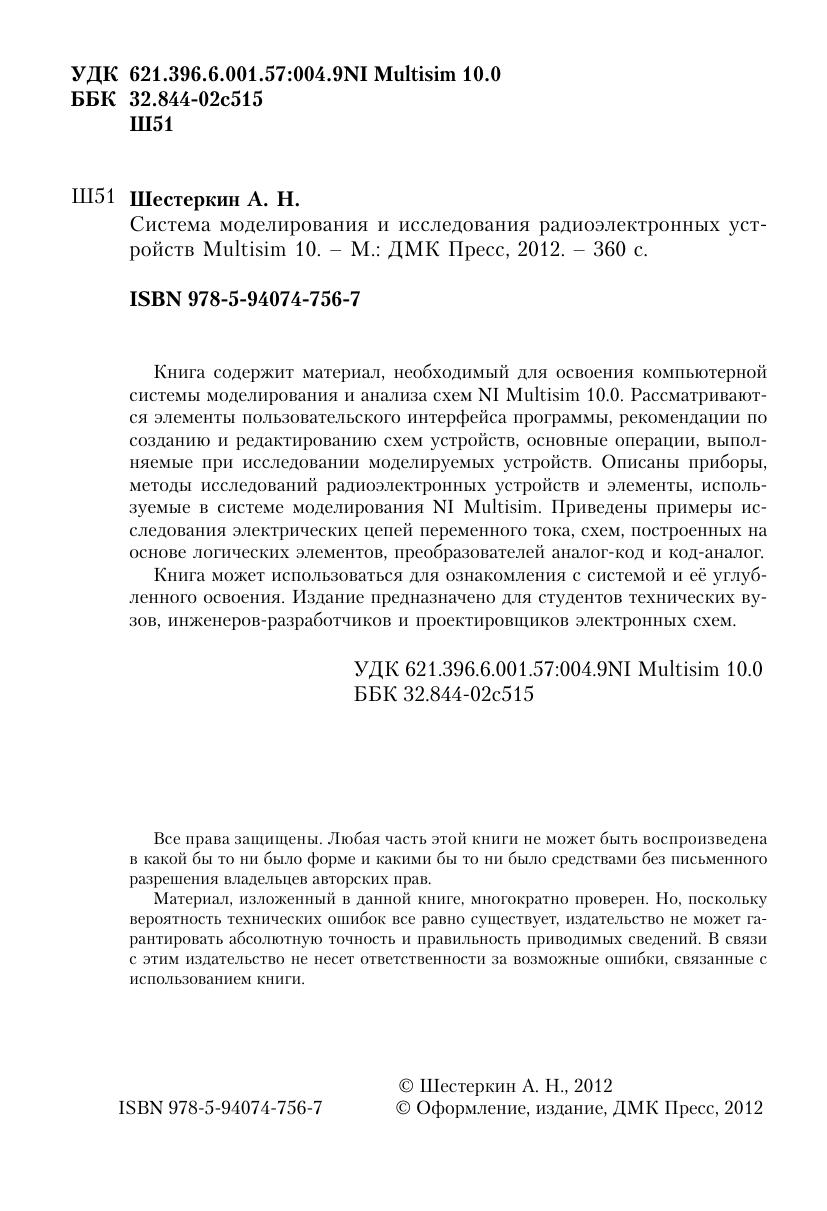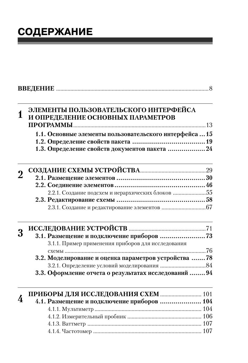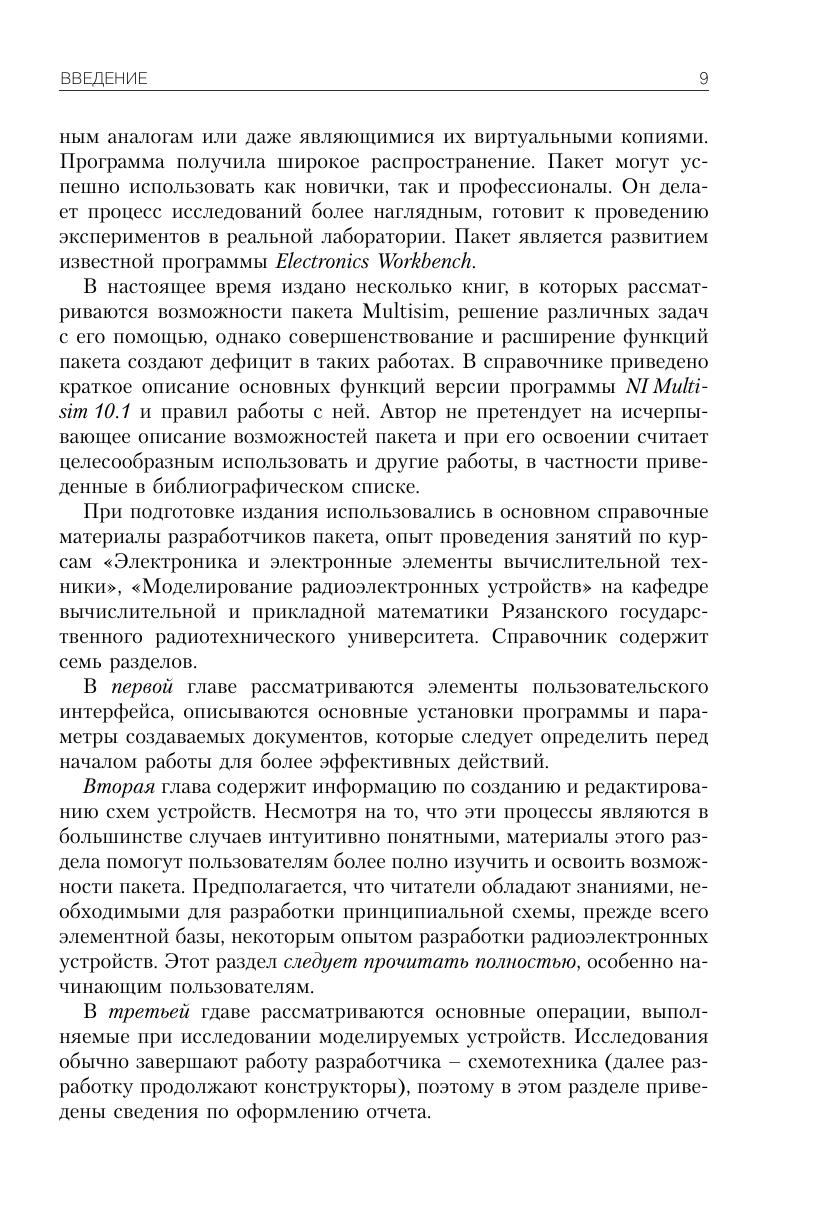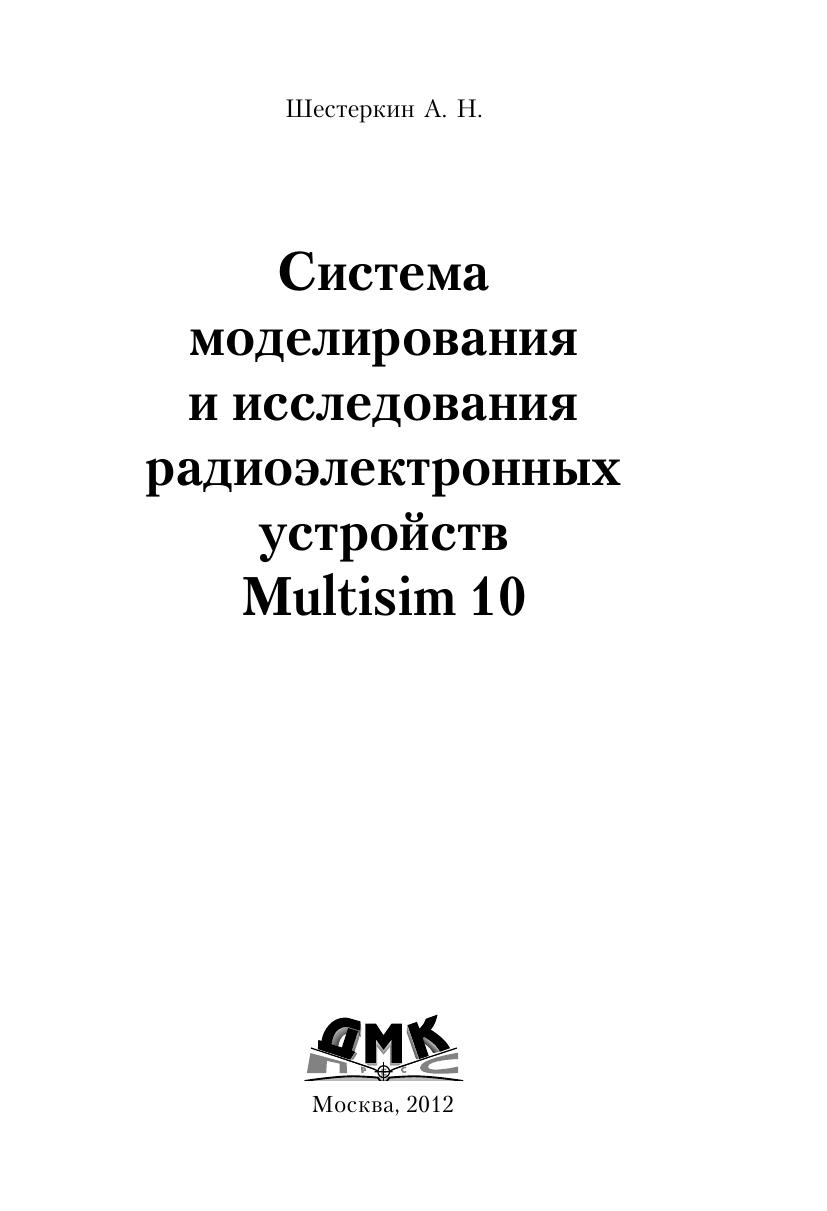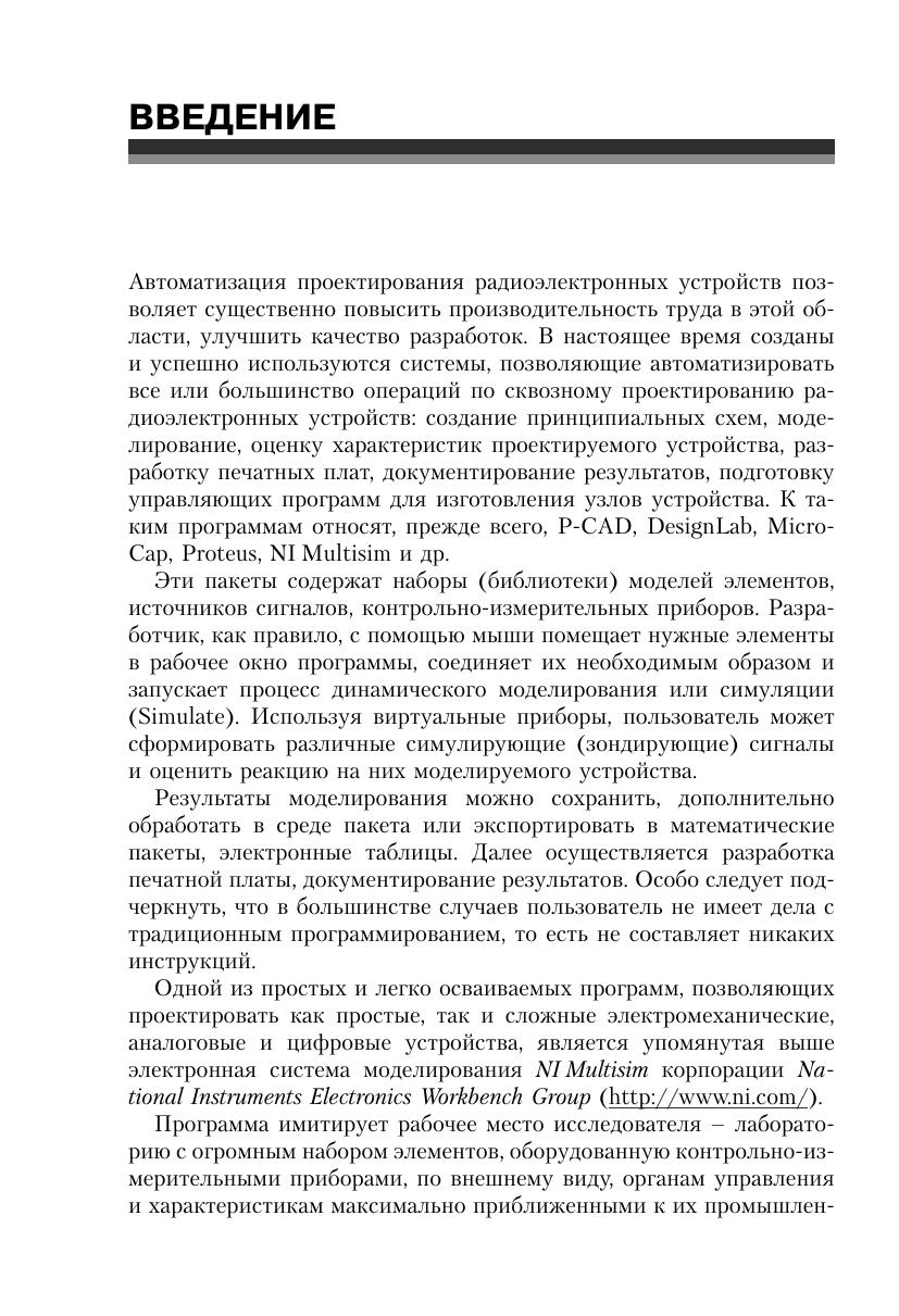 Книга содержит материал, необходимый для освоения компьютерной системы моделирования и анализа схем NI Multisim 10.0. Рассматриваются элементы пользовательского интерфейса программы, рекомендации по созданию и редактированию схем устройств, основные операции, выполняемые при исследовании моделируемых устройств. Описаны приборы, методы исследований радиоэлектронных устройств и элементы, используемые в системе моделирования NI Multisim. Приведены примеры исследования электрических цепей переменного тока, схем, построенных на основе логических элементов, преобразователей аналог-код и код-аналог. Книга может использоваться для ознакомления с системой и её углубленного освоения. Издание предназначено для студентов технических вузов, инженеров-разработчиков и проектировщиков электронных схем.