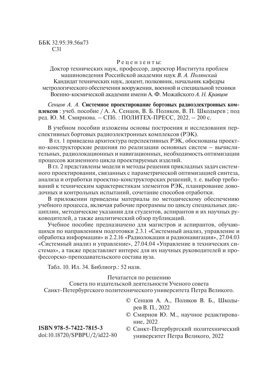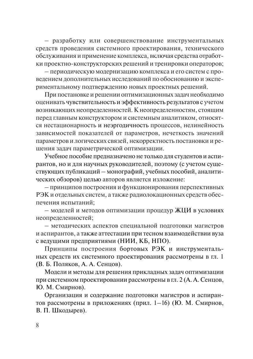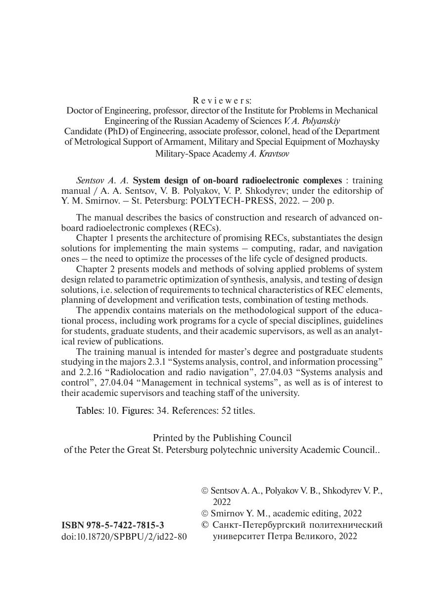 В учебном пособии изложены основы построения и исследования перспективных бортовых радиоэлектронных комплексов (РЭК). В гл. 1 приведена архитектура перспективных РЭК, обоснованы проектно-конструкторские решения по реализации основных систем – вычислительных, радиолокационных и навигационных, необходимость оптимизации процессов жизненного цикла проектируемых изделий. В гл. 2 представлены модели и методы решения прикладных задач системного проектирования, связанных с параметрической оптимизацией синтеза, анализа и отработки проектно-конструкторских решений, т. е. выбор требований к техническим характеристикам элементов РЭК, планирование доводочных и контрольных испытаний, сочетание способов отработки. В приложении приведены материалы по методическому обеспечению учебного процесса, включая рабочие программы по циклу специальных дисциплин, методические указания для студентов, аспирантов и их научных руководителей, а также аналитический обзор публикаций. Учебное пособие предназначено для магистров и аспирантов, обучающихся по направлениям подготовки 2.3.1 «Системный анализ, управление и обработка информации» и 2.2.16 «Радиолокация и радионавигация», 27.04.03 «Системный анализ и управление», 27.04.04 «Управление в технических системах», а также представляет интерес для их научных руководителей и профессорско-преподавательского состава вуза.