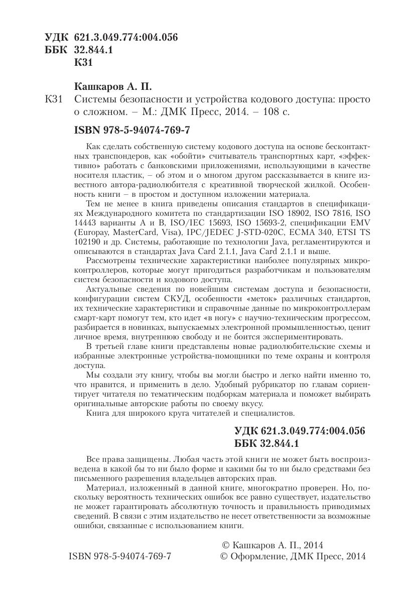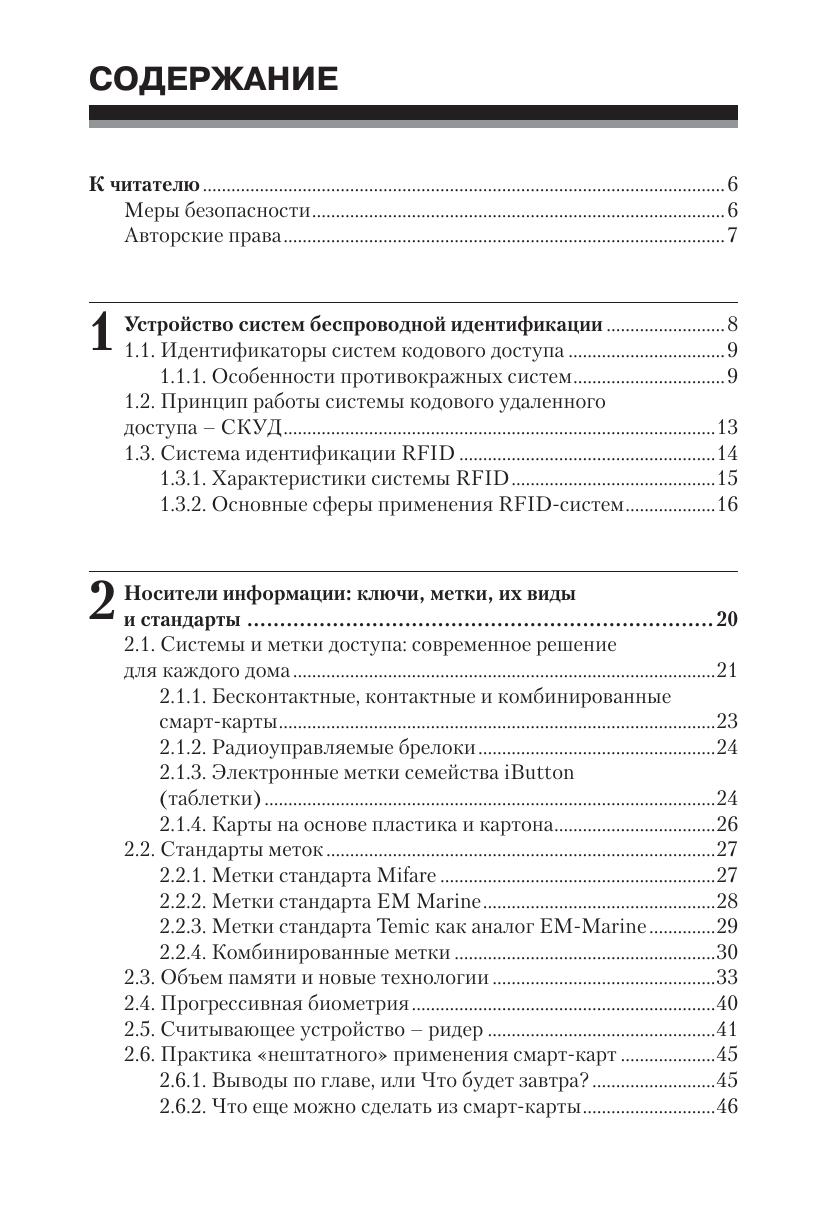 Как сделать собственную систему кодового доступа на основе бесконтактных транспондеров, как «обойти» считыватель транспортных карт, «эффективно» работать с банковскими приложениями, использующими в качестве носителя пластик, – об этом и о многом другом рассказывается в книге известного автора-радиолюбителя с креативной творческой жилкой. Особенность книги – в простом и доступном изложении материала. Тем не менее в книга приведены описания стандартов в спецификациях Международного комитета по стандартизации ISO 18902, ISO 7816, ISO 14443 варианты А и В, ISO/IEC 15693, ISO 15693-2, спецификации EMV (Europay, MasterCard, Visa), IPC/JEDEC J-STD-020C, ECMA 340, ETSI TS 102190 и др. Системы, работающие по технологии Java, регламентируются и описываются в стандартах Java Card 2.1.1, Java Card 2.1.1 и выше. Рассмотрены технические характеристики наиболее популярных микроконтроллеров, которые могут пригодиться разработчикам и пользователям систем безопасности и кодового доступа. Актуальные сведения по новейшим системам доступа и безопасности, конфигурации систем СКУД, особенности «меток» различных стандартов, их технические характеристики и справочные данные по микроконтроллерам смарт-карт помогут тем, кто идет «в ногу» с научно-техническим прогрессом, разбирается в новинках, выпускаемых электронной промышленностью, ценит личное время, внутреннюю свободу и не боится экспериментировать. В третьей главе книги представлены новые радиолюбительские схемы и избранные электронные устройства-помощники по теме охра ны и контроля доступа. Мы создали эту книгу, чтобы вы могли быстро и легко найти именно то, что нравится, и применить в дело. Удобный рубрикатор по главам сориентирует читателя по тематическим подборкам материала и поможет выбирать оригинальные авторские работы по своему вкусу. Книга для широкого круга читателей и специалистов.