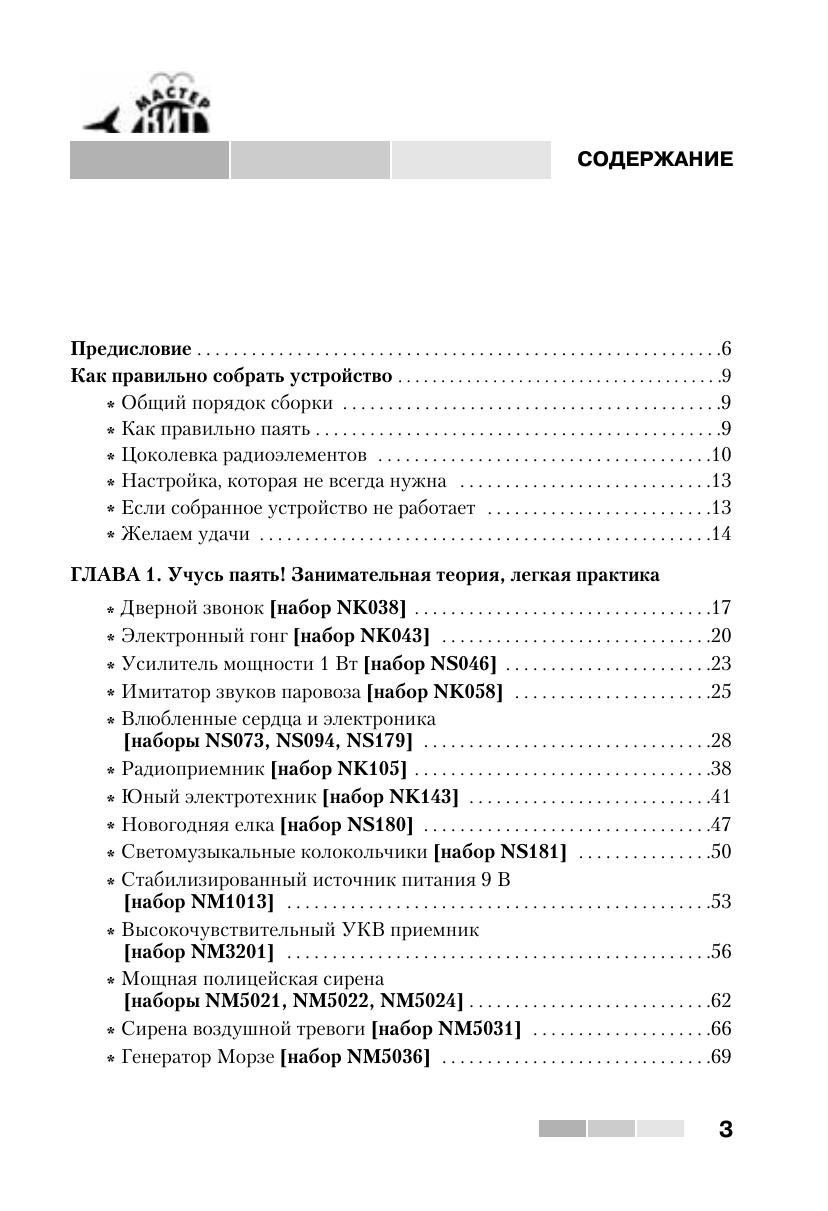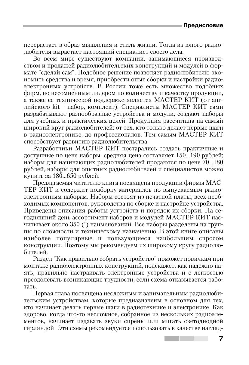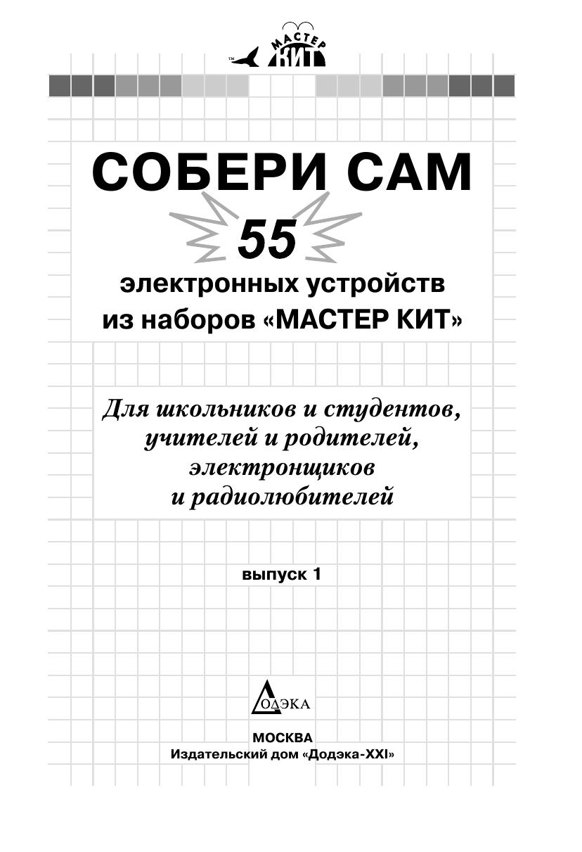 Книга знакомит читателей с 55 простыми и сложными электронными устройствами, которые можно легко собрать из наборов «МАСТЕР КИТ». Наборы, которые продаются в радиомагазинах городов России, содержат все необходимые радиодетали и платы для сборки устройств. Описание электронных устройств представлено в четырех главах, сгруппированных по назначению устройств — от игрушек до сложной измерительной техники. В книге приведен каталог, содержащий более 300 наименований электронных устройств, которые можно купить в виде готовых для сборки наборов «МАСТЕР КИТ». Эта книга представляет интерес для школьников и студентов, начинающих и опытных радиолюбителей, для работников сервисных и ремонтных служб, а также для учителей физики и родителей, обучающих детей основам радиоэлектроники и цифровой техники.