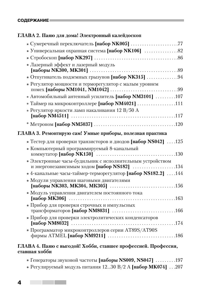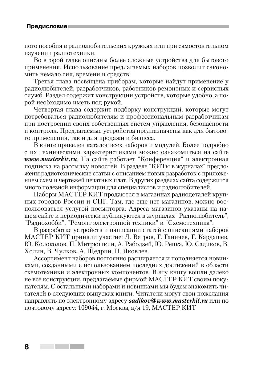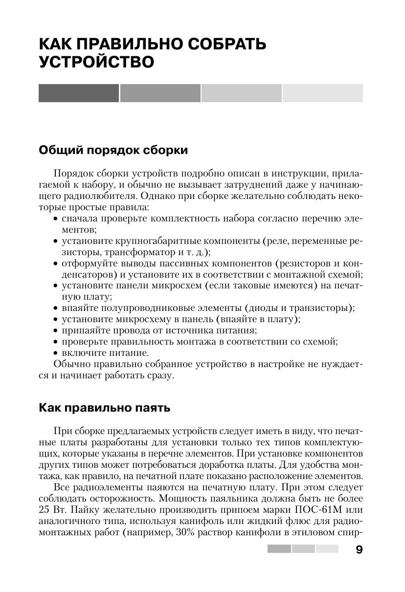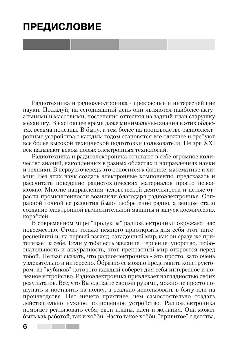 Книга знакомит читателей с 55 простыми и сложными электронными устройствами, которые можно легко собрать из наборов «МАСТЕР КИТ». Наборы, которые продаются в радиомагазинах городов России, содержат все необходимые радиодетали и платы для сборки устройств. Описание электронных устройств представлено в четырех главах, сгруппированных по назначению устройств — от игрушек до сложной измерительной техники. В книге приведен каталог, содержащий более 300 наименований электронных устройств, которые можно купить в виде готовых для сборки наборов «МАСТЕР КИТ». Эта книга представляет интерес для школьников и студентов, начинающих и опытных радиолюбителей, для работников сервисных и ремонтных служб, а также для учителей физики и родителей, обучающих детей основам радиоэлектроники и цифровой техники.