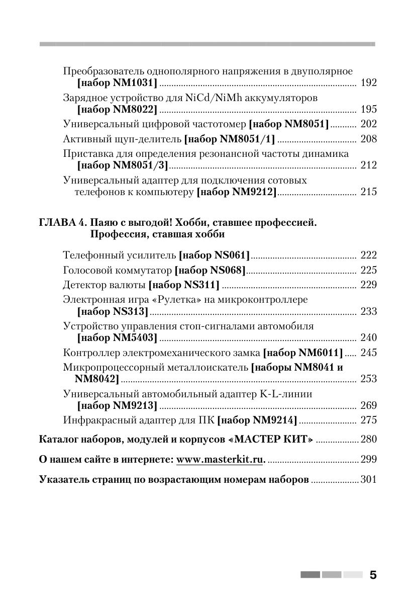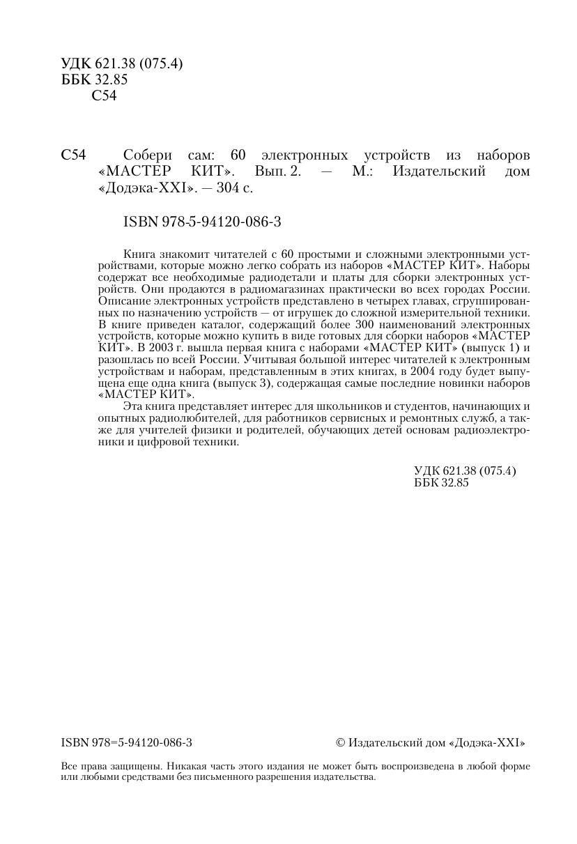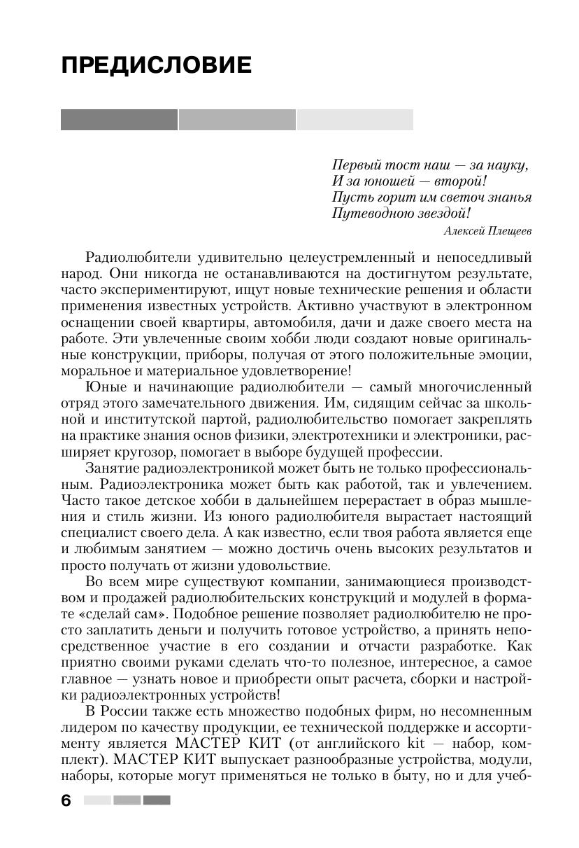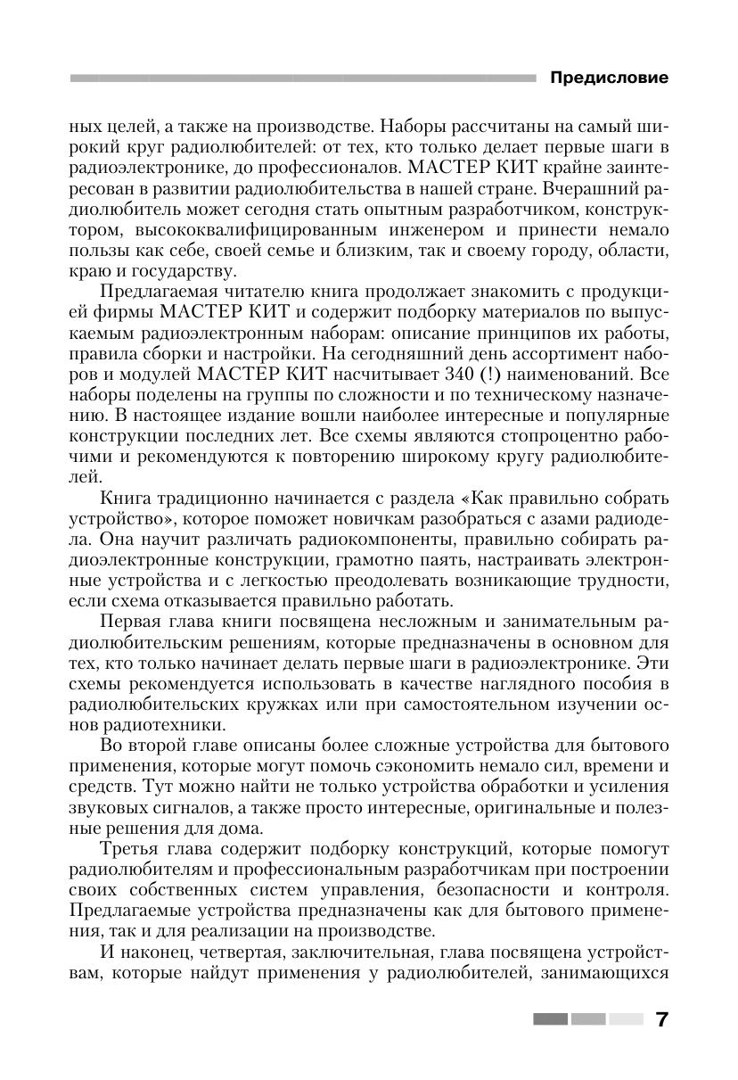 Книга знакомит читателей с 60 простыми и сложными электронными устройствами, которые можно легко собрать из наборов «МАСТЕР КИТ». Наборы содержат все необходимые радиодетали и платы для сборки электронных устройств. Они продаются в радиомагазинах практически во всех городах России. Описание электронных устройств представлено в четырех главах, сгруппированных по назначению устройств — от игрушек до сложной измерительной техники. В книге приведен каталог, содержащий более 300 наименований электронных устройств, которые можно купить в виде готовых для сборки наборов «МАСТЕР КИТ». Эта книга представляет интерес для школьников и студентов, начинающих и опытных радиолюбителей, для работников сервисных и ремонтных служб, а также для учителей физики и родителей, обучающих детей основам радиоэлектроники и цифровой техники.
