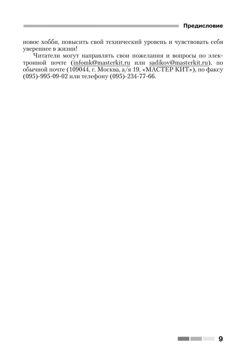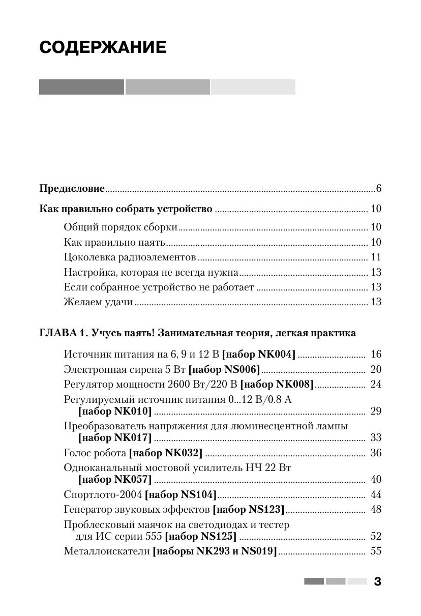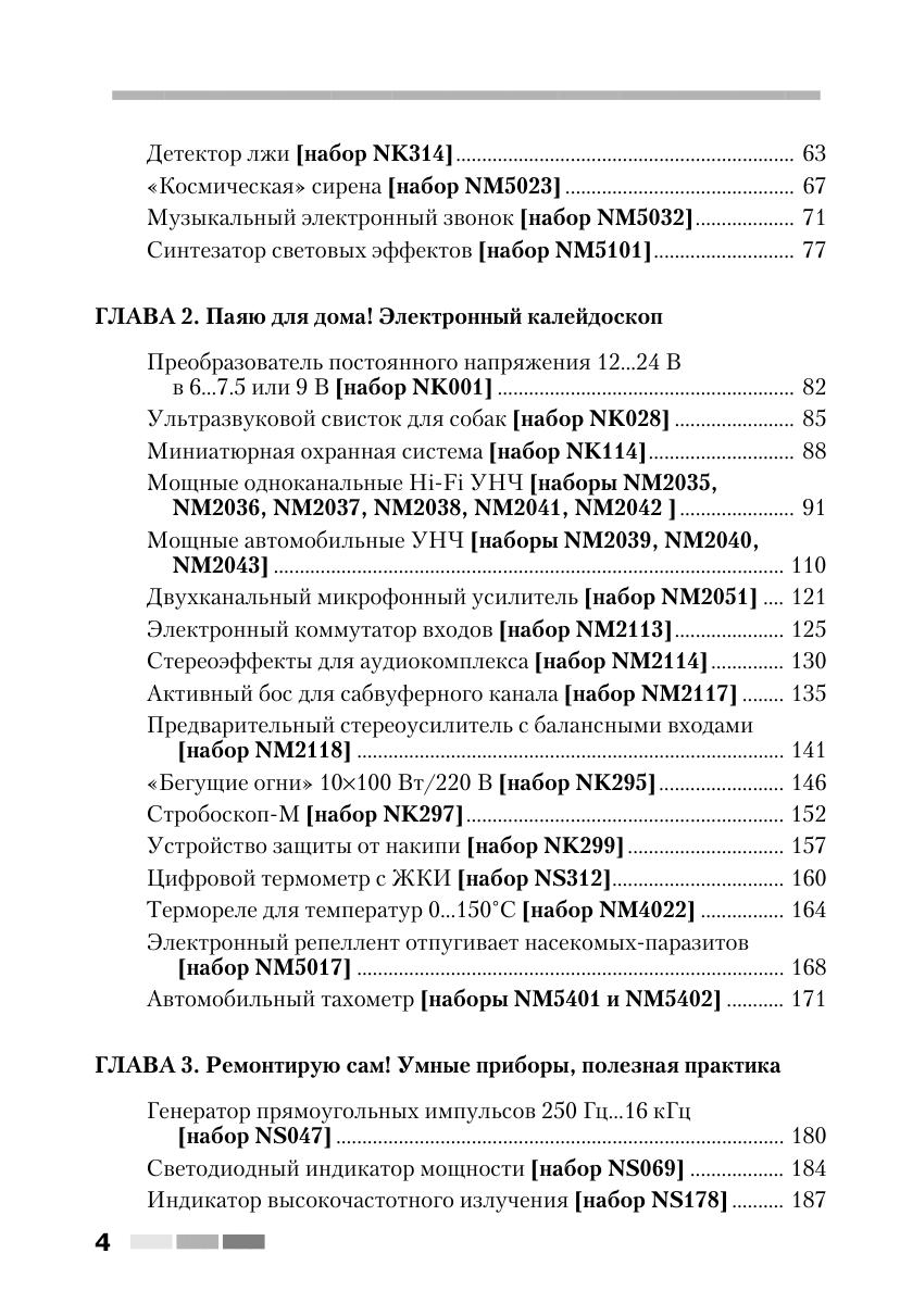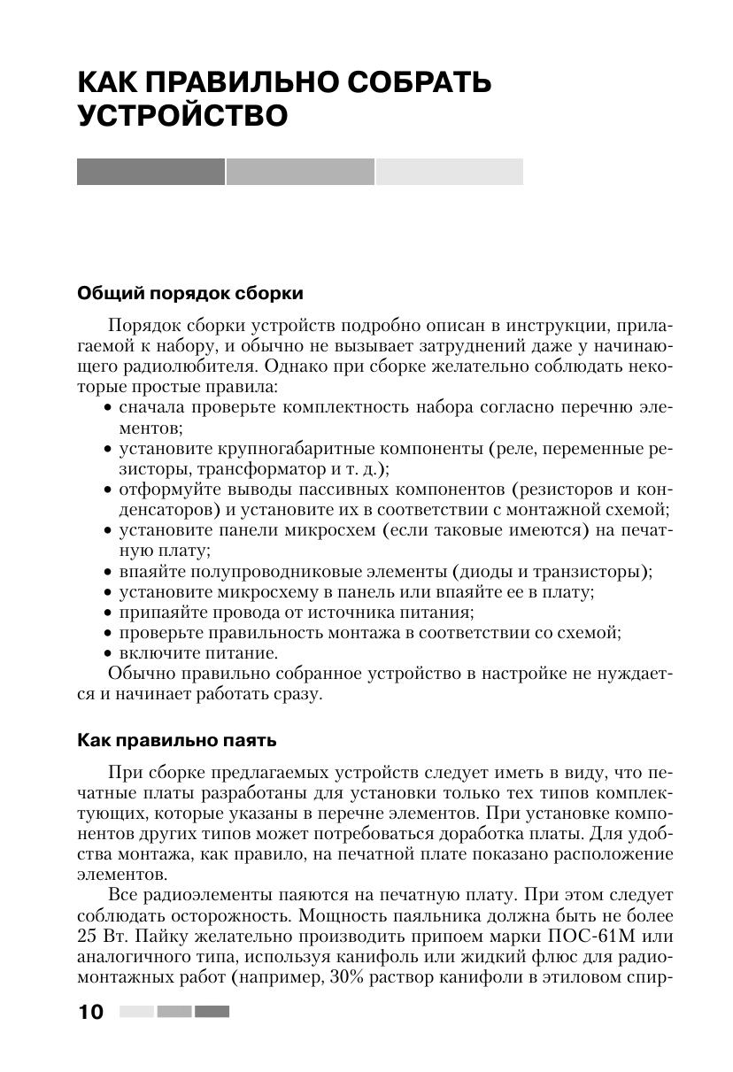 Книга знакомит читателей с 60 простыми и сложными электронными устройствами, которые можно легко собрать из наборов «МАСТЕР КИТ». Наборы содержат все необходимые радиодетали и платы для сборки электронных устройств. Они продаются в радиомагазинах практически во всех городах России. Описание электронных устройств представлено в четырех главах, сгруппированных по назначению устройств — от игрушек до сложной измерительной техники. В книге приведен каталог, содержащий более 300 наименований электронных устройств, которые можно купить в виде готовых для сборки наборов «МАСТЕР КИТ». Эта книга представляет интерес для школьников и студентов, начинающих и опытных радиолюбителей, для работников сервисных и ремонтных служб, а также для учителей физики и родителей, обучающих детей основам радиоэлектроники и цифровой техники.