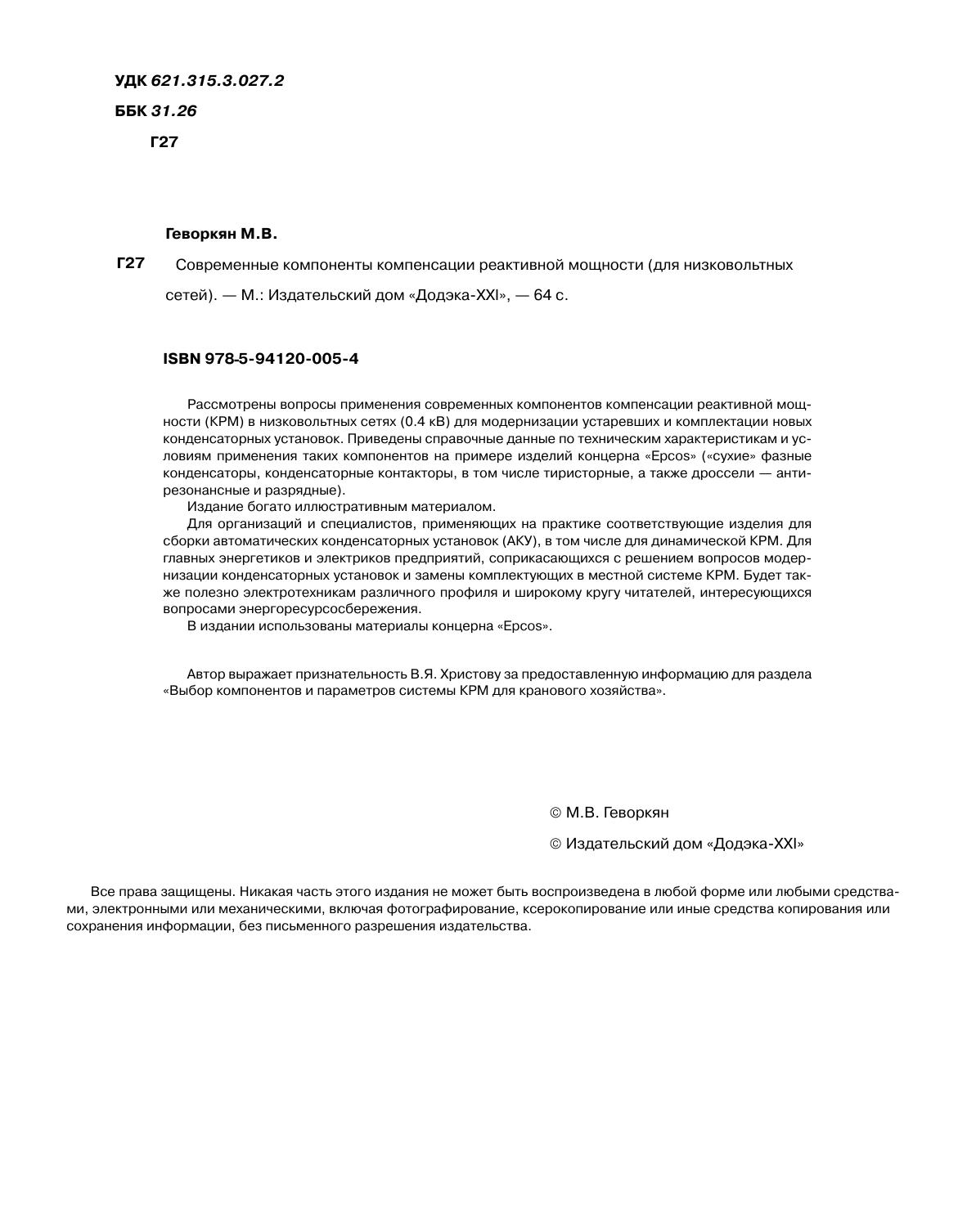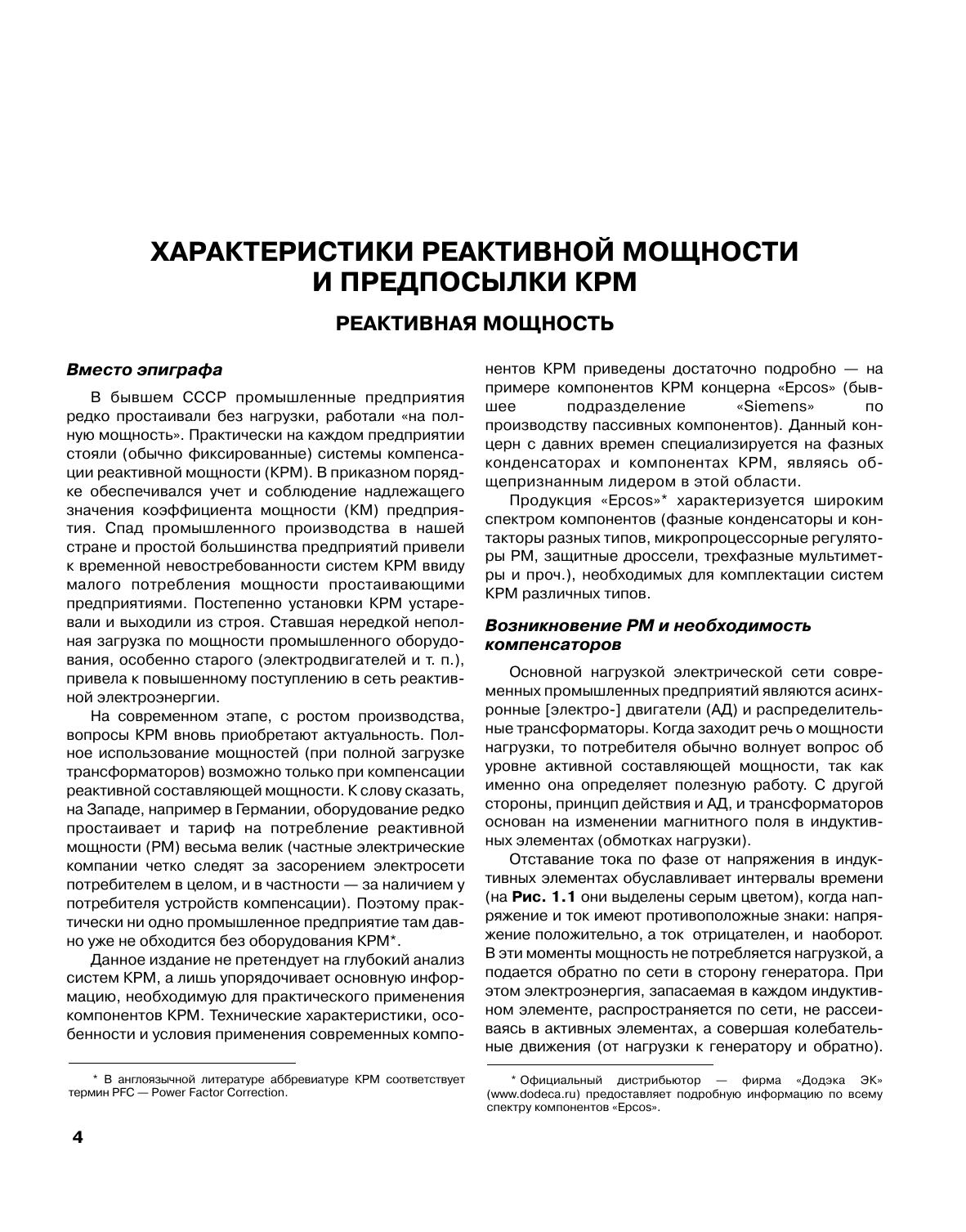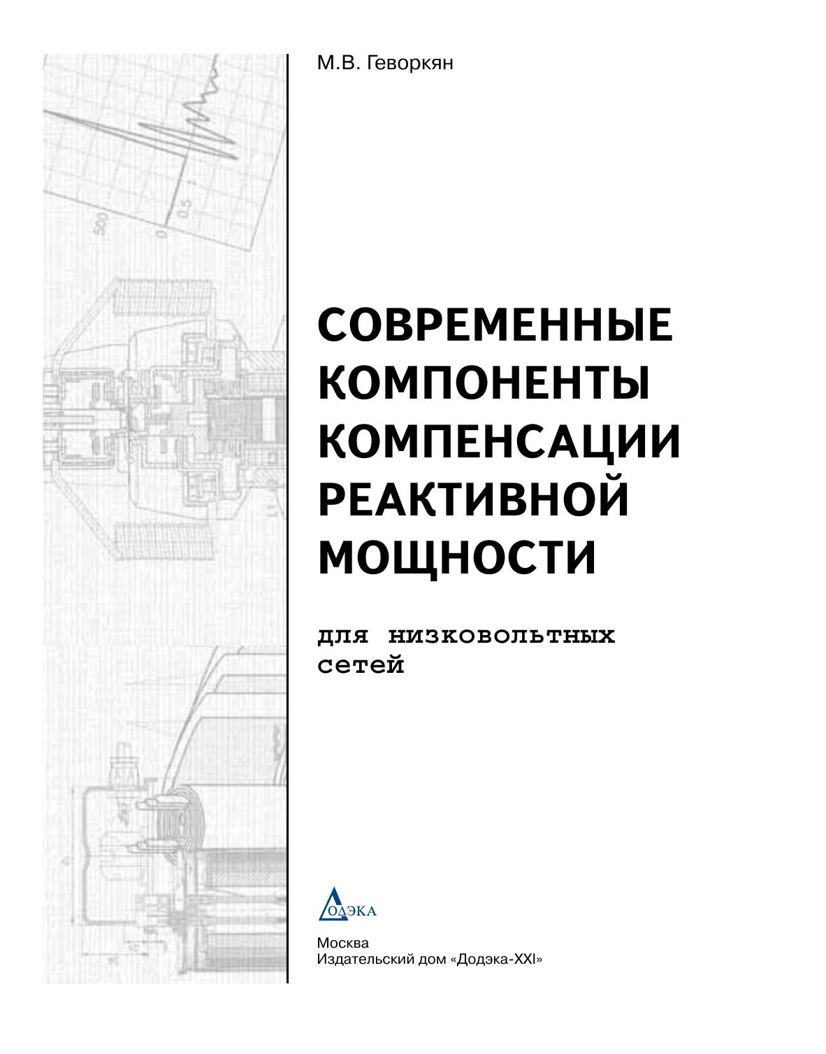 Рассмотрены вопросы применения современных компонентов компенсации реактивной мощности (КРМ) в низковольтных сетях (0.4 кВ) для модернизации устаревших и комплектации новых конденсаторных установок. Приведены справочные данные по техническим характеристикам и условиям применения таких компонентов на примере изделий концерна "Epcos" ("сухие" фазные конденсаторы, конденсаторные контакторы, в том числе тиристорные, а также дроссели - анти-резонансные и разрядные). Издание богато иллюстративным материалом. Для организаций и специалистов, применяющих на практике соответствующие изделия для сборки автоматических конденсаторных установок (АКУ), в том числе для динамической КРМ. Для главных энергетиков и электриков предприятий, соприкасающихся с решением вопросов модернизации конденсаторных установок и замены комплектующих в местной системе КРМ. Будет также полезно электротехникам различного профиля и широкому кругу читателей, интересующихся вопросами энергоресурсосбережения.