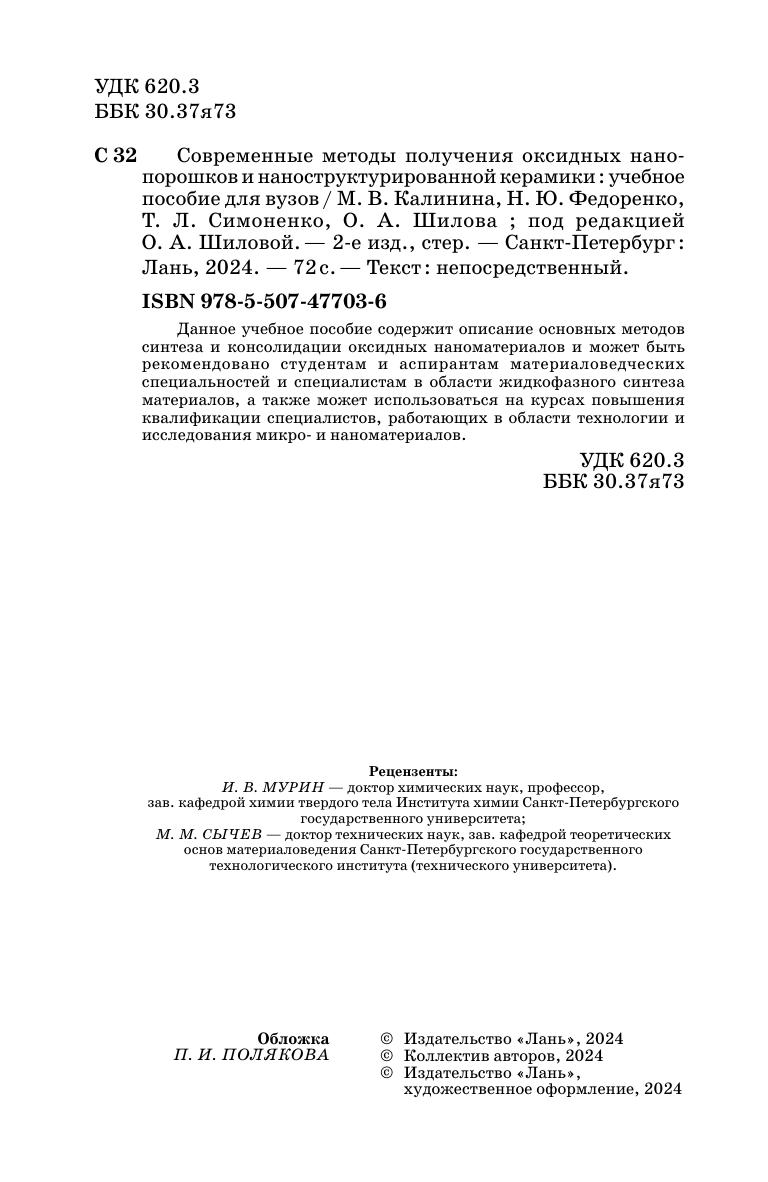 Данное учебное пособие содержит описание основных методов синтеза и консолидации оксидных наноматериалов и может быть рекомендовано студентам и аспирантам материаловедческих специальностей и специалистам в области жидкофазного синтеза материалов, а также может использоваться на курсах повышения квалификации специалистов, работающих в области технологии и исследования микро- и наноматериалов.