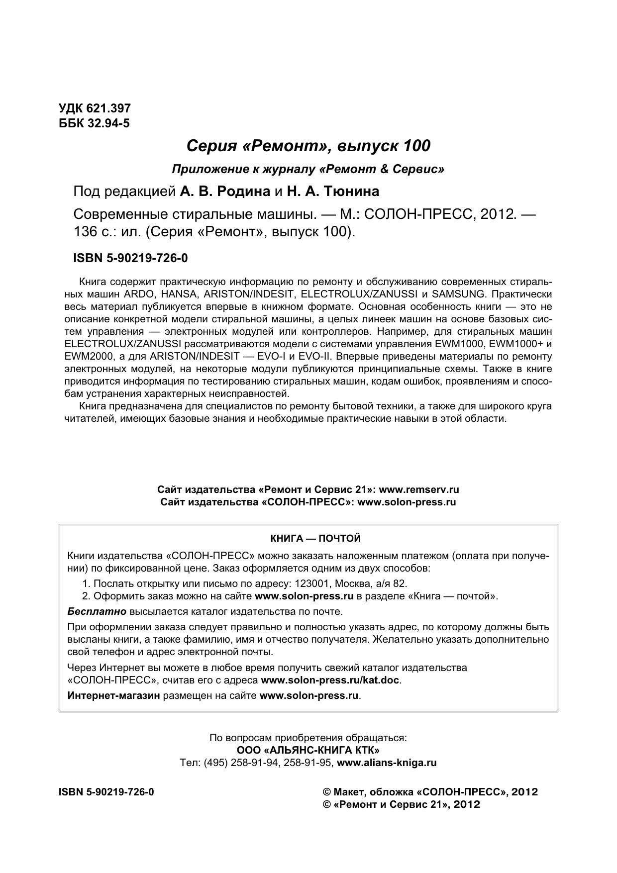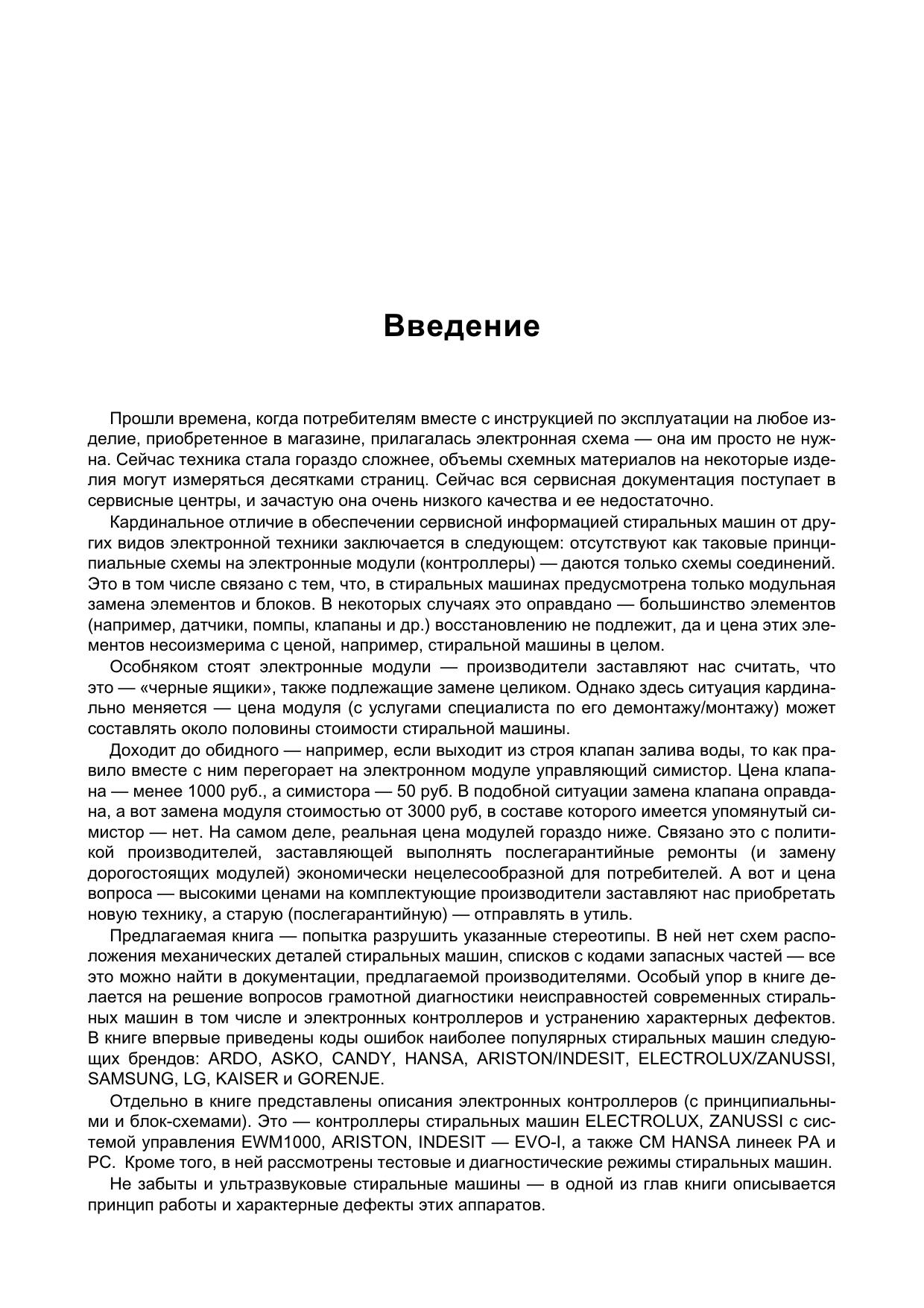 Книга содержит практическую информацию по ремонту и обслуживанию современных стиральных машин ARDO, HANSA, ARISTON/INDESIT, ELECTROLUX/ZANUSSI и SAMSUNG. Основная особенность этой книги - это не описание конкретной модели стиральной машины, а целых линеек машин на основе базовых систем управления - электронных модулей или контроллеров.