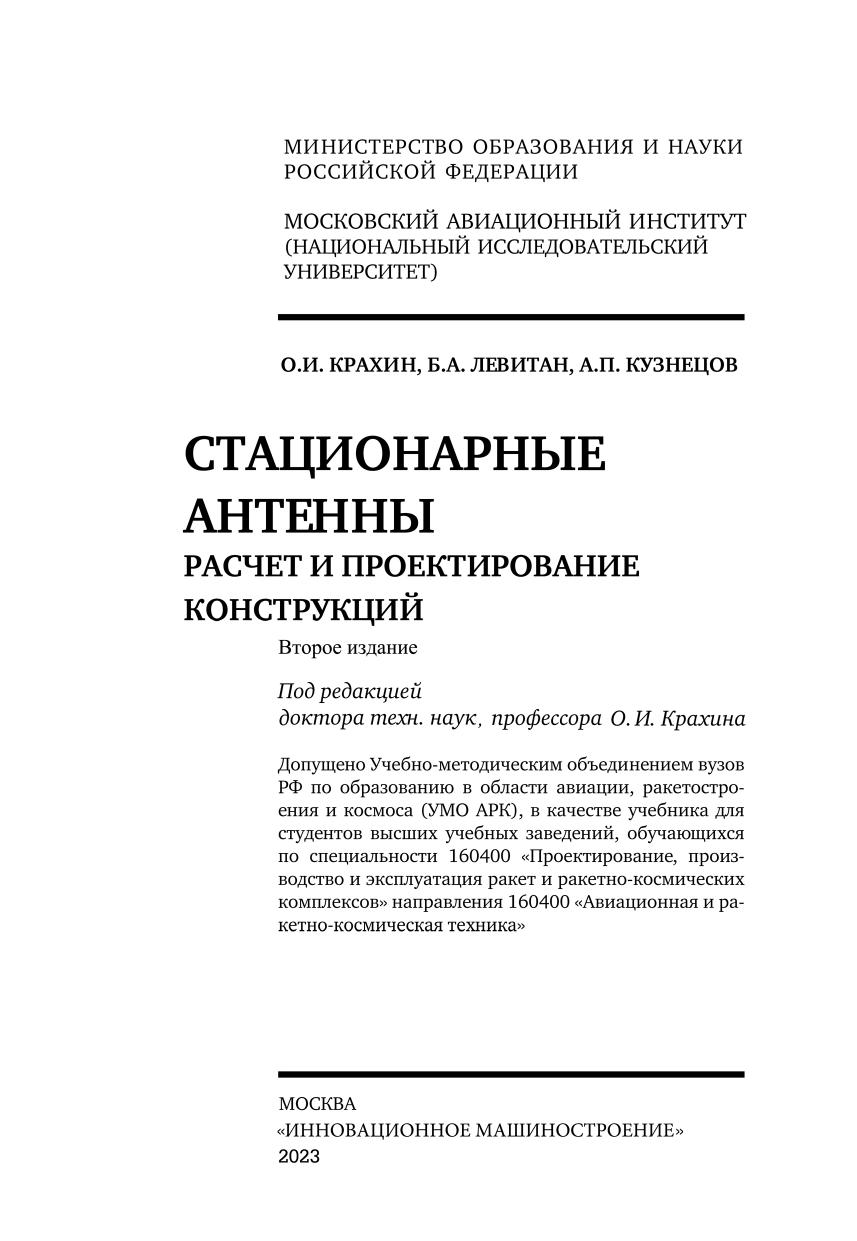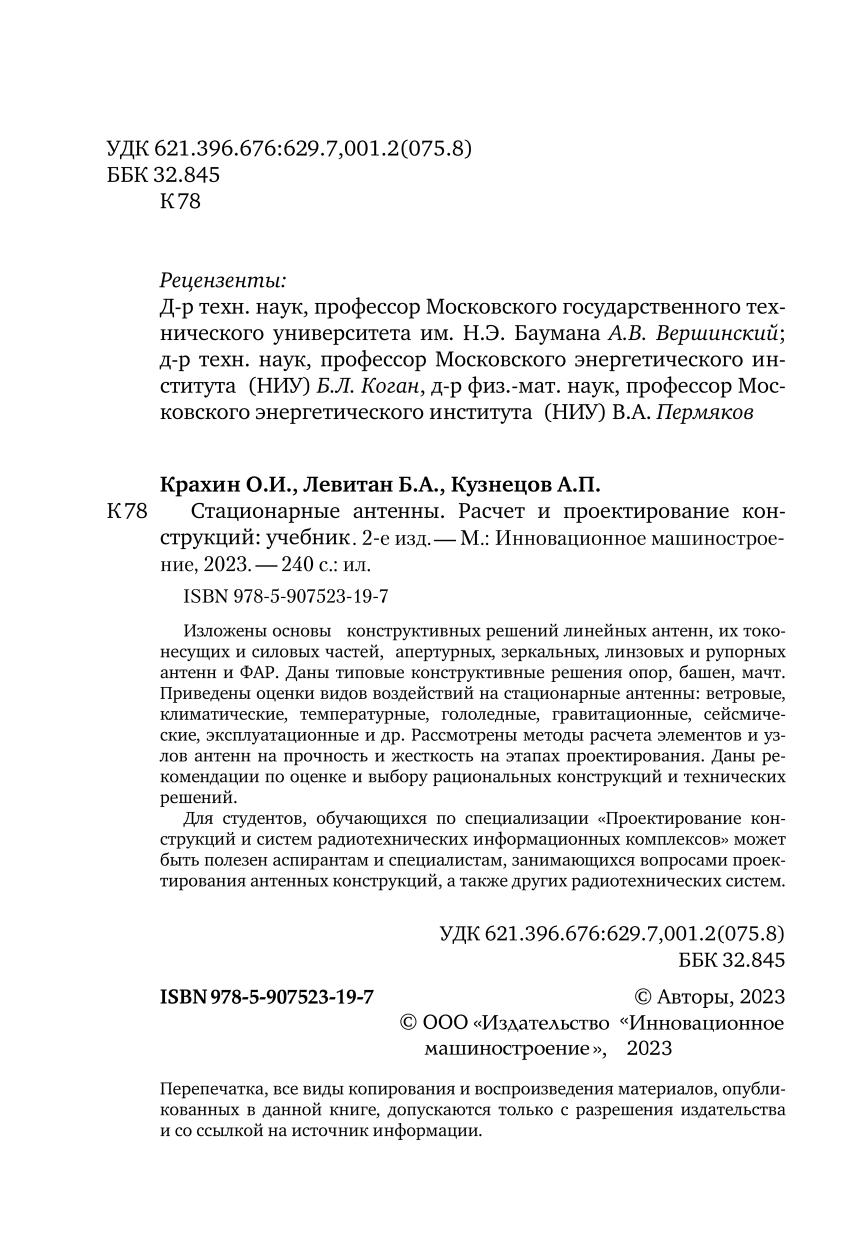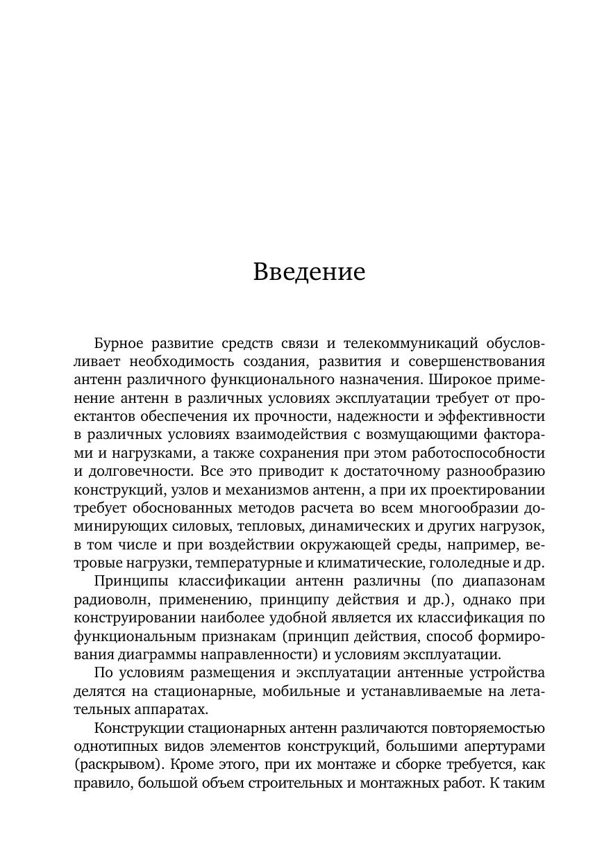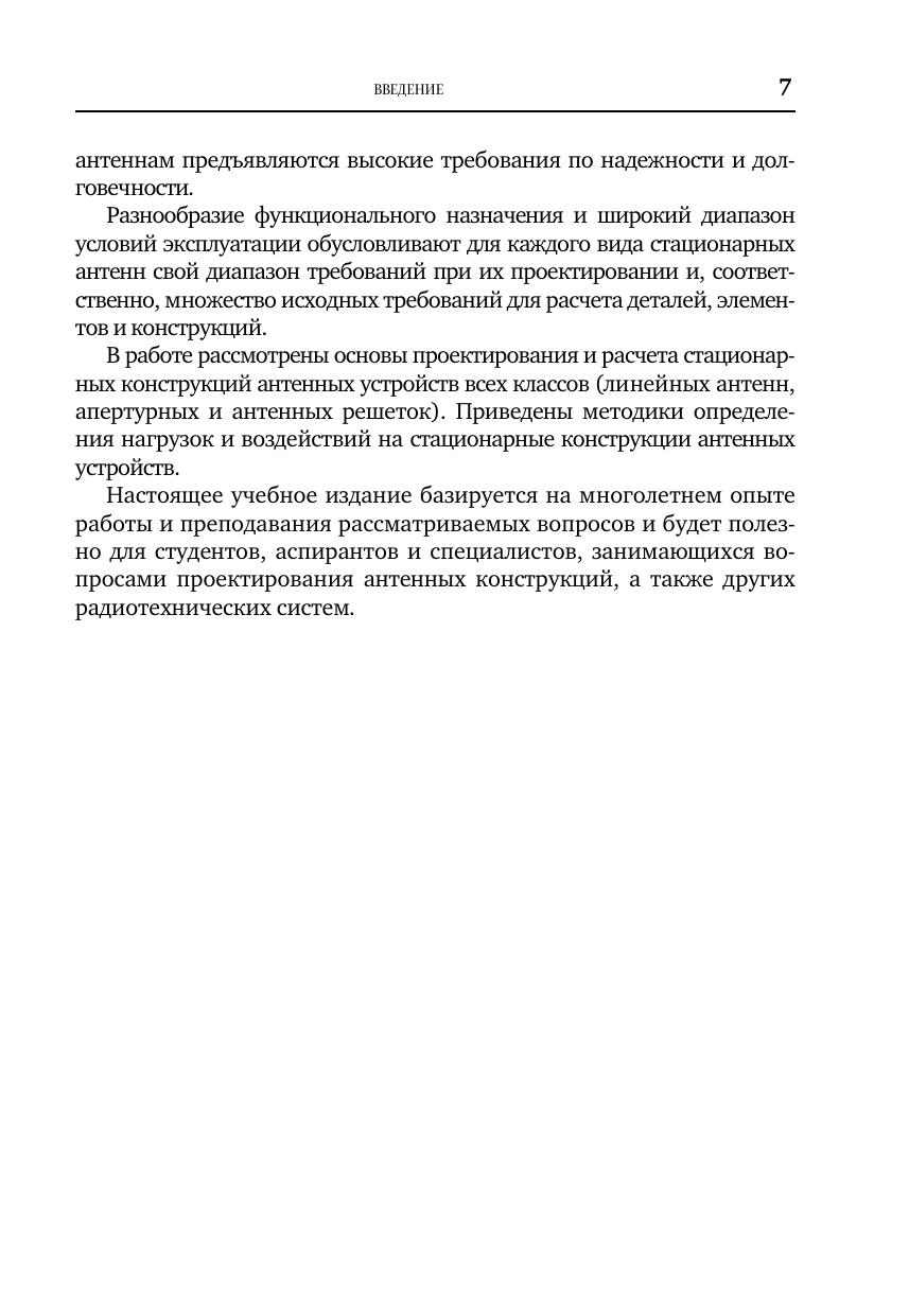 Изложены основы конструктивных решений линейных антенн, их токонесущих и силовых частей, апертурных, зеркальных, линзовых и рупорных антенн и ФАР. Даны типовые конструктивные решения опор, башен, мачт. Приведены оценки видов воздействий на стационарные антенны: ветровые, климатические, температурные, гололедные, гравитационные, сейсмические, эксплуатационные и др. Рассмотрены методы расчета элементов и узлов антенн на прочность и жесткость на этапах проектирования. Даны рекомендации по оценке и выбору рациональных конструкций и технических решений. Для студентов, обучающихся по специализации «Проектирование конструкций и систем радиотехнических информационных комплексов» может быть полезен аспирантам и специалистам, занимающихся вопросами проектирования антенных конструкций, а также других радиотехнических систем.
