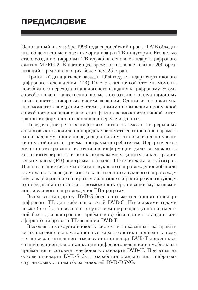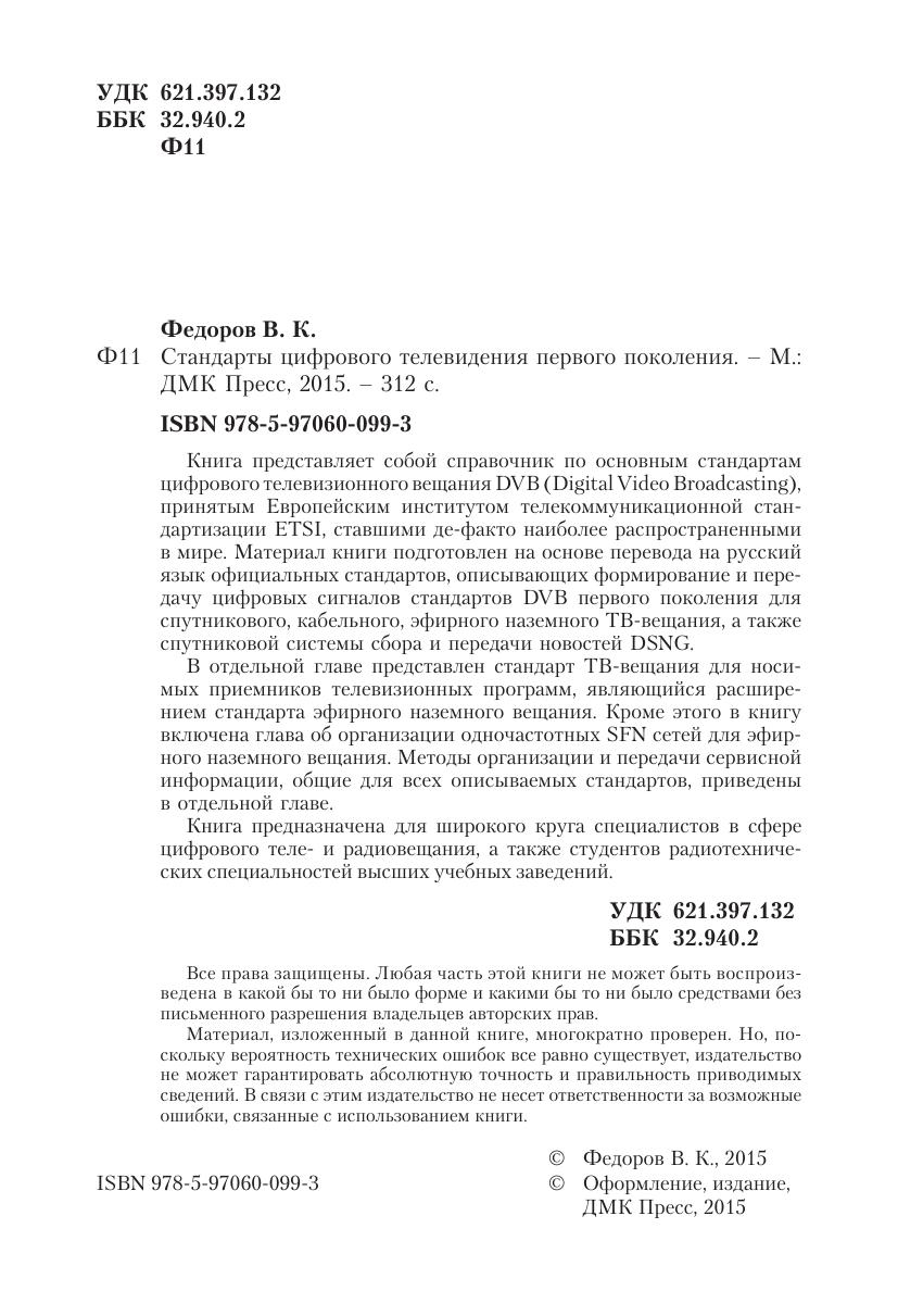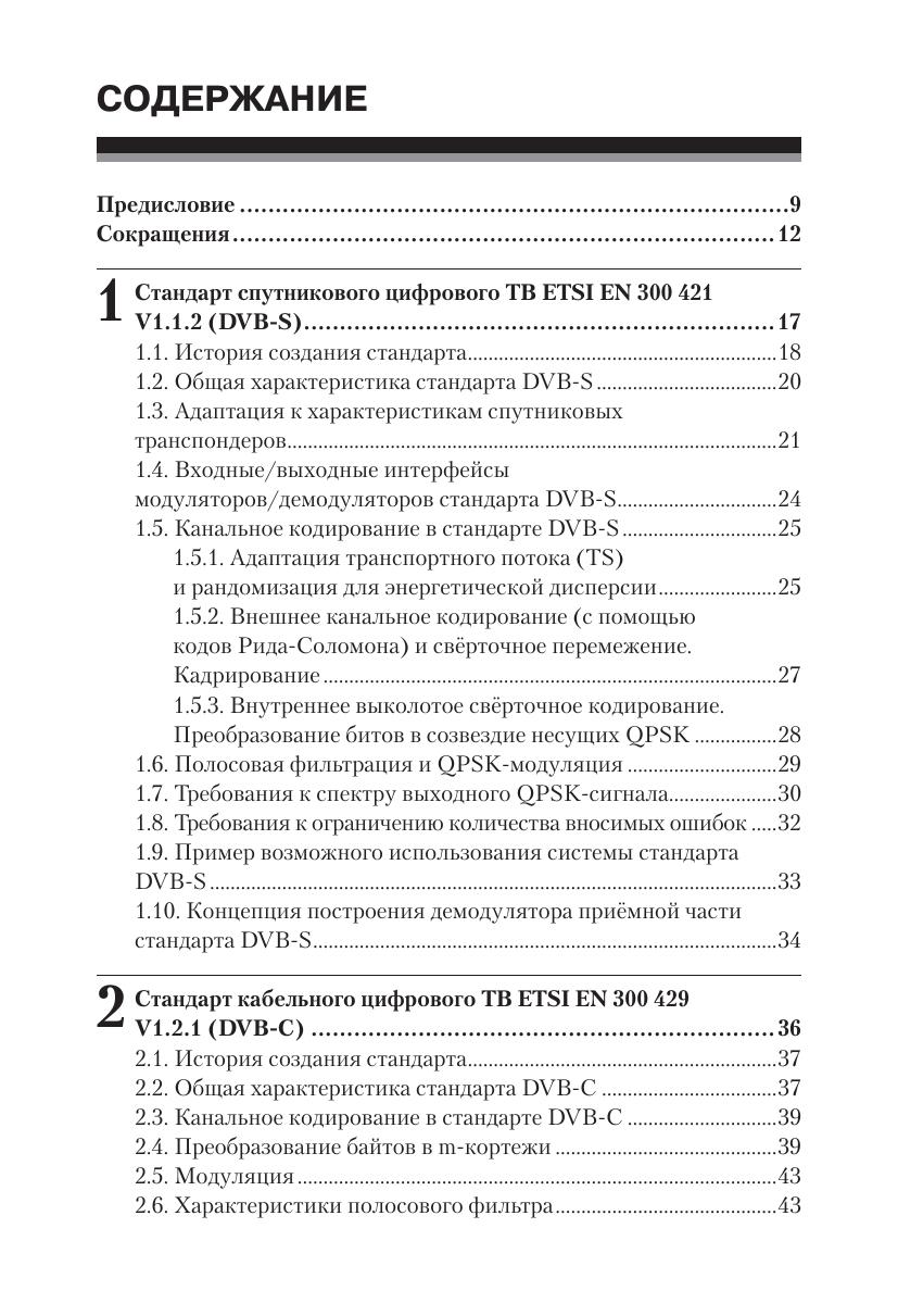 Книга представляет собой справочник по основным стандартам цифрового телевизионного вещания DVB (Digital Video Broadcasting), принятым Европейским институтом телекоммуникационной стандартизации ETSI, ставшими де-факто наиболее распространенными в мире. Материал книги подготовлен на основе перевода на русский язык официальных стандартов, описывающих формирование и передачу цифровых сигналов стандартов DVB первого поколения для спутникового, кабельного, эфирного наземного ТВ-вещания, а также спутниковой системы сбора и передачи новостей DSNG. В отдельной главе представлен стандарт ТВ-вещания для носимых приемников телевизионных программ, являющийся расширением стандарта эфирного наземного вещания. Кроме этого в книгу включена глава об организации одночастотных SFN сетей для эфирного наземного вещания. Методы организации и передачи сервисной информации, общие для всех описываемых стандартов, приведены в отдельной главе. Книга предназначена для широкого круга специалистов в сфере цифрового теле- и радиовещания, а также студентов радиотехнических специальностей высших учебных заведений.