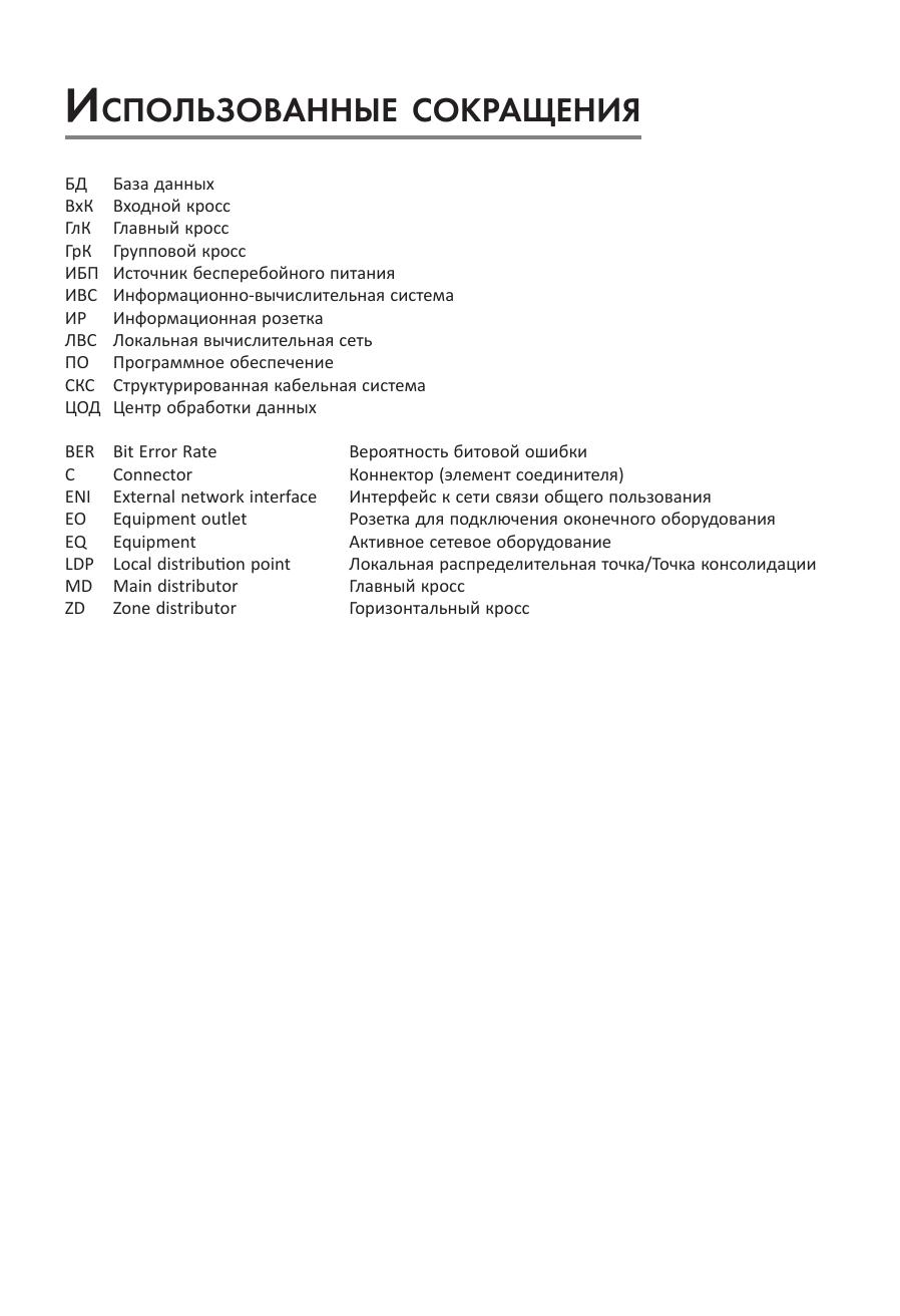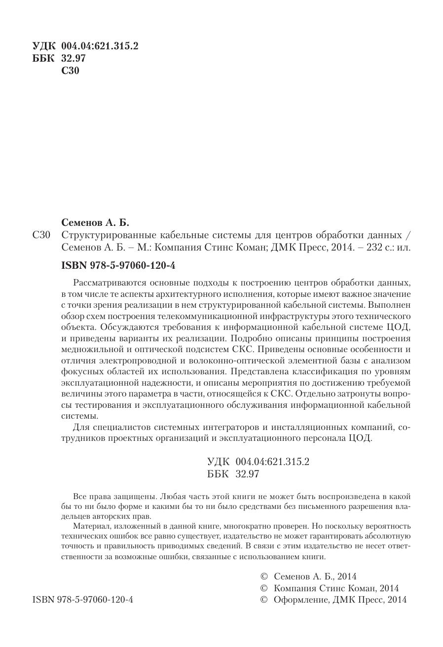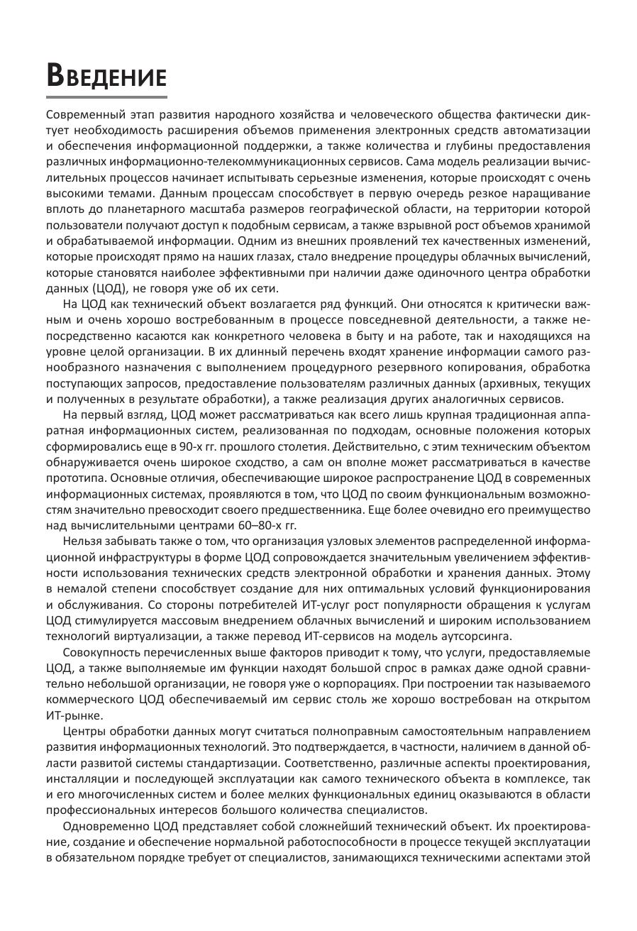 Рассматриваются основные подходы к построению центров обработки данных, в том числе те аспекты архитектурного исполнения, которые имеют важное значение с точки зрения реализации в нем структурированной кабельной системы. Выполнен обзор схем построения телекоммуникационной инфраструктуры этого технического объекта. Обсуждаются требования к информационной кабельной системе ЦОД, и приведены варианты их реализации. Подробно описаны принципы построения медножильной и оптической подсистем СКС. Приведены основные особенности и отличия электропроводной и волоконно-оптической элементной базы с анализом фокусных областей их использования. Представлена классификация по уровням эксплуатационной надежности, и описаны мероприятия по достижению требуемой величины этого параметра в части, относящейся к СКС. Отдельно затронуты вопросы тестирования и эксплуатационного обслуживания информационной кабельной системы. Для специалистов системных интеграторов и инсталляционных компаний, сотрудников проектных организаций и эксплуатационного персонала ЦОД.