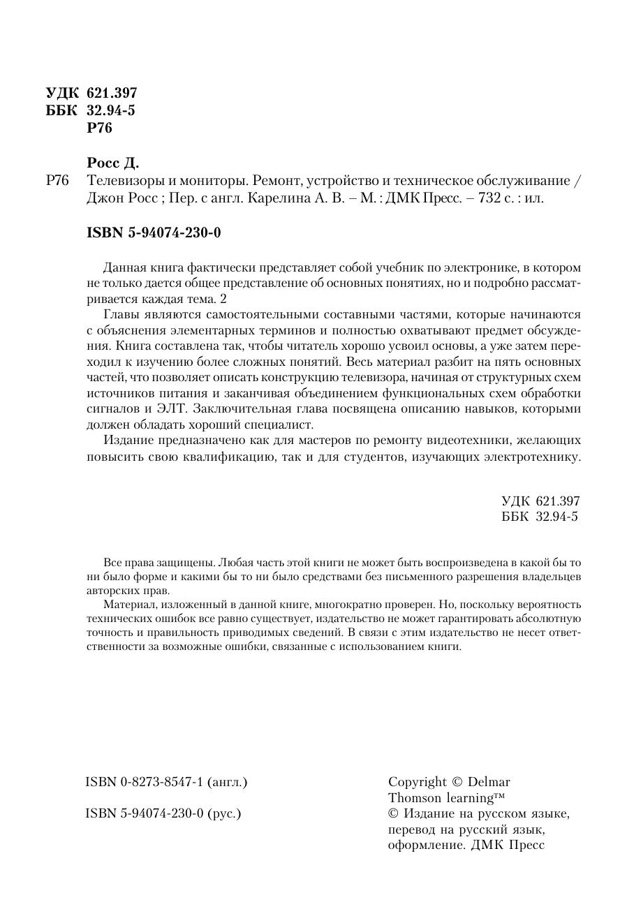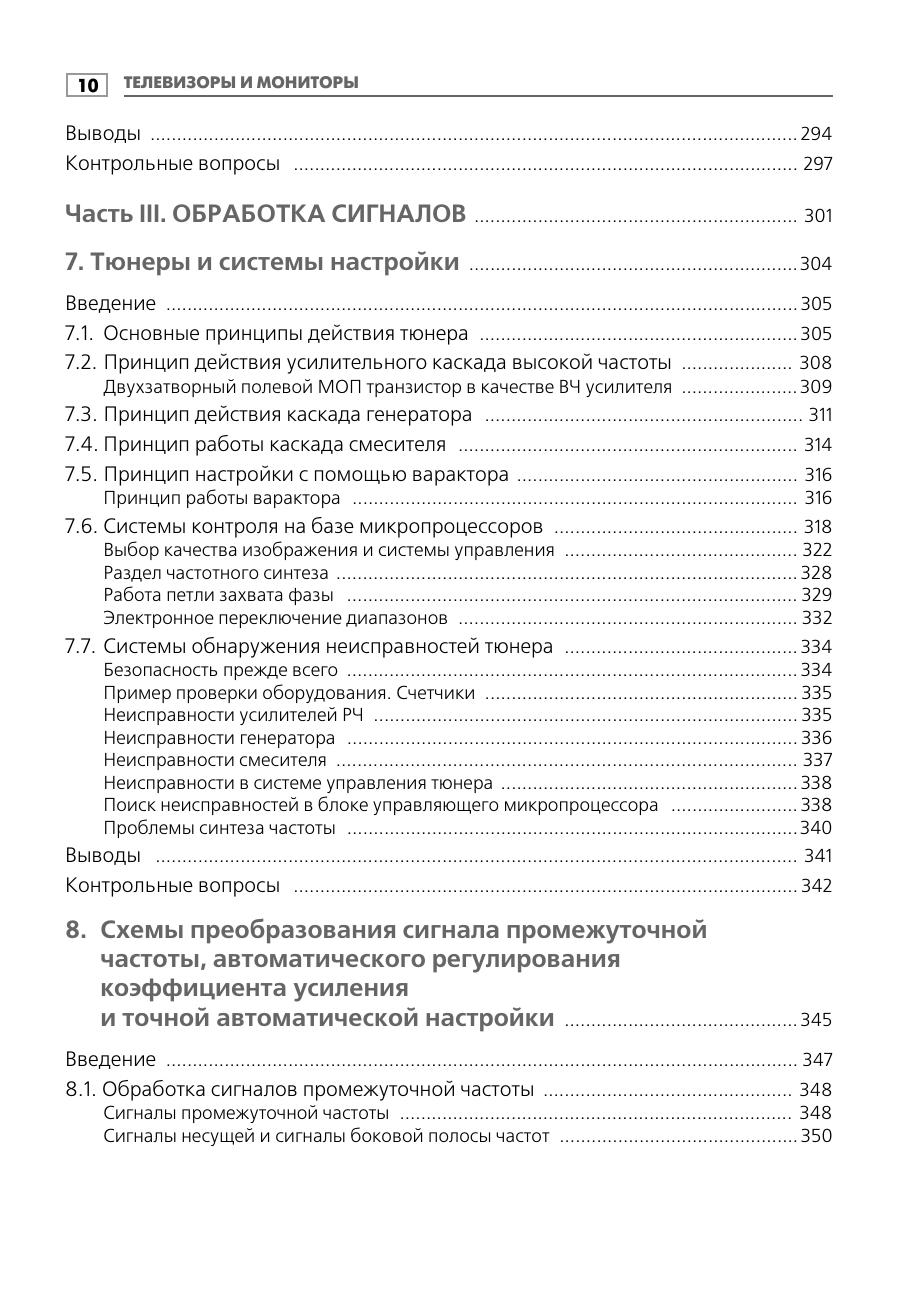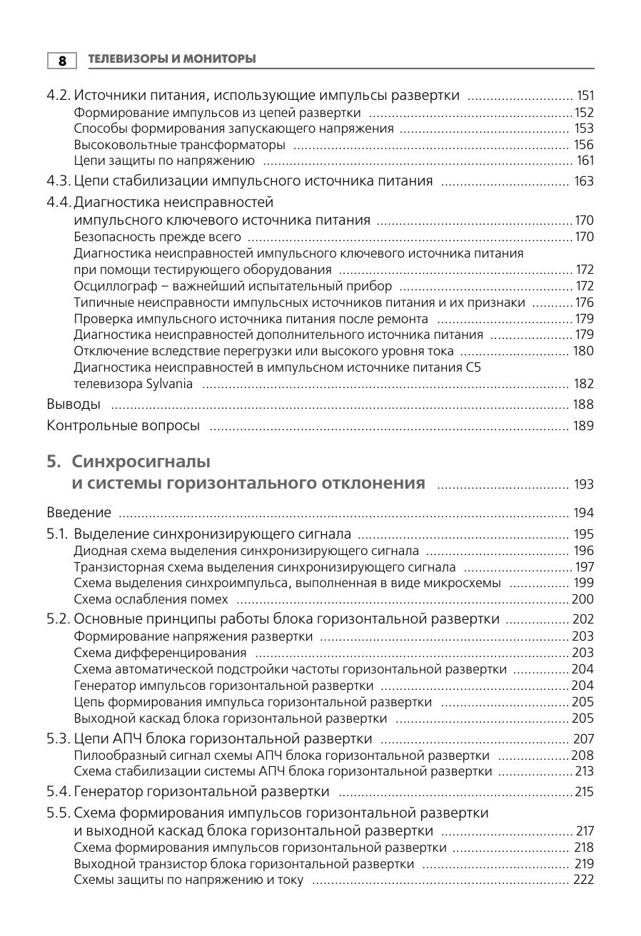 Данная книга фактически представляет собой учебник по электронике, в котором не только дается общее представление об основных понятиях, но и подробно рассматривается каждая тема.Главы являются самостоятельными составными частями, которые начинаются с объяснения элементарных терминов и полностью охватывают предмет обсуждения. Книга составлена так, чтобы читатель хорошо усвоил основы, а уже затем переходил к изучению более сложных понятий. Весь материал разбит на пять основных частей, что позволяет описать конструкцию телевизора, начиная от структурных схем источников питания и заканчивая объединением функциональных схем обработки сигналов и ЭЛТ. Заключительная глава посвящена описанию навыков, которыми должен обладать хороший специалист.Издание предназначено как для мастеров по ремонту видеотехники, желающих повысить свою квалификацию, так и для студентов, изучающих электротехнику.