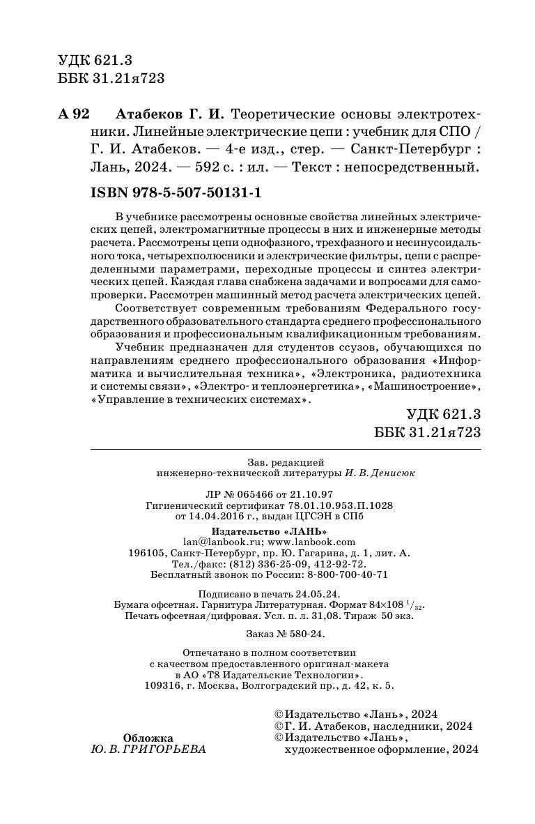 В учебнике рассмотрены основные свойства линейных электрических цепей, электромагнитные процессы в них и инженерные методы расчета. Рассмотрены цепи однофазного, трехфазного и несинусоидального тока, четырехполюсники и электрические фильтры, цепи с распределенными параметрами, переходные процессы и синтез электрических цепей. Каждая глава снабжена задачами и вопросами для самопроверки. Рассмотрен машинный метод расчета электрических цепей. Соответствует современным требованиям Федерального государственного образовательного стандарта среднего профессионального образования и профессиональным квалификационным требованиям. Учебник предназначен для студентов, обучающихся по направлениям среднего профессионального образования «Информатика и вычислительная техника», «Электроника, радиотехника и системы связи», «Электро- и теплоэнергетика», «Машиностроение», «Управление в технических системах».