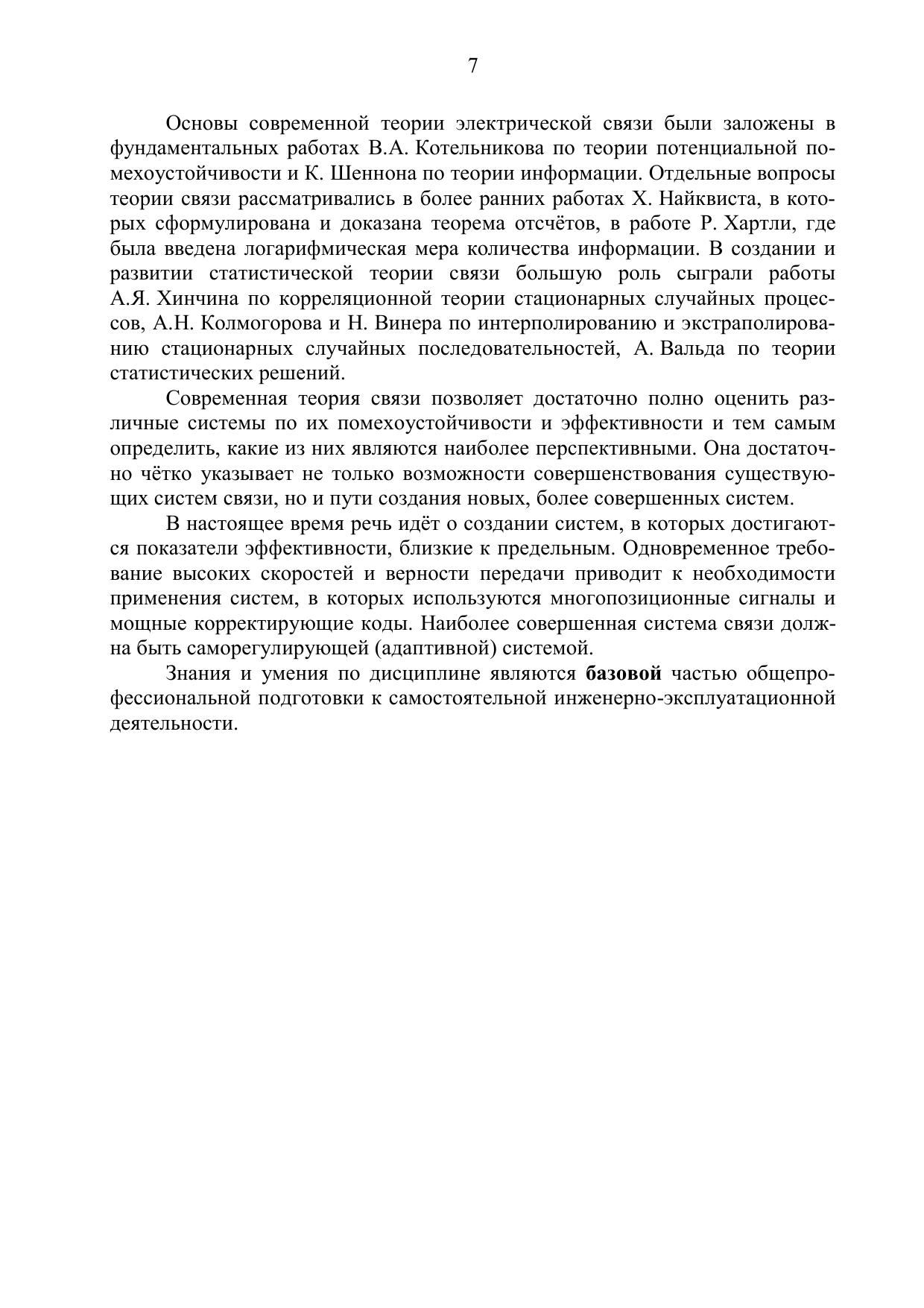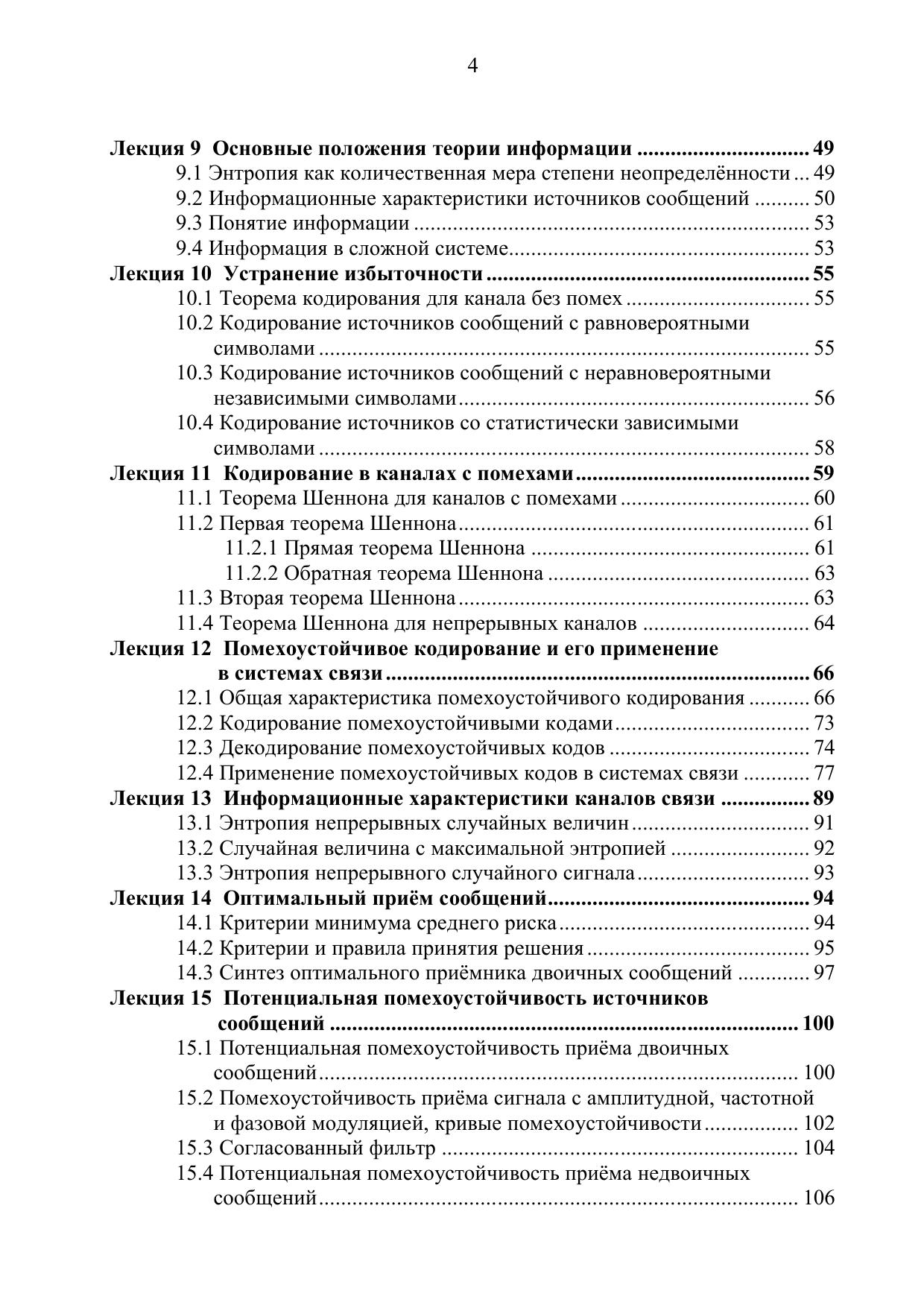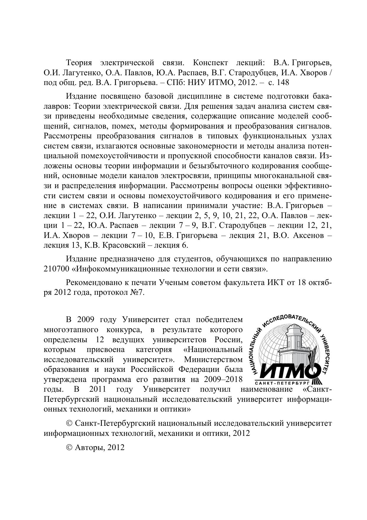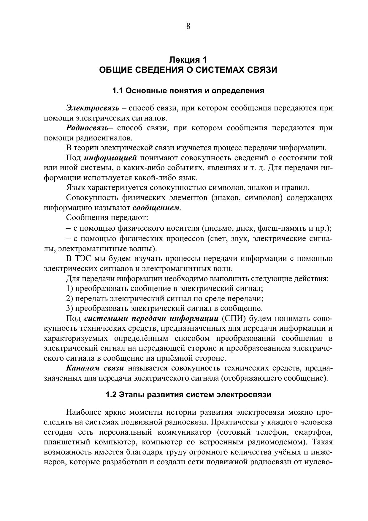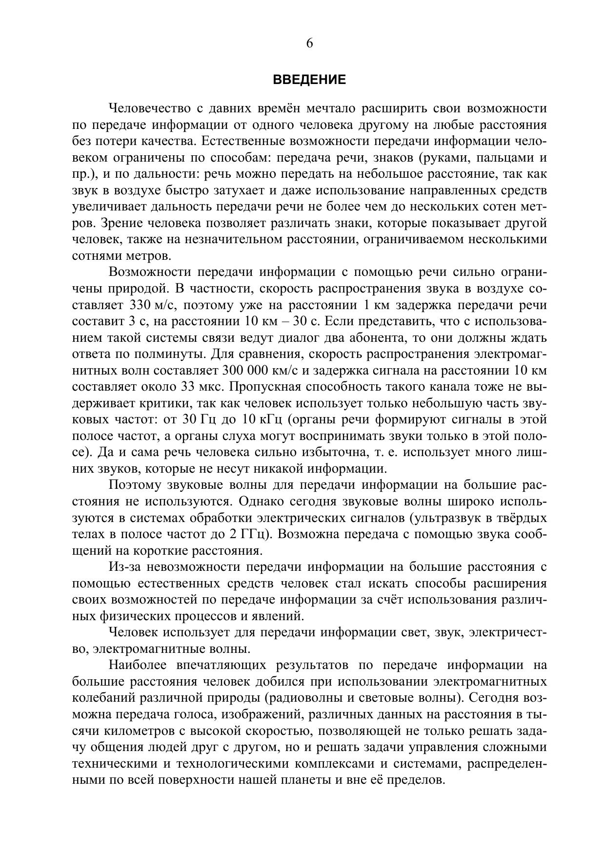 Издание посвящено базовой дисциплине в системе подготовки бакалавров: Теории электрической связи. Для решения задач анализа систем связи приведены необходимые сведения, содержащие описание моделей сообщений, сигналов, помех, методы формирования и преобразования сигналов. Рассмотрены преобразования сигналов в типовых функциональных узлах систем связи, излагаются основные закономерности и методы анализа потенциальной помехоустойчивости и пропускной способности каналов связи. Изложены основы теории информации и безызбыточного кодирования сообщений, основные модели каналов электросвязи, принципы многоканальной связи и распределения информации. Рассмотрены вопросы оценки эффективности систем связи и основы помехоустойчивого кодирования и его применение в системах связи.