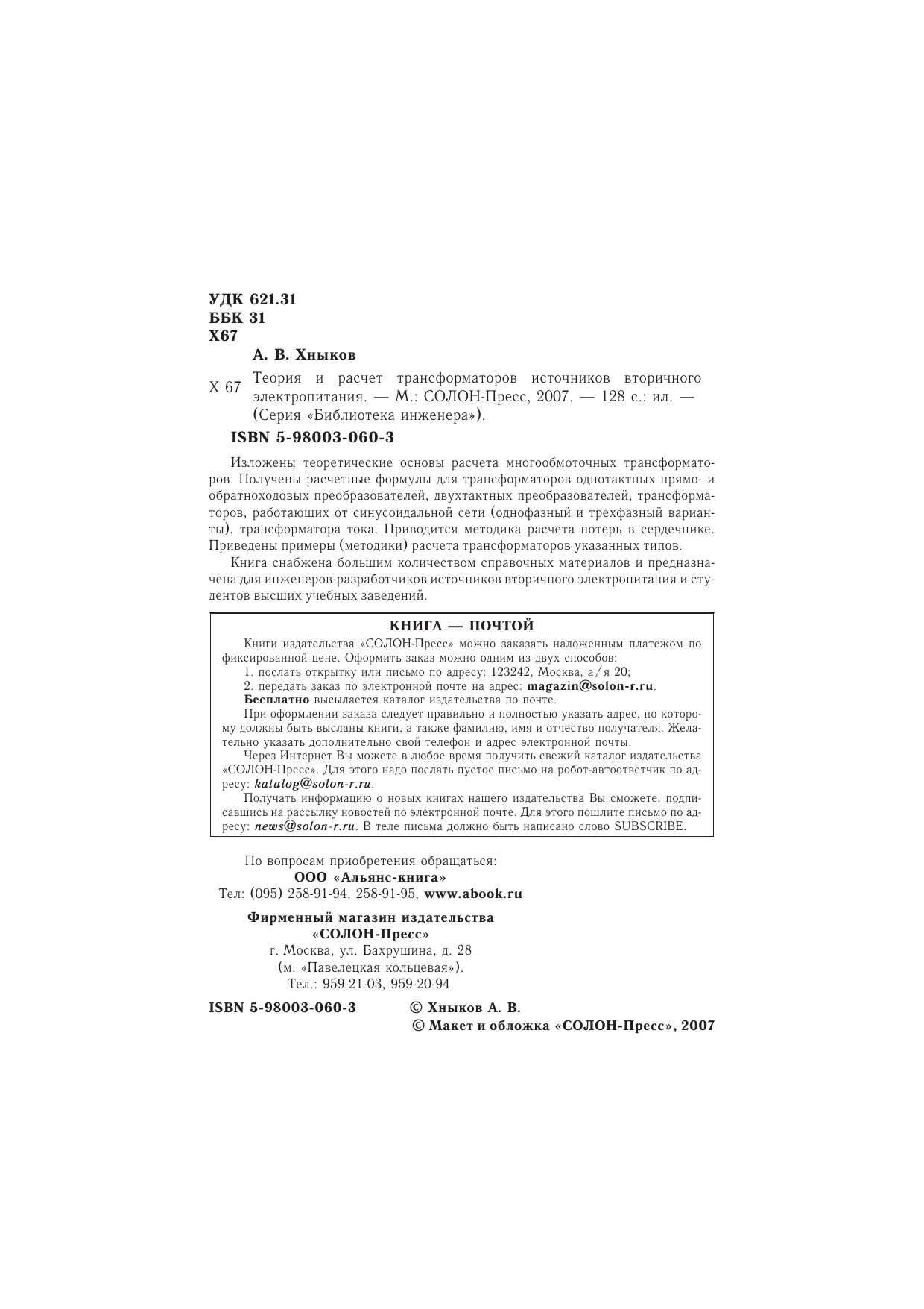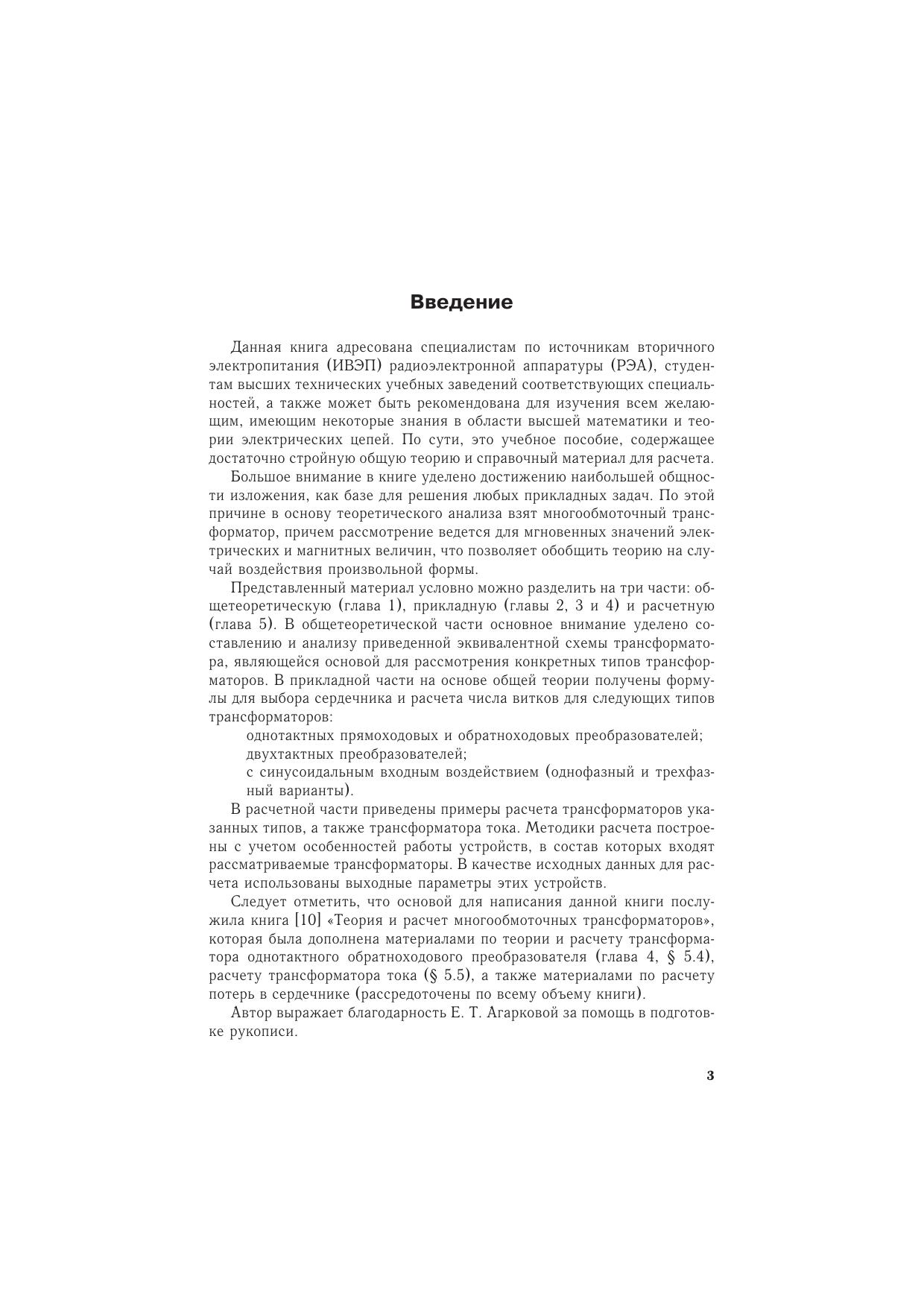 Изложены теоретические основы расчета многообмоточных трансформаторов. Получены расчетные формулы для трансформаторов однотактных прямо- и обратноходовых преобразователей, двухтактных преобразователей, трансформаторов, работающих от синусоидальной сети (однофазный и трехфазный варианты), трансформатора тока. Приводится методика расчета потерь в сердечнике. Приведены примеры (методики) расчета трансформаторов указанных типов.Книга снабжена большим количеством справочных материалов и предназначена для инженеров-разработчиков источников вторичного электропитания и студентов высших учебных заведений.