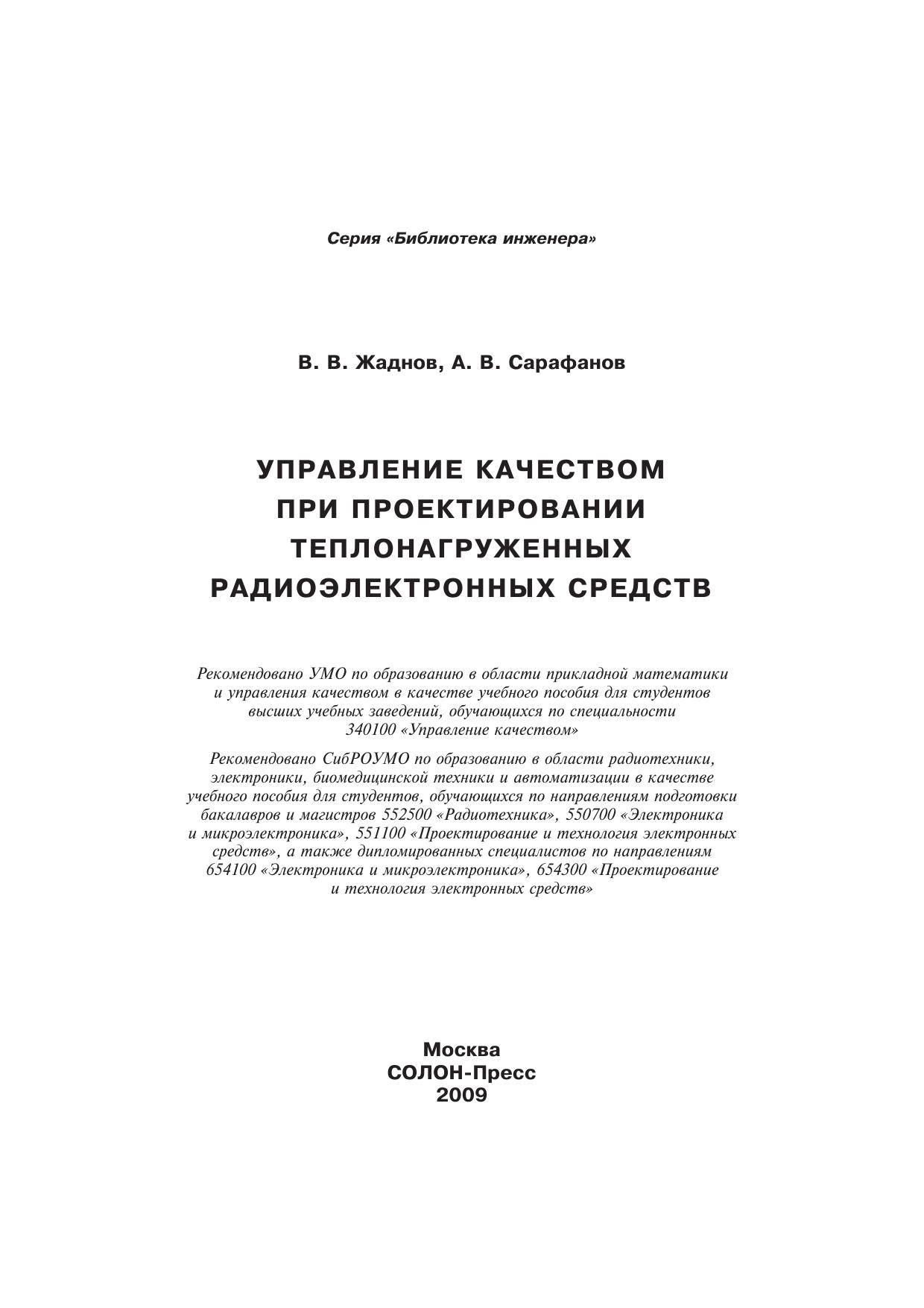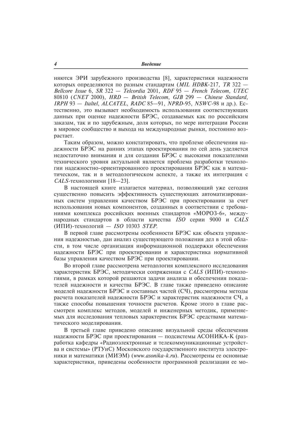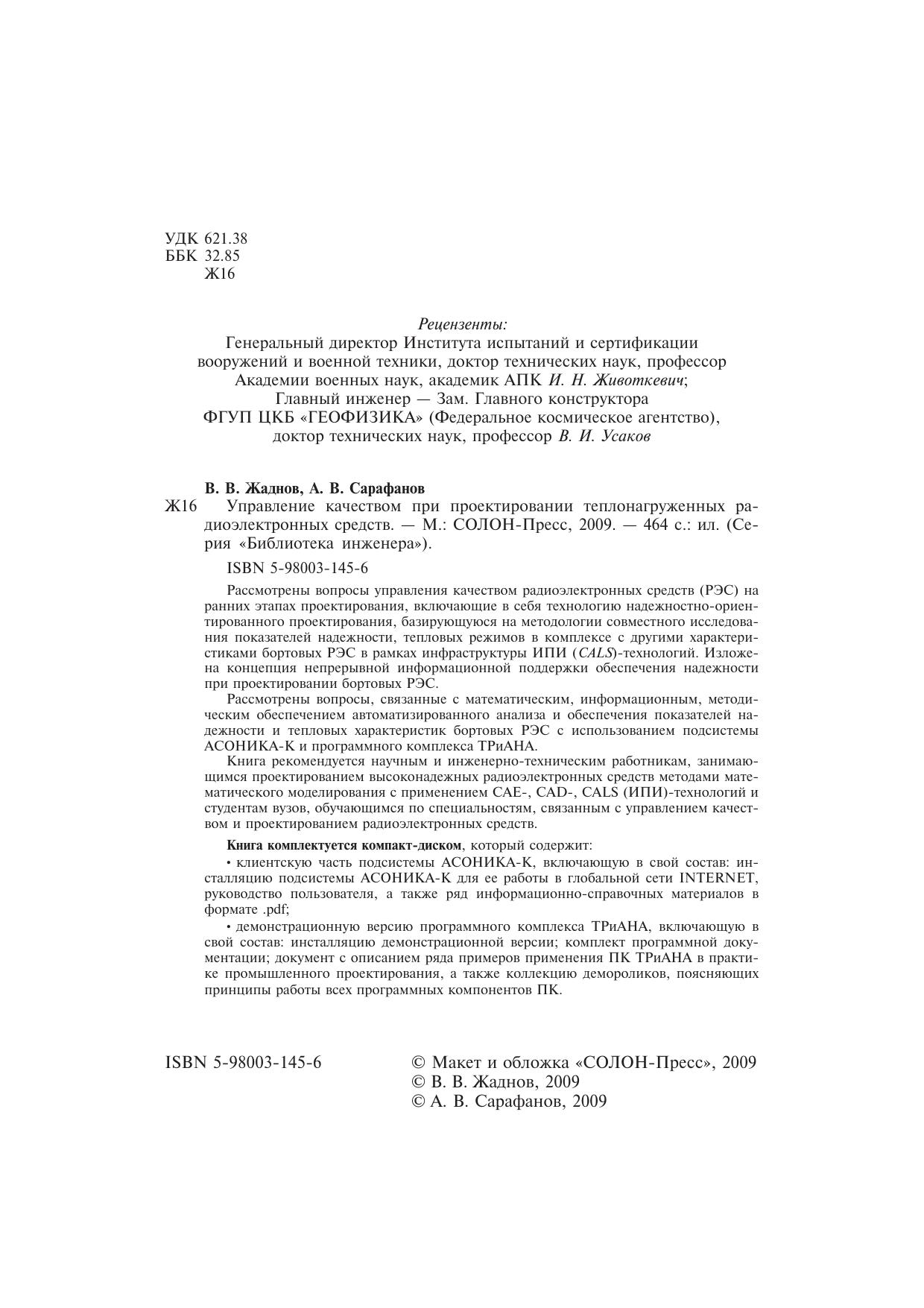 Рассмотрены вопросы управления качеством радиоэлектронных средств (РЭС) на ранних этапах проектирования, включающие в себя технологию надежностно-ориентированного проектирования, базирующуюся на методологии совместного исследования показателей надежности, тепловых режимов в комплексе с другими характеристиками бортовых РЭС в рамках инфраструктуры ИПИ (С4Х^)-технологий. Изложена концепция непрерывной информационной поддержки обеспечения надежности при проектировании бортовых РЭС.Рассмотрены вопросы, связанные с математическим, информационным, методическим обеспечением автоматизированного анализа и обеспечения показателей надежности и тепловых характеристик бортовых РЭС с использованием подсистемы АСОНИКА-К и программного комплекса ТРиАНА.Книга рекомендуется научным и инженерно-техническим работникам, занимающимся проектированием высоконадежных радиоэлектронных средств методами математического моделирования с применением CAE-, CAD-, CALS (ИПИ)-технологий и студентам вузов, обучающимся по специальностям, связанным с управлением качеством и проектированием радиоэлектронных средств.