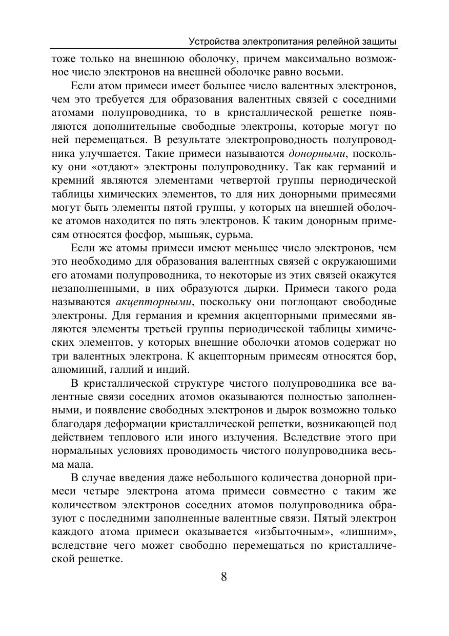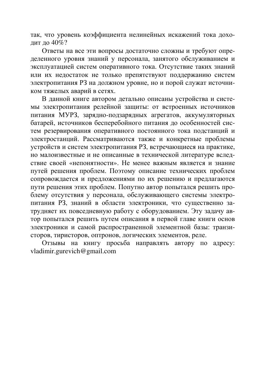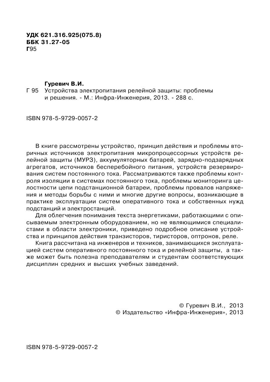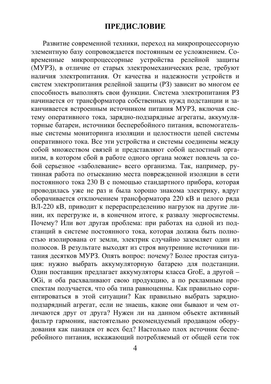 В книге рассмотрены устройство, принцип действия и проблемы вторичных источников электропитания микропроцессорных устройств релейной защиты (МУРЗ), аккумуляторных батарей, зарядно-подзарядных агрегатов, источников бесперебойного питания, устройств резервирования систем постоянного тока. Рассматриваются также проблемы контроля изоляции в системах постоянного тока, проблемы мониторинга целостности цепи подстанционной батареи, проблемы провалов напряжения и методы борьбы с ними и многие другие вопросы, возникающие в практике эксплуатации систем оперативного тока и собственных нужд подстанций и электростанций. Для облегчения понимания текста энергетиками, работающими с описываемым электронным оборудованием, но не являющимися специалистами в области электроники, приведено подробное описание устройства и принципов действия транзисторов, тиристоров, оптронов, реле. Книга рассчитана на инженеров и техников, занимающихся эксплуатацией систем оперативного постоянного тока и релейной защиты, а также может быть полезна преподавателям и студентам соответствующих дисциплин средних и высших учебных заведений.