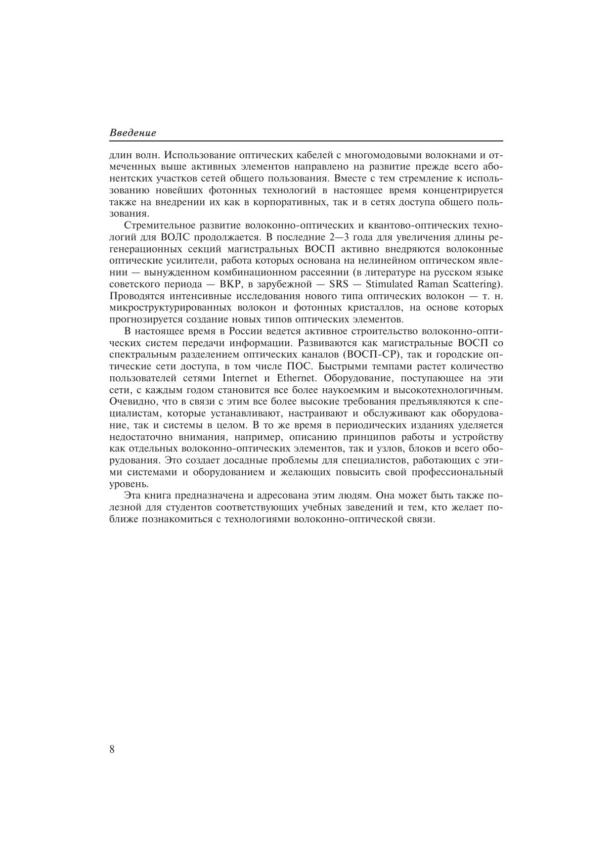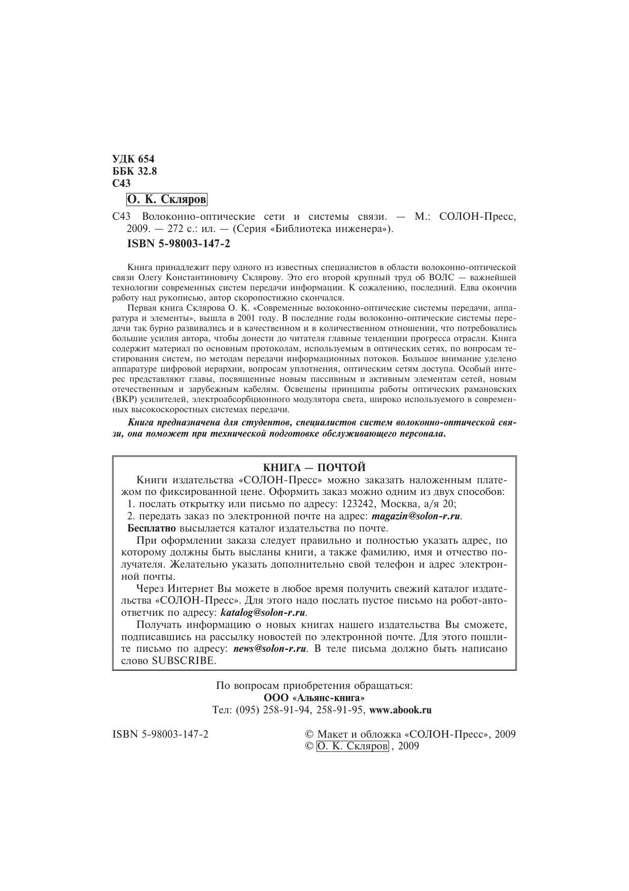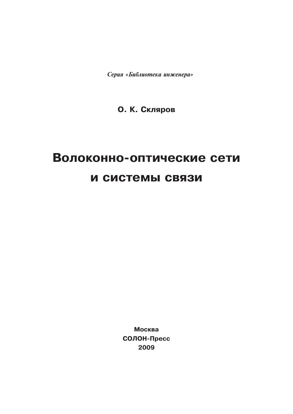 Книга принадлежит перу одного из известных специалистов в области волоконно-оптической связи Олегу Константиновичу Склярову. Это его второй крупный труд об ВОЛС — важнейшей технологии современных систем передачи информации. К сожалению, последний. Едва окончив работу над рукописью, автор скоропостижно скончался.Первая книга Склярова О. К. «Современные волоконно-оптические системы передачи, аппаратура и элементы», вышла в 2001 году. В последние годы волоконно-оптические системы передачи так бурно развивались и в качественном и в количественном отношении, что потребовались большие усилия автора, чтобы донести до читателя главные тенденции прогресса отрасли. Книга содержит материал по основным протоколам, используемым в оптических сетях, по вопросам тестирования систем, по методам передачи информационных потоков. Большое внимание уделено аппаратуре цифровой иерархии, вопросам уплотнения, оптическим сетям доступа. Особый интерес представляют главы, посвященные новым пассивным и активным элементам сетей, новым отечественным и зарубежным кабелям. Освещены принципы работы оптических рамановских (ВКР) усилителей, электроабсорбционного модулятора света, широко используемого в современных высокоскоростных системах передачи.Книга предназначена для студентов, специалистов систем волоконно-оптической связи, она поможет при технической подготовке обслуживающего персонала.