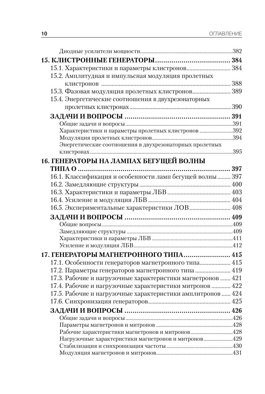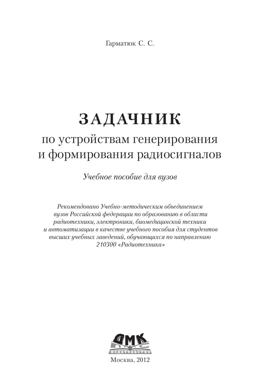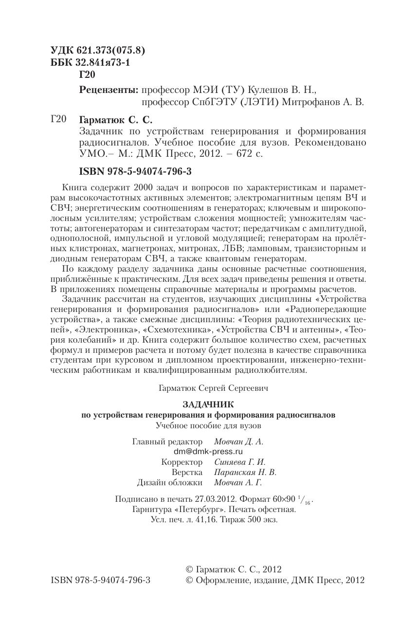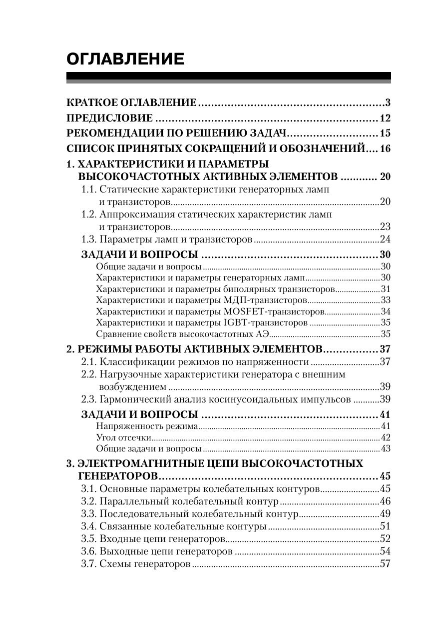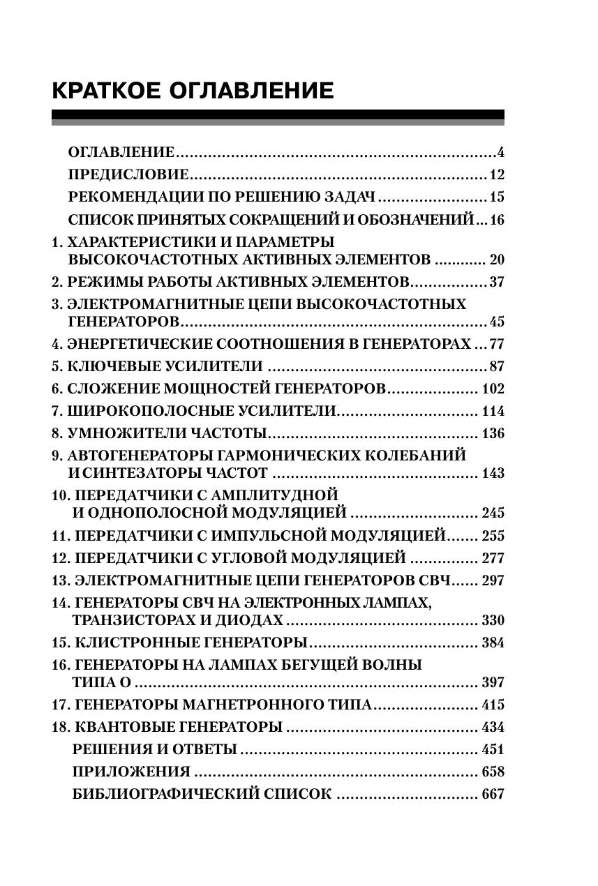 Книга содержит 2000 задач и вопросов по характеристикам и параметрам высокочастотных активных элементов, электромагнитным цепям ВЧ и СВЧ, энергетическим соотношениям в генераторах, ключевым и широкополосным усилителям, устройствам сложения мощностей, множителям частоты, автогенераторам и синтезаторам частот, передатчикам с амплитудной, однополосной, импульсной и угловой модуляцией, генераторам на пролётных клистронах, магнетронах, митронах, ЛБВ, ламповым, транзисторным и диодным генераторам СВЧ, а также квантовым генераторам. По каждому разделу задачника даны основные расчетные соотношения, приближённые к практическим. Для всех задач приведены решения и ответы. В приложениях помещены справочные материалы и программы расчетов. Задачник рассчитан на студентов, изучающих дисциплины «Устройства генерирования и формирования радиосигналов» или «Радиопередающие устройства», а также смежные дисциплины: «Теория радиотехнических цепей», «Электроника», «Схемотехника», «Устройства СВЧ и антенны», «Теория колебаний» и др. Книга содержит большое количество схем, расчетных формул и примеров расчета и потому будет полезна в качестве справочника студентам при курсовом и дипломном проектировании, инженерно-техническим работникам и квалифицированным радиолюбителям.
