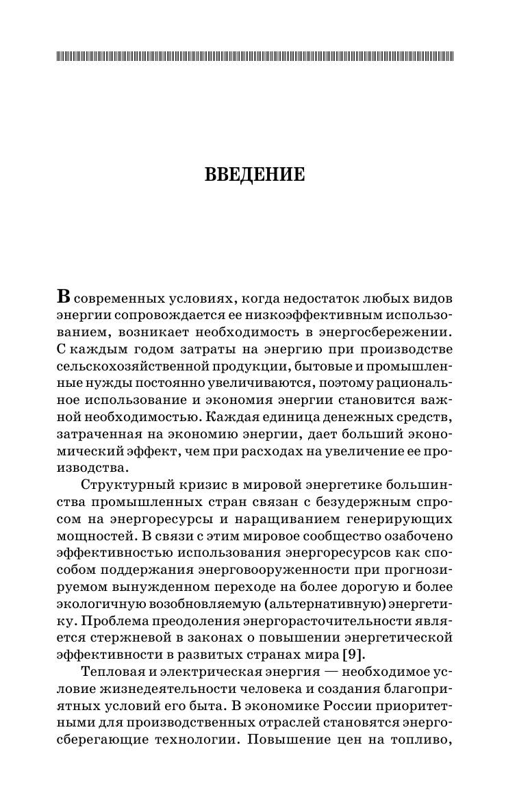 Излагаются основы энергосбережения в сельском хозяйства как многофункционального процесса с учетом агротехнологических и антропогенных факторов. Изложены исторический и мировой опыт энергосбережения. Рассмотрены характеристики топливно-энергетических ресурсов и возобновляемых источников энергии. Используются такие понятия, как энергетический анализ и энергоемкость сельскохозяйственной продукции, энергетический эквивалент, содержание и энергетическая эффективность сельскохозяйственной продукции, материалов, техники и удобрений. Приведены методические основы и примеры энергетического анализа в растениеводстве и животноводстве, зданий, теплиц и хранилищ, машинно-тракторного парка и электрооборудования. Даны основы энергоаудита и особенности его проведения в сельском хозяйстве. Предназначен для студентов аграрных вузов, обучающихся по направлению «Агроинженерия» (бакалавры). Может использоваться при образовательной подготовке и повышении квалификации энергоаудиторов для проведения энергетических обследований в сельском хозяйстве.