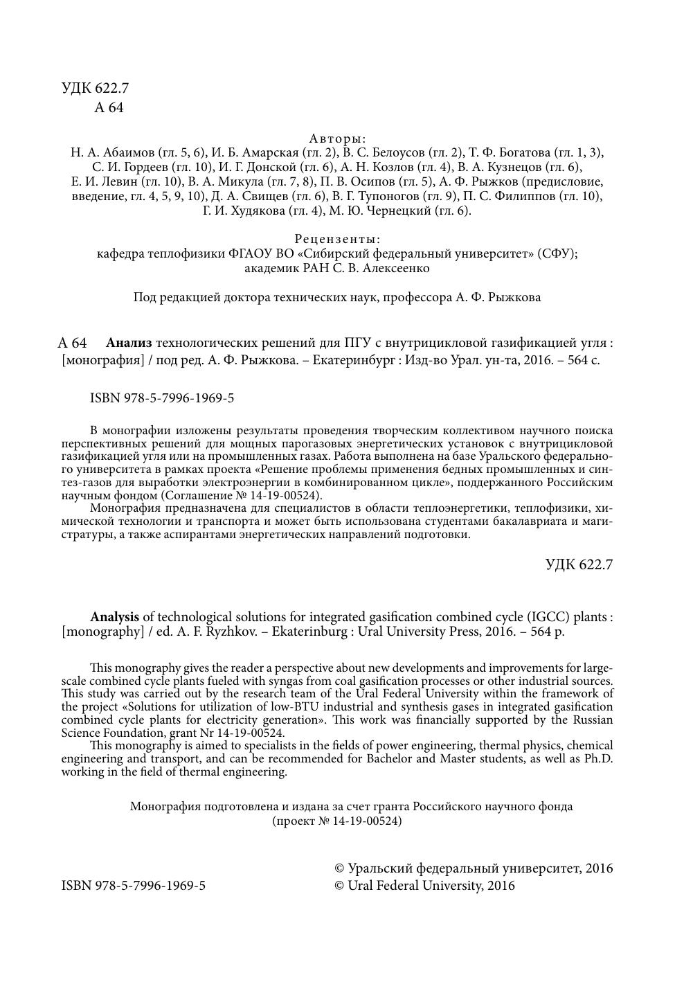 В монографии изложены результаты проведения творческим коллективом научного поиска перспективных решений для мощных парогазовых энергетических установок с внутрицикловой газификацией угля или на промышленных газах. Работа выполнена на базе Уральского федерального университета в рамках проекта «Решение проблемы применения бедных промышленных и синтез-газов для выработки электроэнергии в комбинированном цикле», поддержанного Российским научным фондом (Соглашение № 14-19-00524). Монография предназначена для специалистов в области теплоэнергетики, теплофизики, химической технологии и транспорта и может быть использована студентами бакалавриата и магистратуры, а также аспирантами энергетических направлений подготовки.