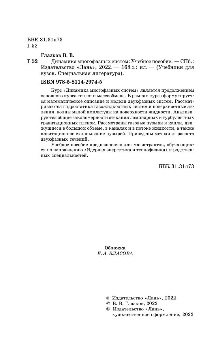 Курс «Динамика многофазных систем» является продолжением основного курса тепло- и массообмена. В рамках курса формулируется математическое описание и модели двухфазных систем. Рассматриваются гидростатика газожидкостных систем и поверхностные явления, волны малой амплитуды на поверхности жидкости. Анализируются общие закономерности стекания ламинарных и турбулентных гравитационных пленок. Рассмотрены газовые пузыри и капли, движущиеся в большом объеме, в каналах и в потоке жидкости, а также кавитационное схлопывание пузырей. Приведены методики расчета двухфазных течений. Учебное пособие предназначено для магистрантов, обучающихся по направлению «Ядерная энергетика и теплофизика» и родственных специальностей.