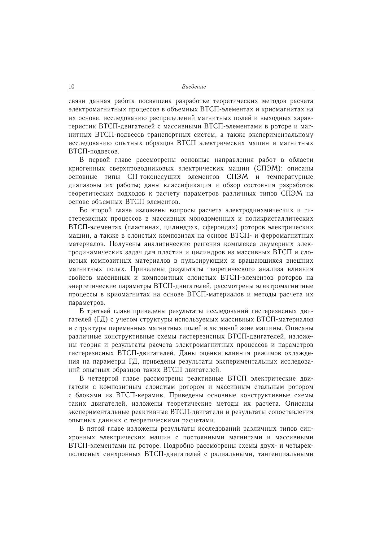 Рассматриваются новые типы электрических машин и систем линейного магнитного подвеса на основе массивных высокотемпературных сверхпроводниковых (ВТСП) материалов. Дан краткий обзор основных направлений работ в этой области. Приведены теоретические методы и результаты расчета электродинамических процессов в токонесущих элементах на основе ВТСП-элементов с монодоменной и поликристаллической структурой и криомагнитов с ВТСП-элементами. Рассмотрены теоретические методы расчета магнитных полей и энергетических параметров гистерезисных и реактивных ВТСП-двигателей. Описаны результаты экспериментальных исследований ВТСП-двигателей мощностью от 0,1 до 100 кВт при температуре на уровне жидкого азота (77 К) и жидкого водорода (20 К). Изложены теоретические методы расчета и результаты экспериментальных исследований синхронных ВТСП-двигателей и генераторов мощностью 10–500 кВт с ВТСП-элементами и постоянными магнитами. Показано, что новые типы ВТСП электрических машин по своим удельным массоэнергетическим показателям превосходят в 2–3 раза соответствующие показатели аналогичных электрических машин традиционного исполнения. Рассмотрены вопросы применения ВТСП электрических машин в энергетике, промышленности, криогенной и аэрокосмической технике. Изложены методы расчета и результаты экспериментальных исследований систем магнитного ВТСП-подвеса грузоподъемностью 500 кг. Книга представляет интерес для специалистов, работающих в области прикладной сверхпроводимости, электроэнергетики, электромеханики, криогенной и аэрокосмической техники, а также для студентов и аспирантов соответствующих специальностей.