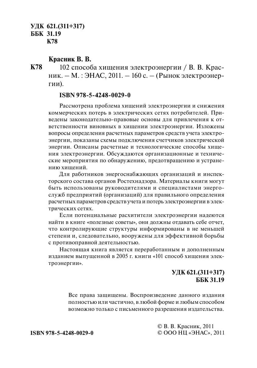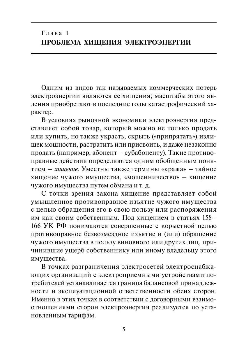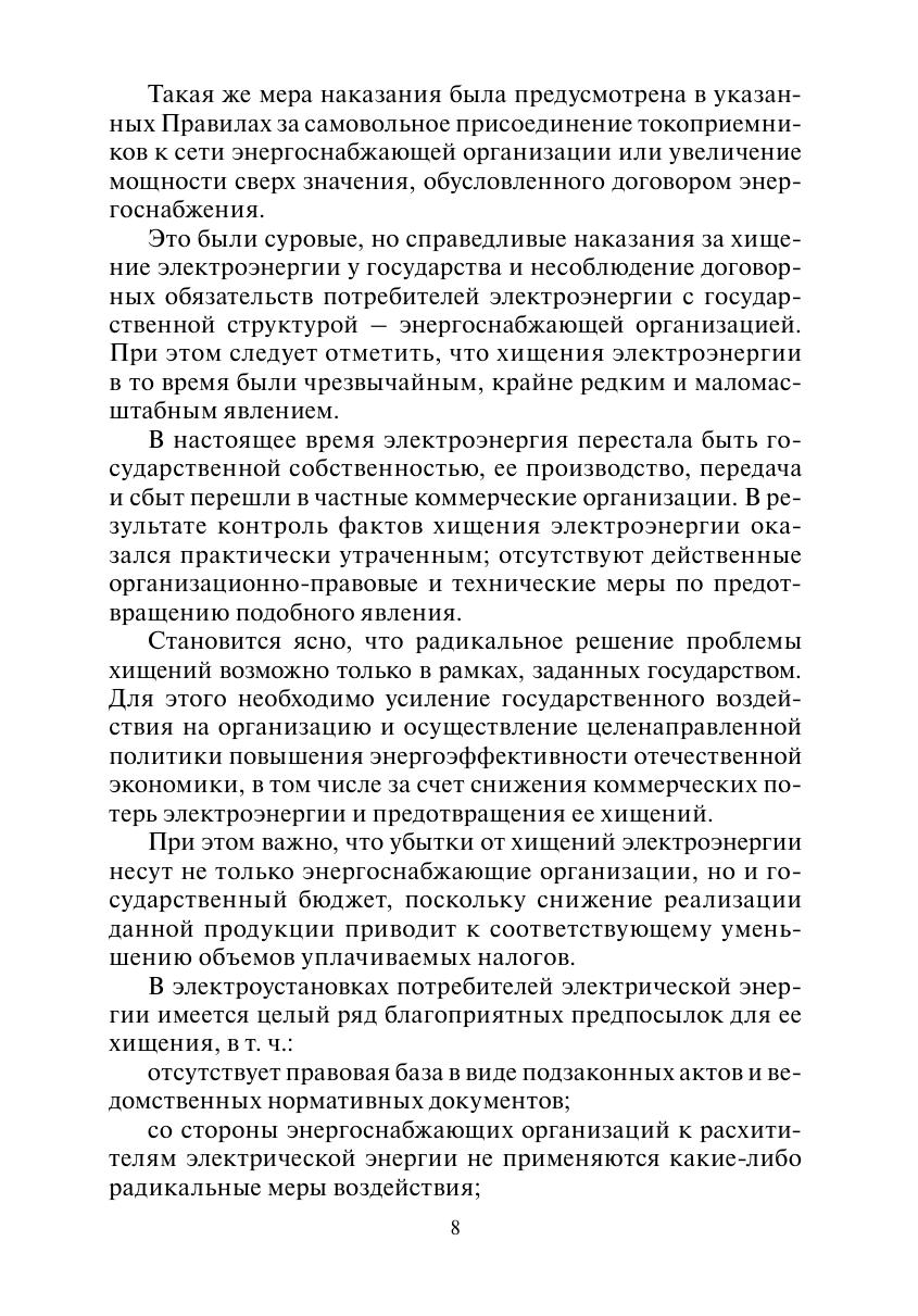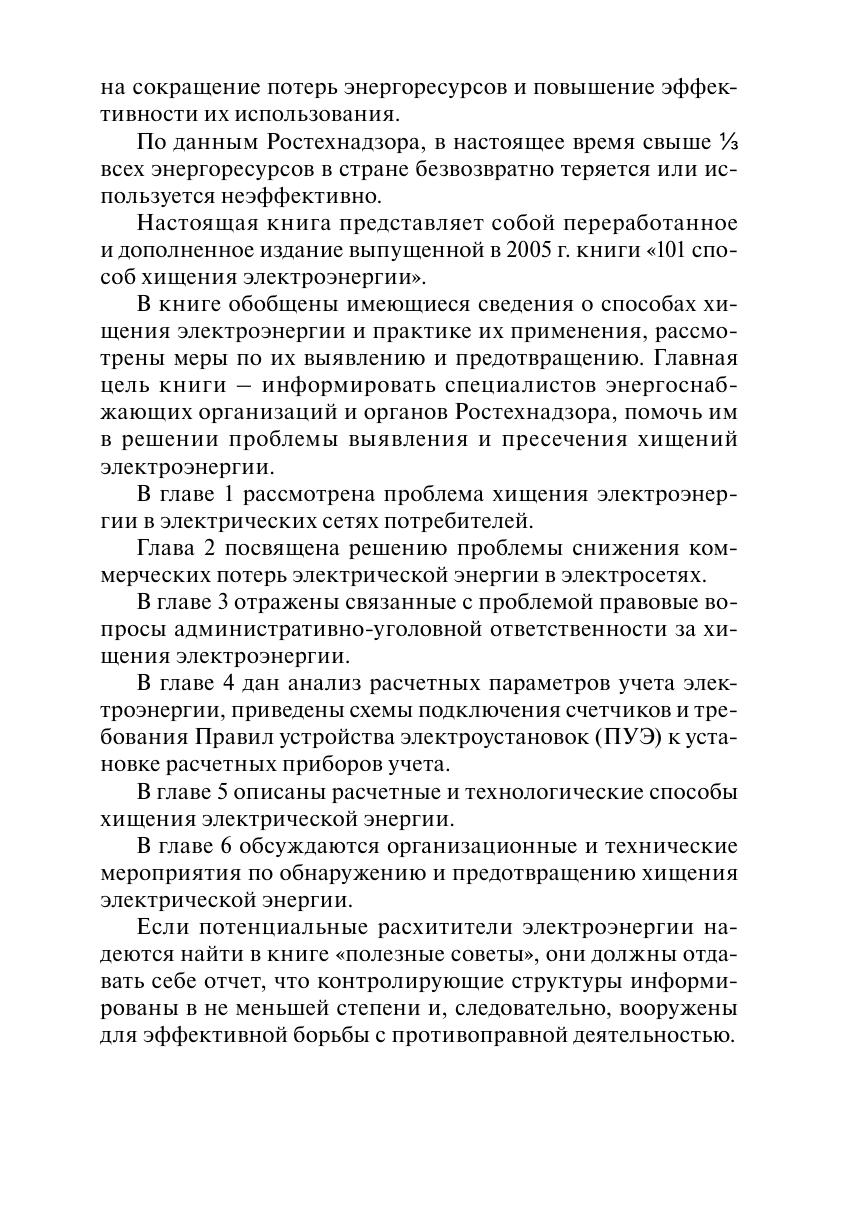 Настоящая книга является переработанным и дополненным изданием выпущенной в 2005 г. книги "101 способ хищения электроэнергии".Рассмотрена проблема хищений электроэнергии и снижения коммерческих потерь в электрических сетях потребителей. Приведены законодательно-правовые основы для привлечения к ответственности виновных в хищении электроэнергии. Изложены вопросы определения расчетных параметров средств учета электроэнергии, показаны схемы подключения счетчиков электрической энергии. Описаны расчетные и технологические способы хищения электроэнергии. Обсуждаются организационные и технические мероприятия по обнаружению, предотвращению и устранению хищений.Для работников энергоснабжающих организаций и инспекторского состава органов Ростехнадзора. Материалы книги могут быть использованы руководителями и специалистами энергослужб предприятий (организаций) для правильного определения расчетных параметров средств учета и потерь электроэнергии в электрических сетях.