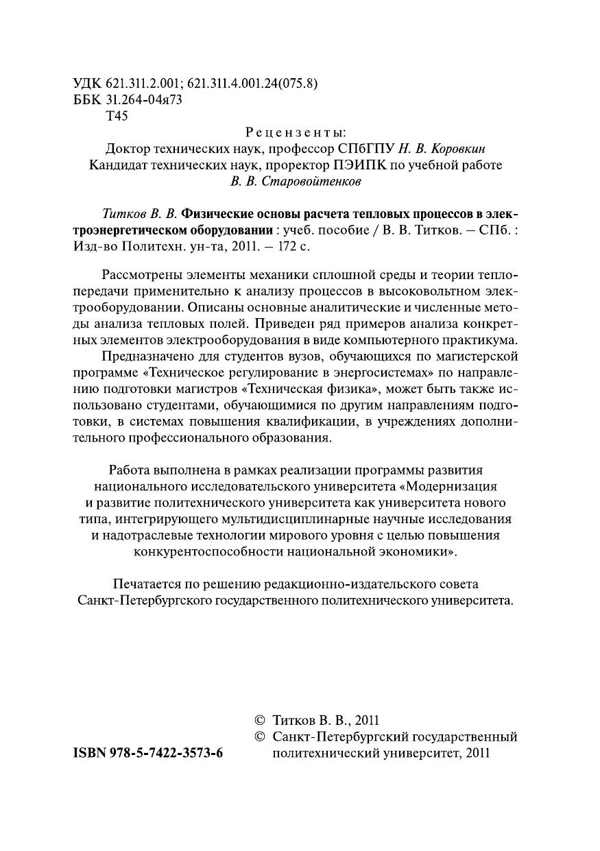 Рассмотрены элементы механики сплошной среды и теории теплопередачи применительно к анализу процессов в высоковольтном электрооборудовании. Описаны основные аналитические и численные методы анализа тепловых полей. Приведен ряд примеров анализа конкретных элементов электрооборудования в виде компьютерного практикума.Предназначено для студентов вузов, обучающихся по магистерской программе «Техническое регулирование в энергосистемах» по направлению подготовки магистров «Техническая физика», может быть также использовано студентами, обучающимися по другим направлениям подготовки, в системах повышения квалификации, в учреждениях дополнительного профессионального образования.Работа выполнена в рамках реализации программы развития национального исследовательского университета «Модернизация и развитие политехнического университета как университета нового типа, интегрирующего мультидисциплинарные научные исследования и надотраслевые технологии мирового уровня с целью повышения конкурентоспособности национальной экономики».