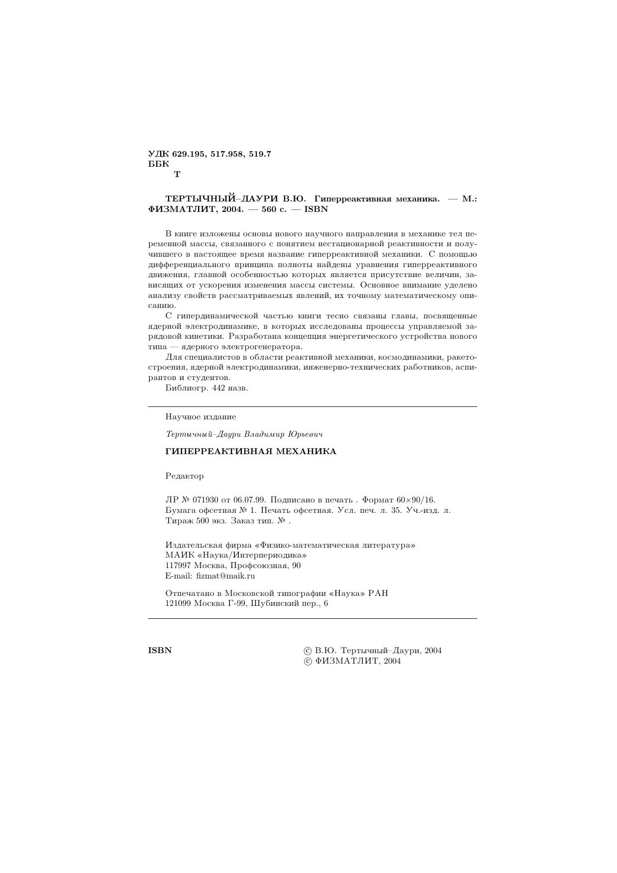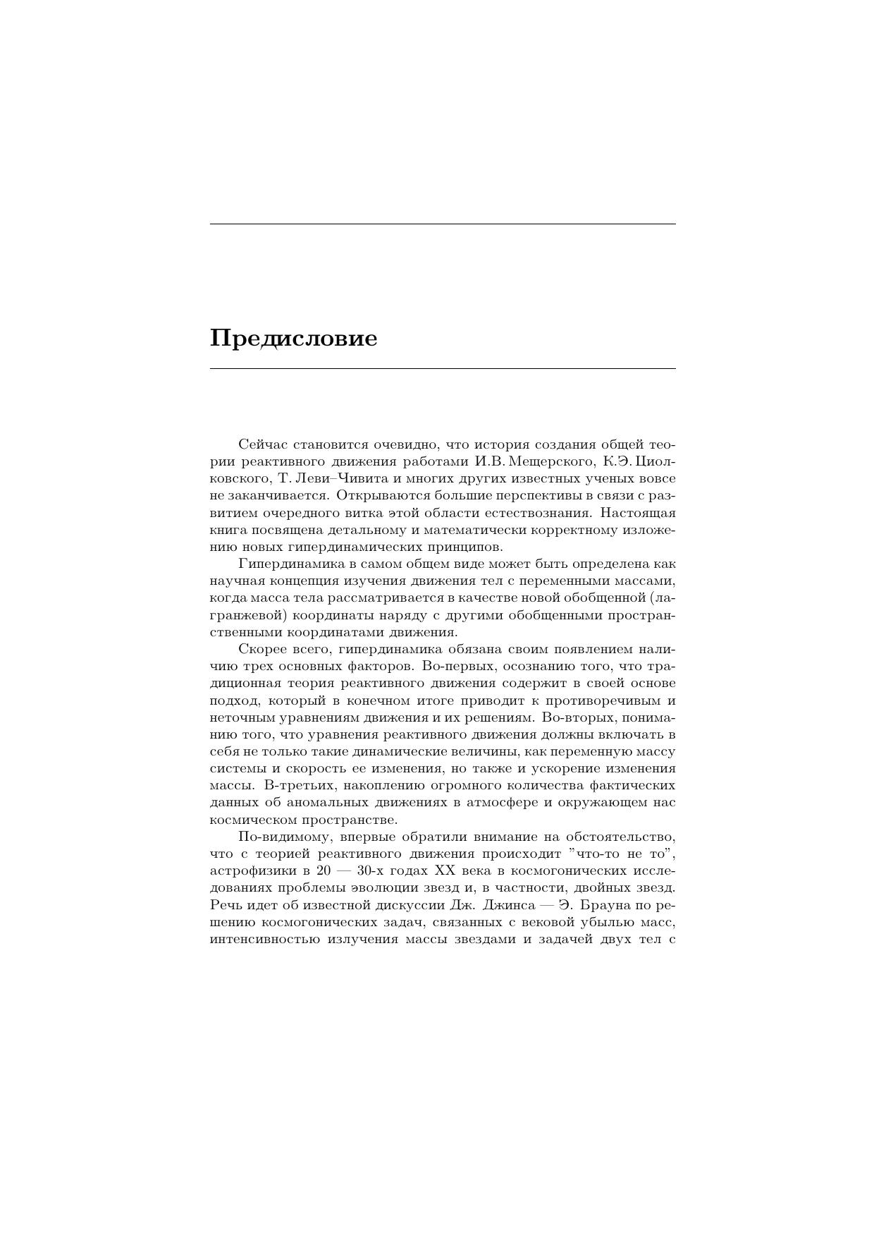 Изложены основы нового научного направления в механике тел переменной массы, связанного с понятием нестационарной реактивности и получившего в настоящее время название гиперреактивной механики. С помощью дифференциального принципа полноты найдены уравнения гиперреактивного движения, главной особенностью которых является присутствие величин, зависящих от ускорения изменения массы системы. Основное внимание уделено анализу свойств рассматриваемых явлений, их точному математическому описанию. С гипердинамической частью книги тесно связана часть, посвященная ядерной электродинамике, в которой исследованы процессы управляемой зарядовой кинетики. Разработана концепция энергетического устройства нового типа — ядерного электрогенератора. Для специалистов в области реактивной механики, космодинамики, ракетостроения, ядерной электродинамики, инженерно-технических работников, аспирантов и студентов