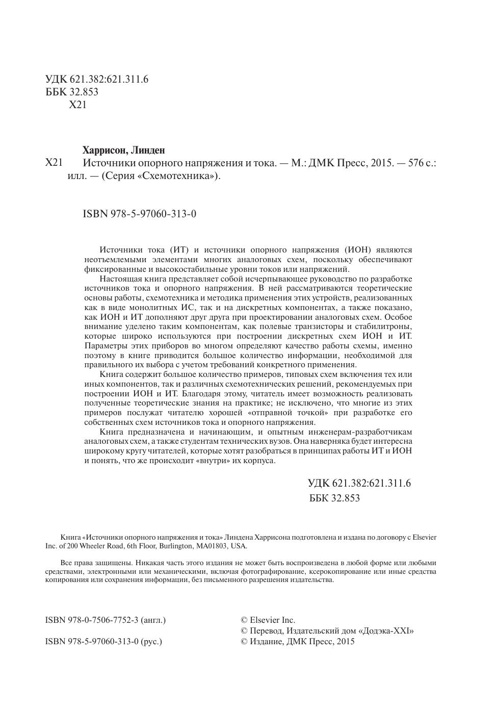 Источники тока (ИТ) и источники опорного напряжения (ИОН) являются неотъемлемыми элементами многих аналоговых схем, поскольку обеспечивают фиксированные и высокостабильные уровни токов или напряжений. Настоящая книга представляет собой исчерпывающее руководство по разработке источников тока и опорного напряжения. В ней рассматриваются теоретические основы работы, схемотехника и методика применения этих устройств, реализованных как в виде монолитных ИС, так и на дискретных компонентах, а также показано, как ИОН и ИТ дополняют друг друга при проектировании аналоговых схем. Особое внимание уделено таким компонентам, как полевые транзисторы и стабилитроны, которые широко используются при построении дискретных схем ИОН и ИТ. Параметры этих приборов во многом определяют качество работы схемы, именно поэтому в книге приводится большое количество информации, необходимой для правильного их выбора с учетом требований конкретного применения. Книга содержит большое количество примеров, типовых схем включения тех или иных компонентов, так и различных схемотехнических решений, рекомендуемых при построении ИОН и ИТ. Благодаря этому, читатель имеет возможность реализовать полученные теоретические знания на практике, не исключено, что многие из этих примеров послужат читателю хорошей «отправной точкой» при разработке его собственных схем источников тока и опорного напряжения. Книга предназначена и начинающим, и опытным инженерам-разработчикам аналоговых схем, а также студентам технических вузов. Она наверняка будет интересна широкому кругу читателей, которые хотят разобраться в принципах работы ИТ и ИОН и понять, что же происходит «внутри» их корпуса.