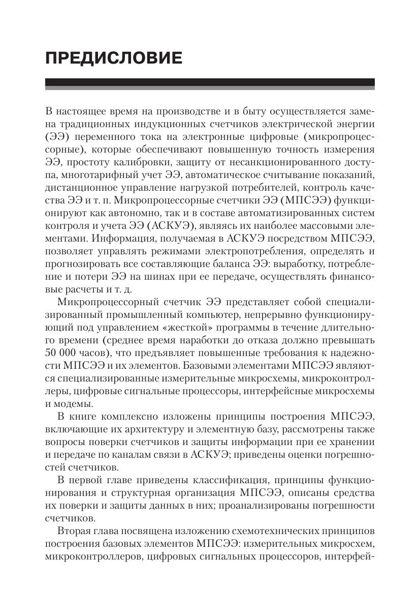 В книге излагаются вопросы построения микропроцессорных (цифровых) счетчиков электрической энергии переменного тока, описываются принципы их функционирования, структурная организация, элементная база, средства поверки и защиты информации в них, приводятся примеры и технические характеристики счетчиков и рассматривается их применение в автоматизированных системах контроля и учета электроэнергии. Книга рассчитана на инженерно-технических работников, связанных с разработкой и эксплуатацией средств микропроцессорной и информационно-измерительной техники и их применением в энергетике и смежных областях, может быть полезна преподавателям, аспирантам, магистрантам и студентам старших курсов вузов соответствующих специальностей.