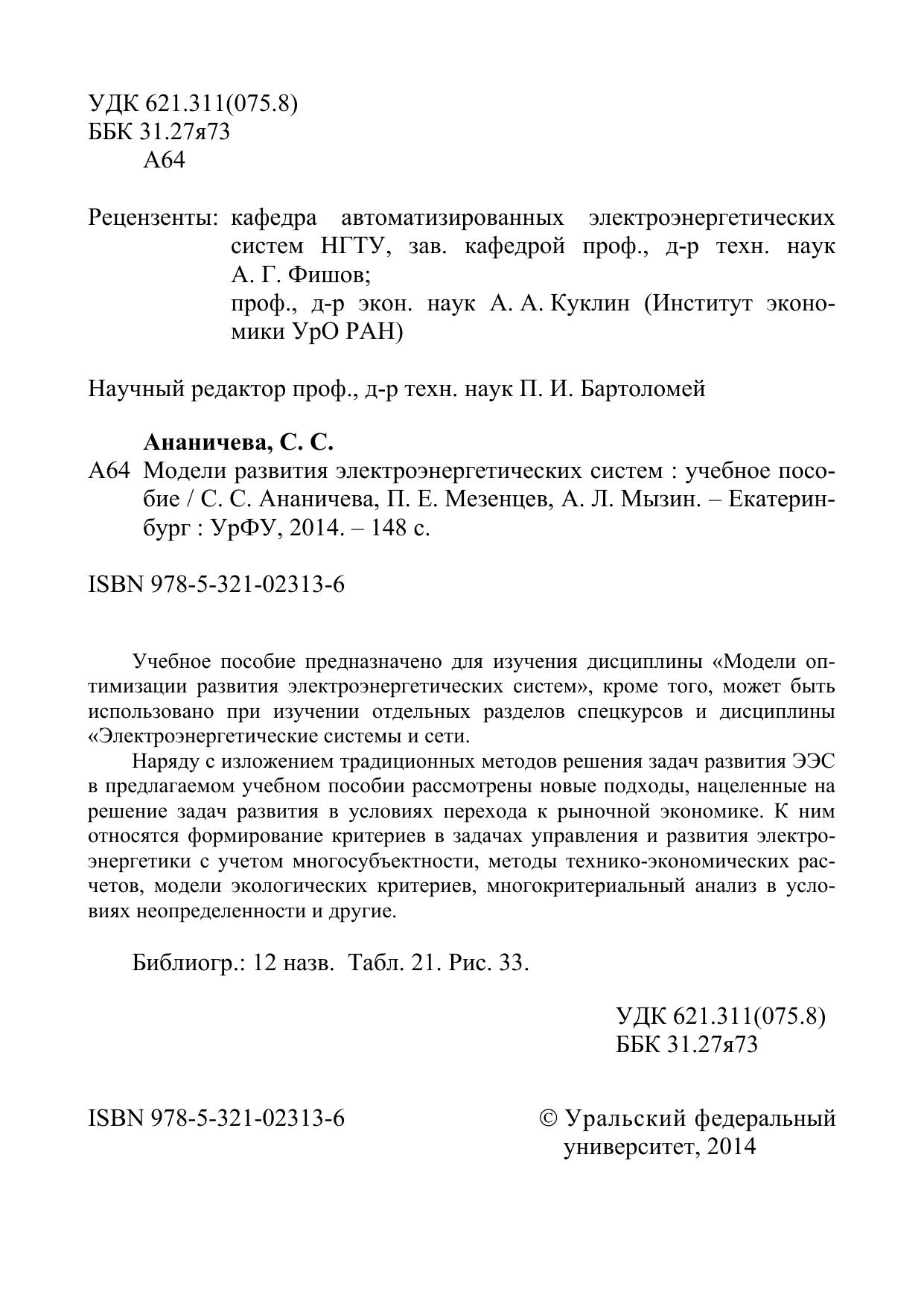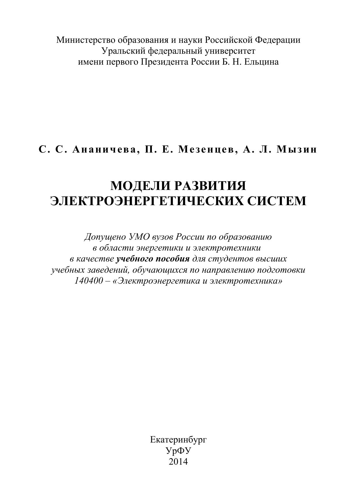 Учебное пособие предназначено для изучения дисциплины «Модели оптимизации развития электроэнергетических систем», кроме того, может быть использовано при изучении отдельных разделов спецкурсов и дисциплины «Электроэнергетические системы и сети. Наряду с изложением традиционных методов решения задач развития ЭЭС в предлагаемом учебном пособии рассмотрены новые подходы, нацеленные на решение задач развития в условиях перехода к рыночной экономике. К ним относятся формирование критериев в задачах управления и развития электро-энергетики с учетом многосубъектности, методы технико-экономических расчетов, модели экологических критериев, многокритериальный анализ в условиях неопределенности и другие.