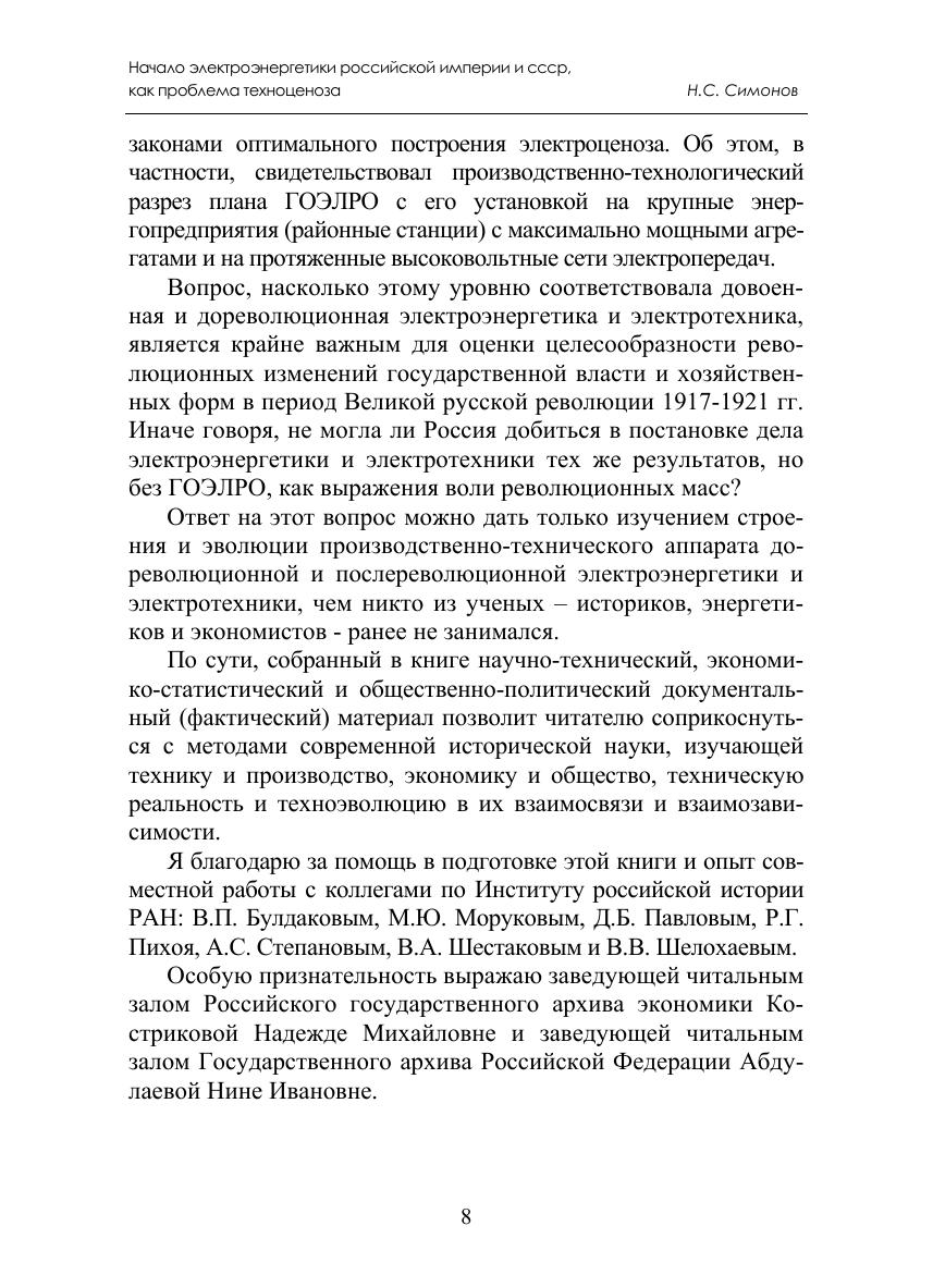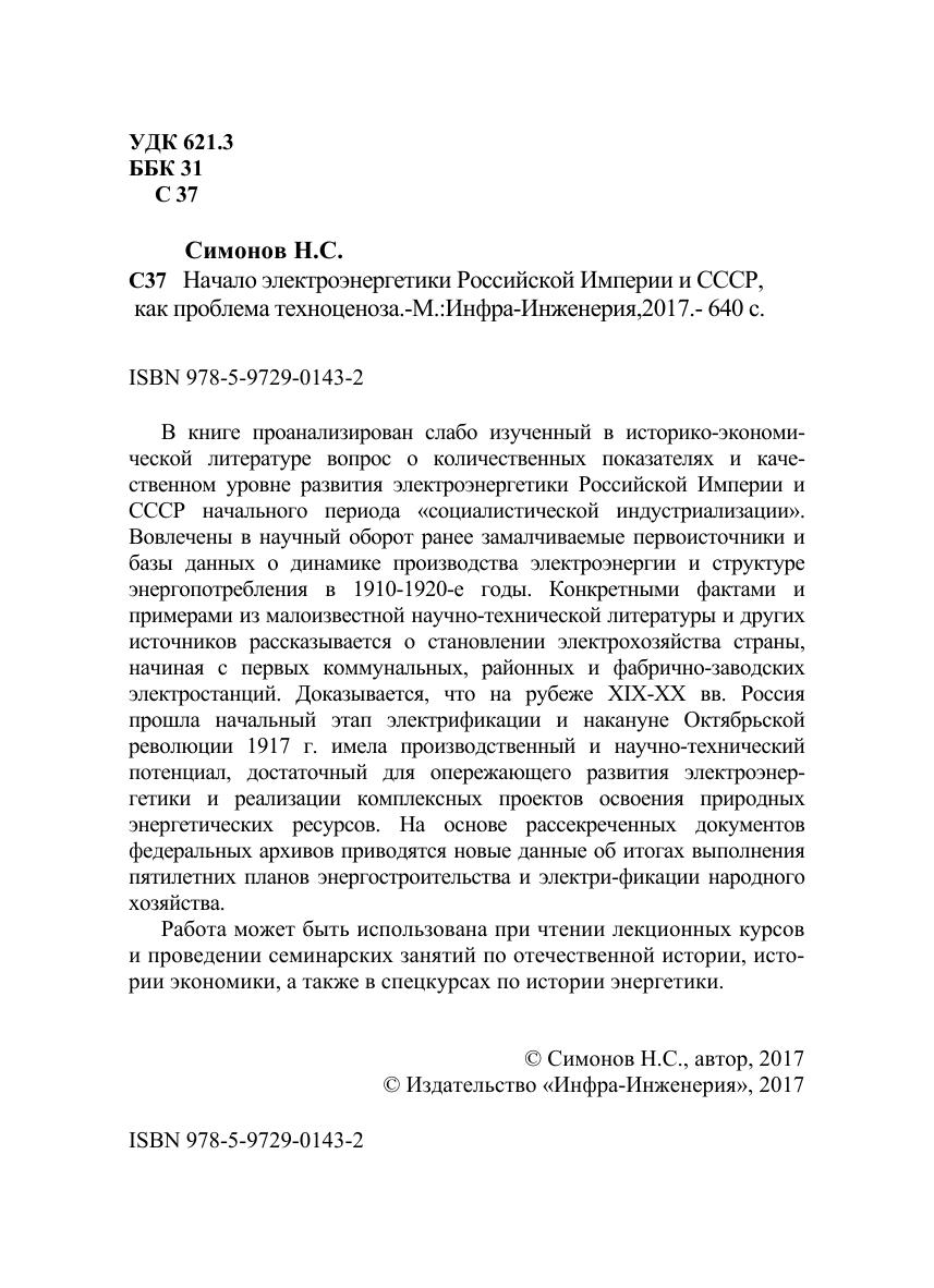 В книге проанализирован слабо изученный в историко-экономической литературе вопрос о количественных показателях и качественном уровне развития электроэнергетики Российской Империи и СССР начального периода «социалистической индустриализации». Вовлечены в научный оборот ранее замалчиваемые первоисточники и базы данных о динамике производства электроэнергии и структуре энергопотребления в 1910-1920-е годы. Конкретными фактами и примерами из малоизвестной научно-технической литературы и других источников рассказывается о становлении электрохозяйства страны, начиная с первых коммунальных, районных и фабрично-заводских электростанций. Доказывается, что на рубеже XIX-XX вв. Россия прошла начальный этап электрификации и накануне Октябрьской революции 1917 г. имела производственный и научно-технический потенциал, достаточный для опережающего развития электроэнергетики и реализации комплексных проектов освоения природных энергетических ресурсов. На основе рассекреченных документов федеральных архивов приводятся новые данные об итогах выполнения пятилетних планов энергостроительства и электрификации народного хозяйства. Работа может быть использована при чтении лекционных курсов и проведении семинарских занятий по отечественной истории, истории экономики, а также в спецкурсах по истории энергетики.