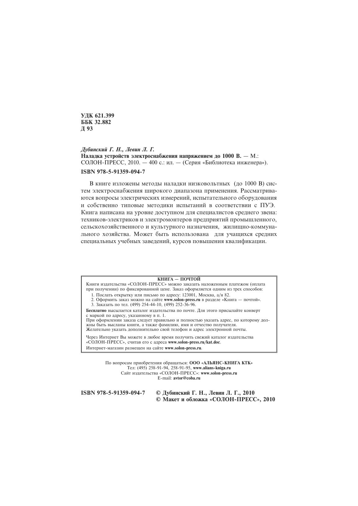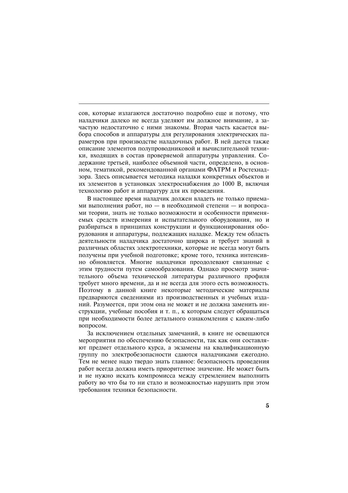 В книге изложены методы наладки низковольтных (до 1000 В) систем электроснабжения широкого диапазона применения. Рассматриваются вопросы электрических измерений, испытательного оборудования и собственно типовые методики испытаний в соответствии с ПУЭ. Книга написана на уровне доступном для специалистов среднего звена: техников-электриков и электромонтеров предприятий промышленного, сельскохозяйственного и культурного назначения, жилищно-коммунального хозяйства. Может быть использована для учащихся средних специальных учебных заведений, курсов повышения квалификации.