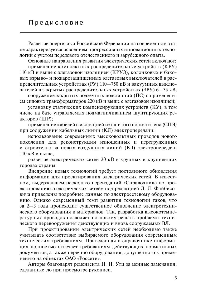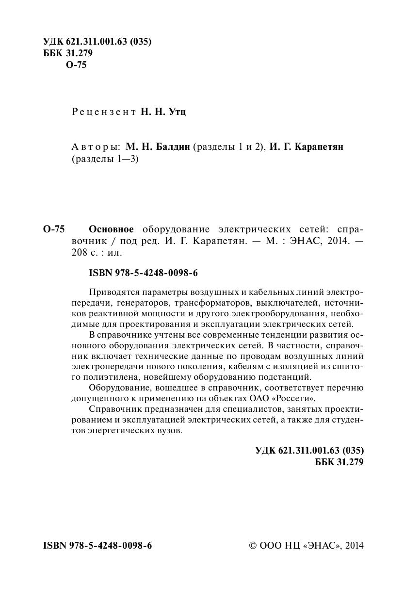 Приводятся параметры воздушных и кабельных линий электропередачи, генераторов, трансформаторов, выключателей, источников реактивной мощности и другого электрооборудования, необходимые для проектирования и эксплуатации электрических сетей. В справочнике учтены все современные тенденции развития основного оборудования электрических сетей. В частности, справочник включает технические данные по проводам воздушных линий электропередачи нового поколения, кабелям с изоляцией из сшитого полиэтилена, новейшему оборудованию подстанций. Оборудование, вошедшее в справочник, соответствует перечню допущенного к применению на объектах ОАО «Россети». Справочник предназначен для специалистов, занятых проектированием и эксплуатацией электрических сетей, а также для студентов энергетических вузов.