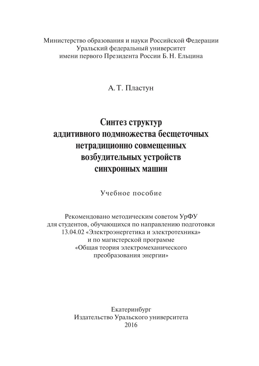 Рассмотрены вопросы синтеза структур аддитивного подмножества бесщеточных совмещенных возбудительных устройств синхронных машин. Разработаны нетрадиционные приемы магнитного, электрического и конструктивного совмещения в одной магнитной системе нескольких электромеханических преобразователей энергии. Разработаны и описаны принципиальные технические решения бесщеточных нетрадиционно совмещенных возбудительных устройств аддитивного и эмерджентного подмножеств синхронных машин и методы их расчета. Приведены основные результаты экспериментального исследования возбудительных устройств аддитивного и эмерджентного подмножеств. Определена область применения бесщеточных совмещенных возбудительных устройств. Приведены фотографии генераторов с бесщеточными нетрадиционно совмещенными возбудительными устройствами. Указаны мощности разработанных устройств и страны, в которых они работают. Пособие предназначено для студентов, обучающихся по направлению 13.04.02 «Электроэнергетика и электротехника» и по магистерской программе «Общая теория электромеханического преобразования энергии» при изучении дисциплин «Современные проблемы науки и техники (раздел — электромеханика)», «Системы возбуждения синхронных машин», «Электромеханические устройства с нетрадиционными методами формирования электромагнитных полей». Пособие будет полезно аспирантам и специалистам, занимающимся разработкой и проектированием бесщеточных нетрадиционно совмещенных возбудительных устройств.