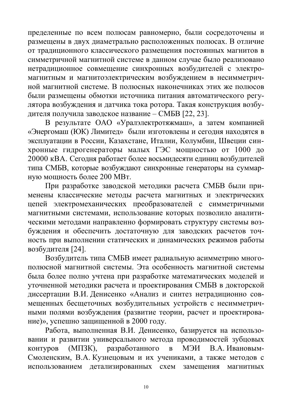 Рассмотрены основы теории и расчета совмещенных бесщеточных возбудительных устройств нового поколения, в которых использовано нетрадиционное конструктивное, магнитное и электрическое совмещение в одной машине нескольких электромеханических преобразователей. Впервые даются основы проектирования таких возбудительных устройств, доведенных до сравнительно простых алгоритмов и методов расчета характеристик. Рекомендовано студентам бакалавриата, обучающимся по профилю «Электромеханика», при изучении дисциплин «Учебно-исследовательская работа студентов», «Научно-исследовательская работа студентов», «Современные проблемы электромеханики», для дипломного проектирования, а также студентам магистратуры по программе «Общие вопросы электромеханического преобразования энергии» при изучении дисциплин «Современные проблемы науки и техники (электромеханика)», «Системы возбуждения синхронных машин», для научно-исследовательской практики, при подготовке магистерских диссертаций. Пособие будет полезно специалистам, занимающимся разработкой и проектированием бесщеточных возбудительных устройств.