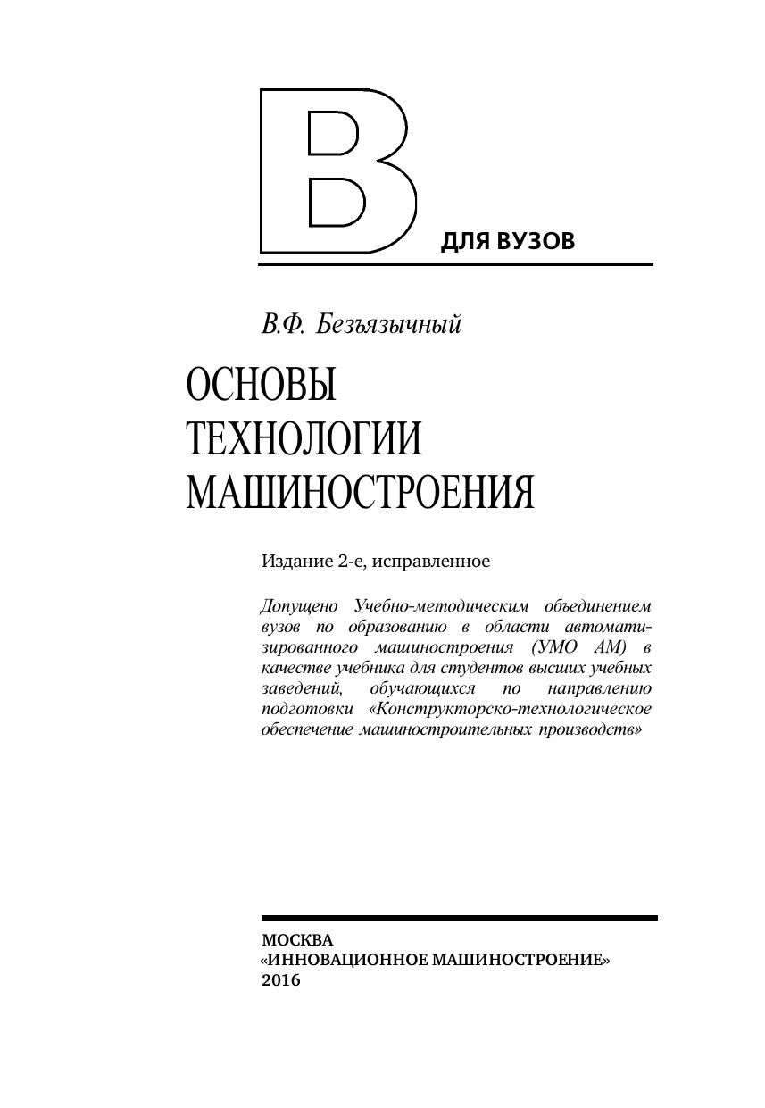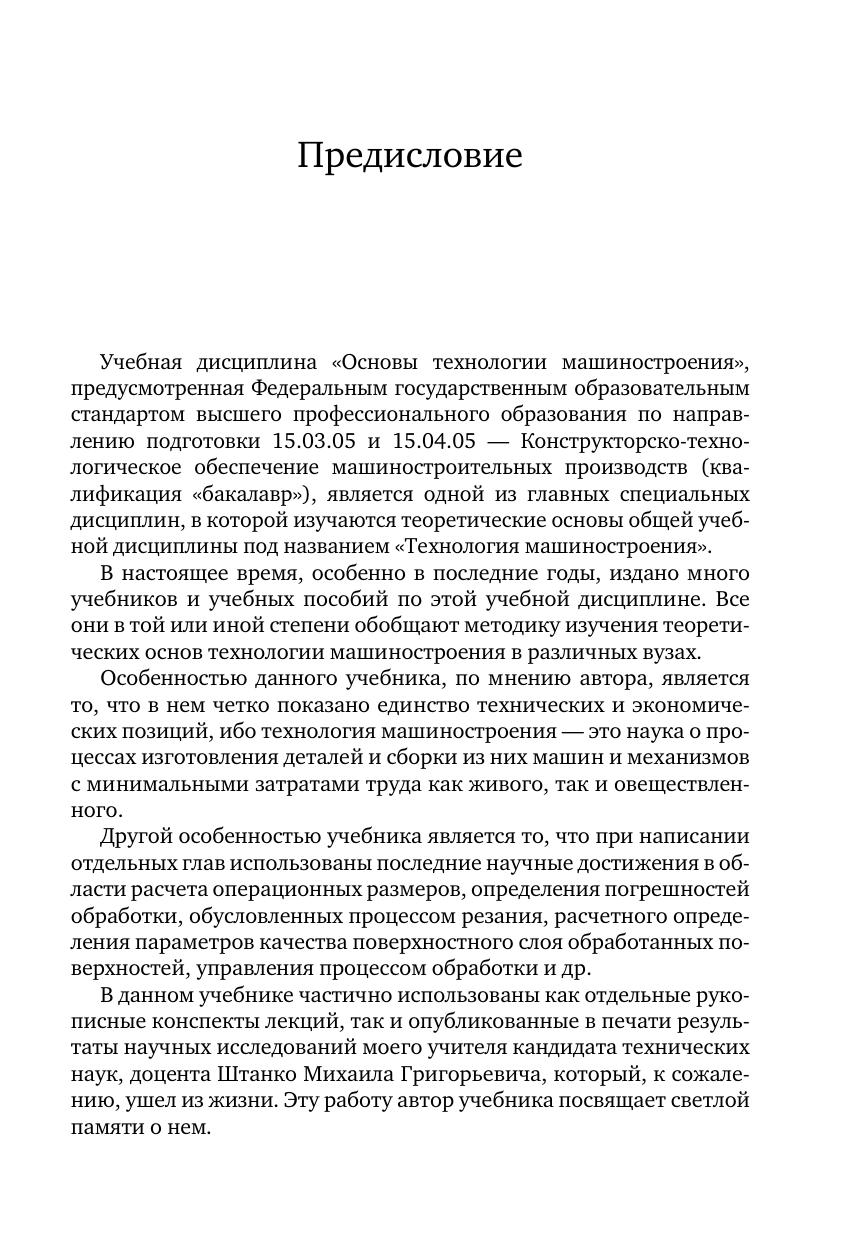 Изложены основы технологии машиностроения в соответствии с программой учебного курса. Даны основные понятия и положения, основы базирования, основы проектирования технологических процессов, общие принципы обработки деталей, причины возникновения погрешностей при механической обработке. Приведены расчет режимов резания, методика выбора способа обработки деталей, основы технического нормирования, пути повышения производительности станочных операций. Показана последовательность проектирования технологических процессов сборки. Для студентов вузов, обучающихся по направлению подготовки бакалавров и магистров «Конструкторско-технологическое обеспечение машиностроительных производств» и «Проектирование технологических комплексов машиностроительных производств».