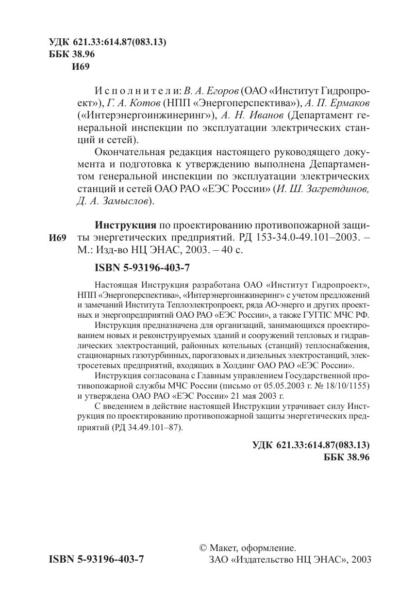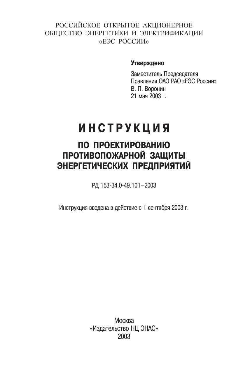 Настоящая Инструкция разработана ОАО «Институт Гидропроект». НИИ «Энергоперспектива», «Интерэнергоинжинеринг» с учетом предложений и замечаний Института Теплоэлектропроект, ряда АО-энерго и других проектных и энергопредприятий ОАО РАО «ЕЭС России», а также ГУГИС МЧС РФ. Инструкция предназначена для организаций, занимающихся проектированием новых и реконструируемых зданий и сооружений тепловых и гидравлических электростанций, районных котельных (станций) теплоснабжения, стационарных газотурбинных, парогазовых и дизельных электростанций, электросетевых предприятий, входящих в Холдинг ОАО РАО «ЕЭС России».