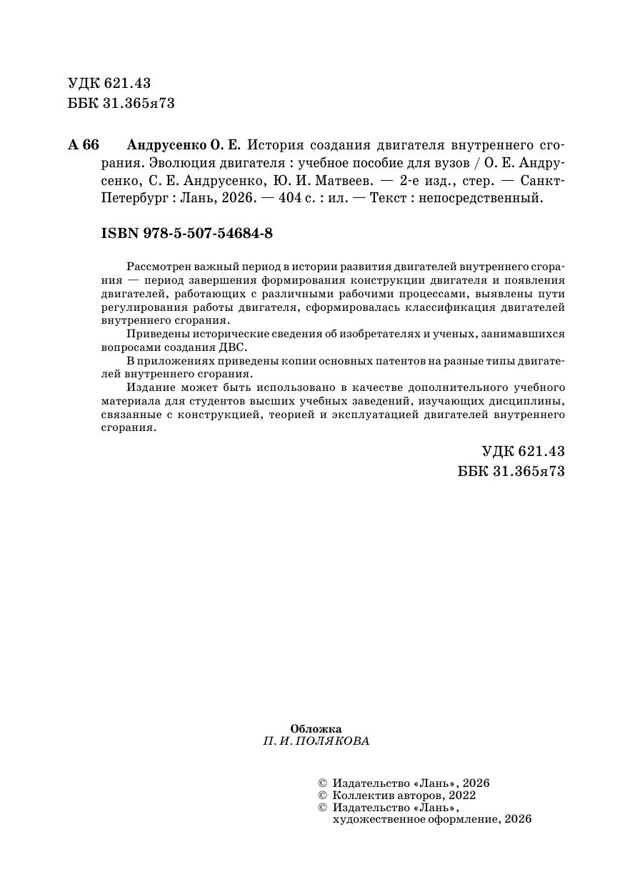 Рассмотрен важный период в истории развития двигателей внутреннего сгорания — период завершения формирования конструкции двигателя и появления двигателей, работающих с различными рабочими процессами, выявлены пути регулирования работы двигателя, сформировалась классификация двигателей внутреннего сгорания. Приведены исторические сведения об изобретателях и ученых, занимавшихся вопросами создания ДВС. В приложениях приведены копии основных патентов на разные типы двигателей внутреннего сгорания. Издание может быть использовано в качестве дополнительного учебного материала для студентов высших учебных заведений, изучающих дисциплины, связанные с конструкцией, теорией и эксплуатацией двигателей внутреннего сгорания.