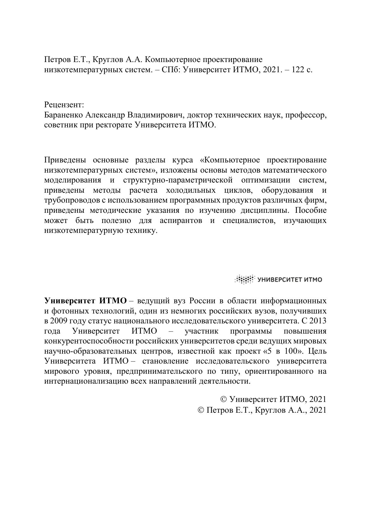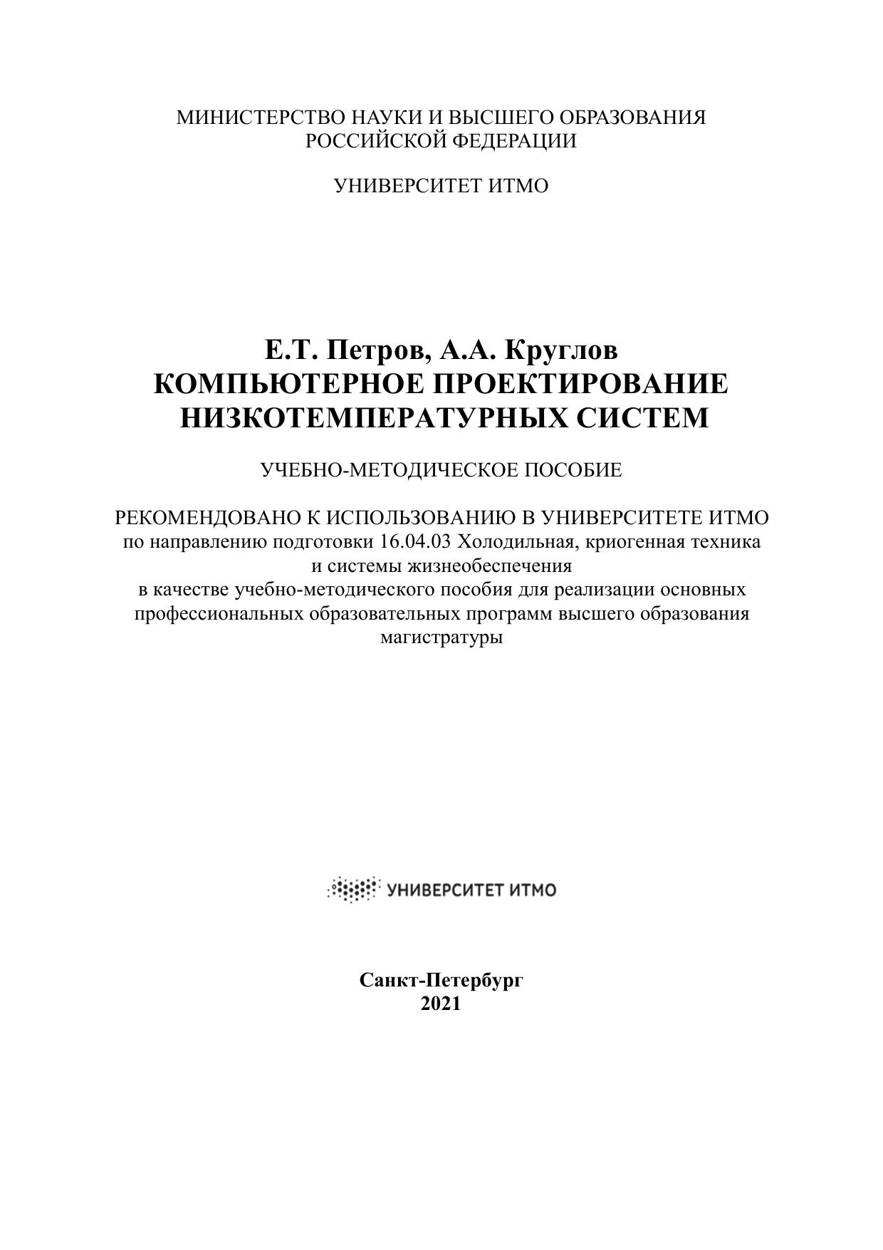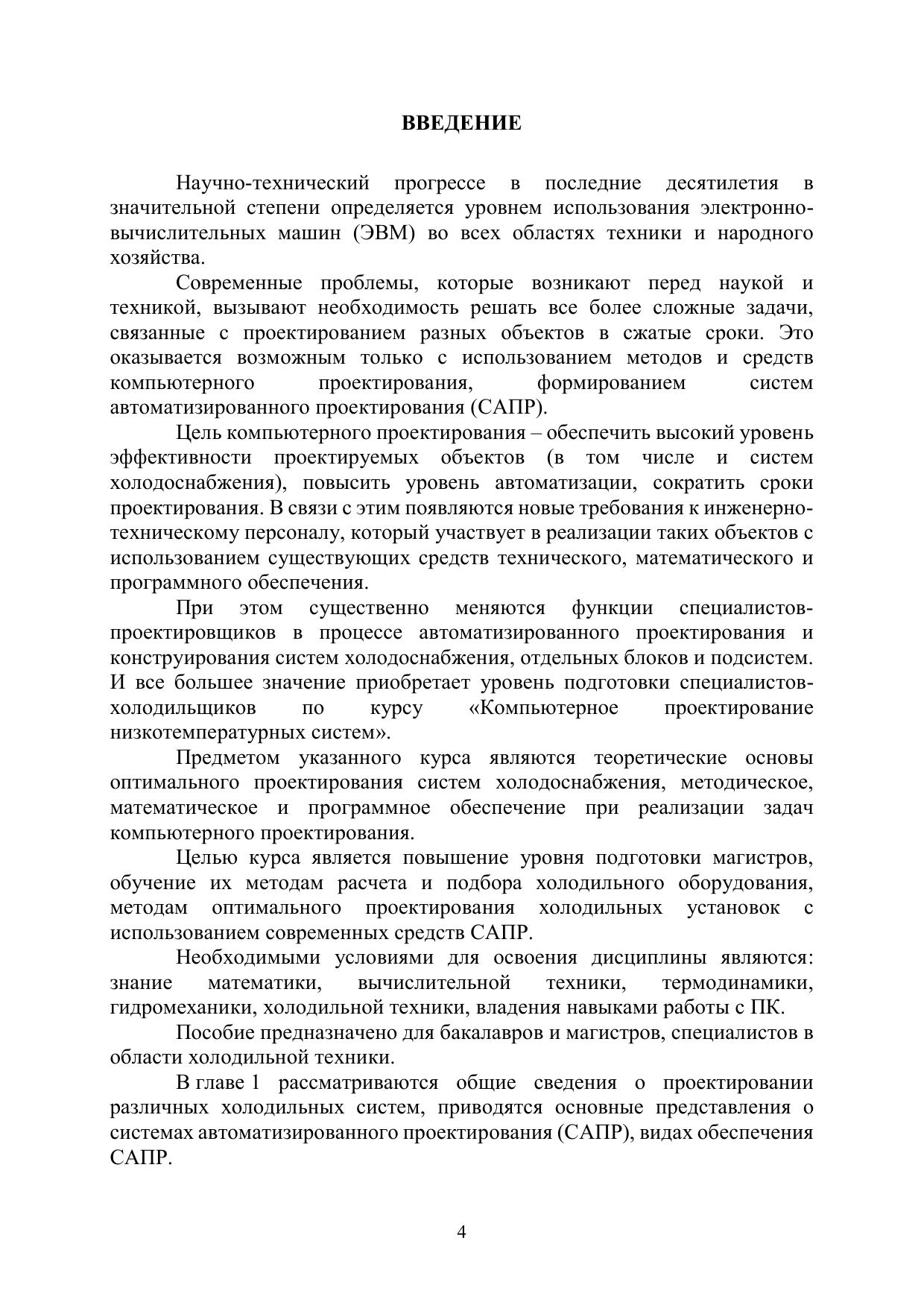 Приведены основные разделы курса «Компьютерное проектирование низкотемпературных систем», изложены основы методов математического моделирования и структурно-параметрической оптимизации систем, приведены методы расчета холодильных циклов, оборудования и трубопроводов с использованием программных продуктов различных фирм, приведены методические указания по изучению дисциплины. Пособие может быть полезно для аспирантов и специалистов, изучающих