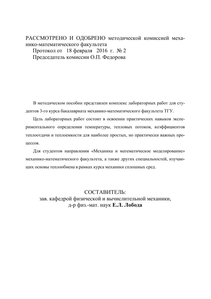 В методическом пособии представлен комплекс лабораторных работ для студентов 3-го курса бакалавриата механико-математического факультета ТГУ. Цель лабораторных работ состоит в освоении практических навыков экспериментального определения температуры, тепловых потоков, коэффициентов теплоотдачи и теплоемкости для наиболее простых, но практически важных про- цессов. Для студентов направления «Механика и математическое моделирование» механико-математического факультета, а также других специальностей, изучающих основы теплообмена в рамках курса механики сплошных сред.