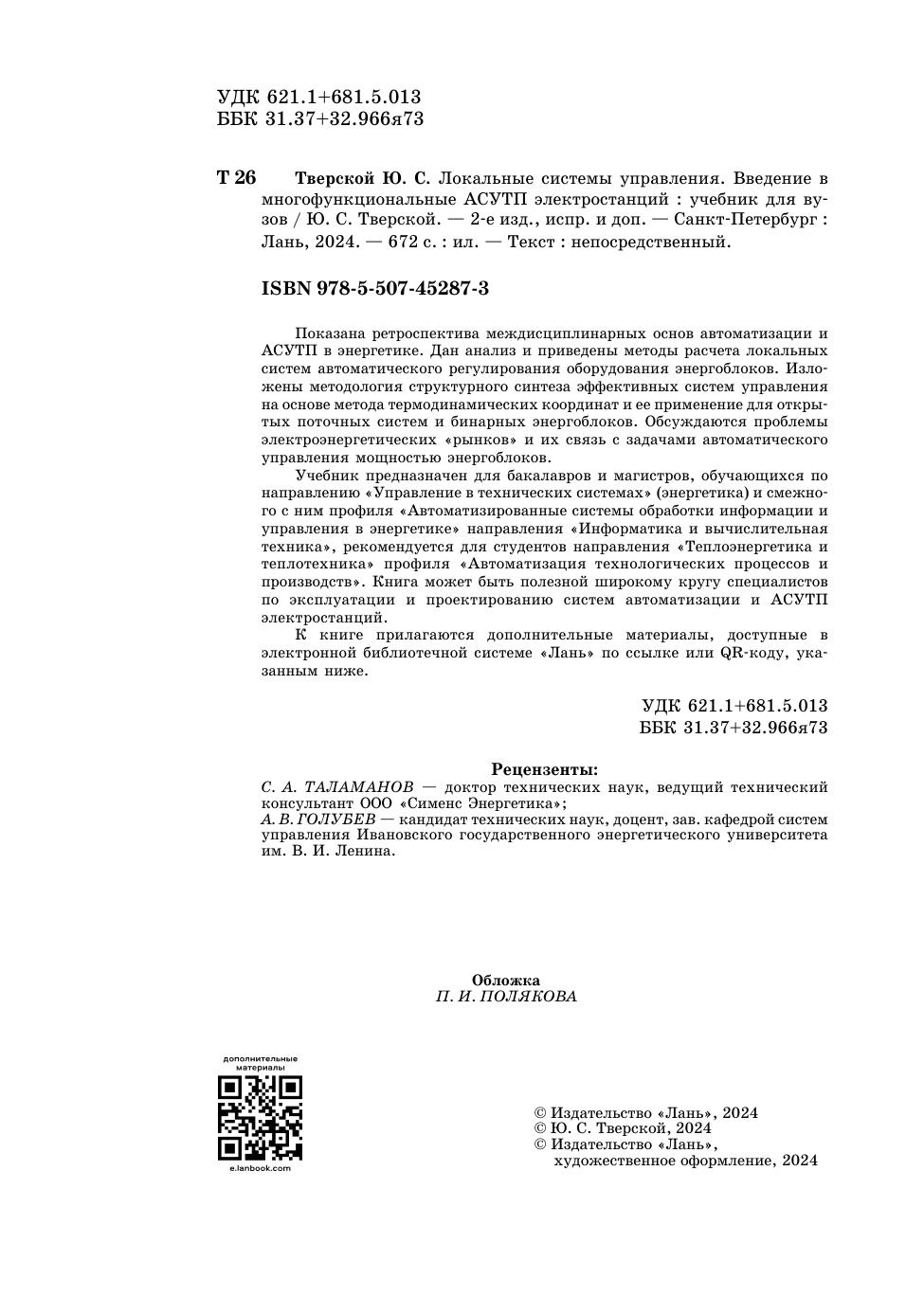 Показана ретроспектива междисциплинарных основ автоматизации и АСУТП в энергетике. Дан анализ и приведены методы расчета локальных систем автоматического регулирования оборудования энергоблоков. Изложены методология структурного синтеза эффективных систем управления на основе метода термодинамических координат и ее применение для открытых поточных систем и бинарных энергоблоков. Обсуждаются проблемы электроэнергетических «рынков» и их связь с задачами автоматического управления мощностью энергоблоков. Учебник предназначен для бакалавров и магистров, обучающихся по направлению «Управление в технических системах» (энергетика) и смежного с ним профиля «Автоматизированные системы обработки информации и управления в энергетике» направления «Информатика и вычислительная техника», рекомендуется для студентов направления «Теплоэнергетика и теплотехника» профиля «Автоматизация технологических процессов и производств». Книга может быть полезной широкому кругу специалистов по эксплуатации и проектированию систем автоматизации и АСУТП электростанций. К книге прилагаются дополнительные материалы, доступные в электронной библиотечной системе «Лань» по ссылке или QR-коду, указанным ниже.